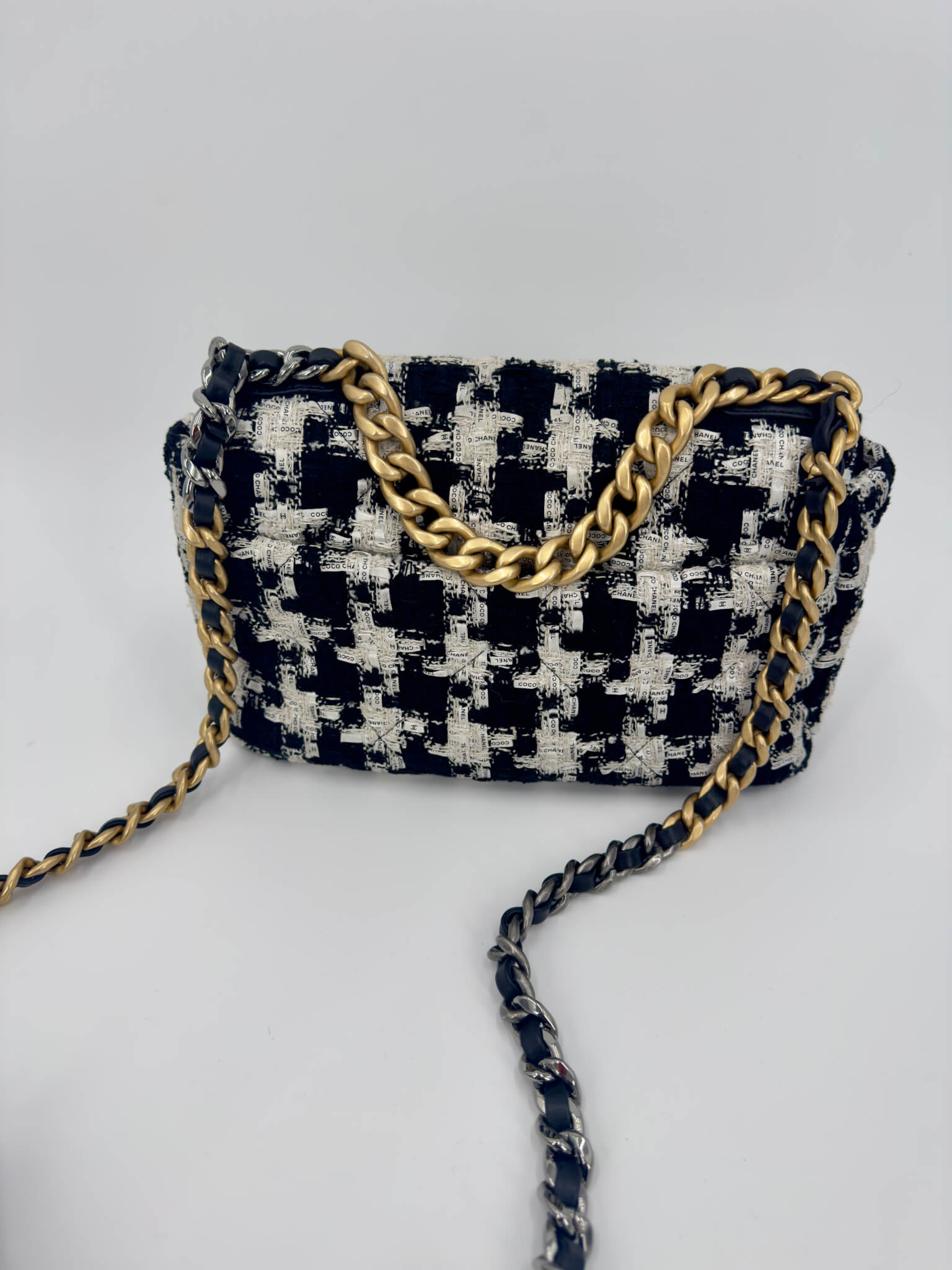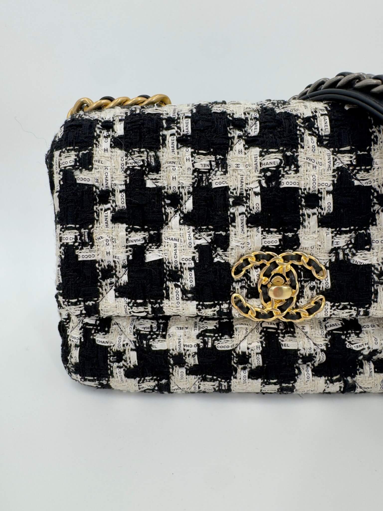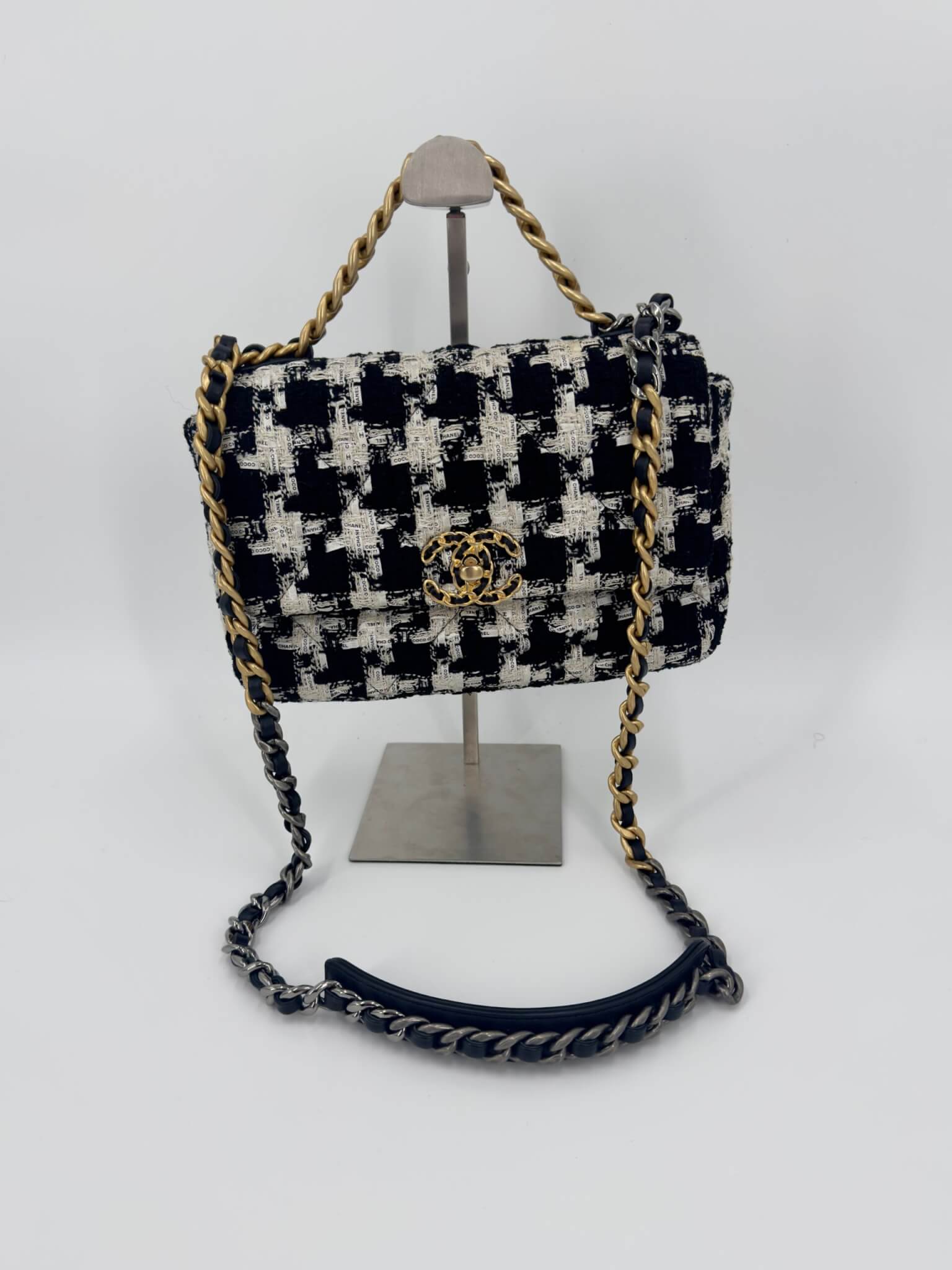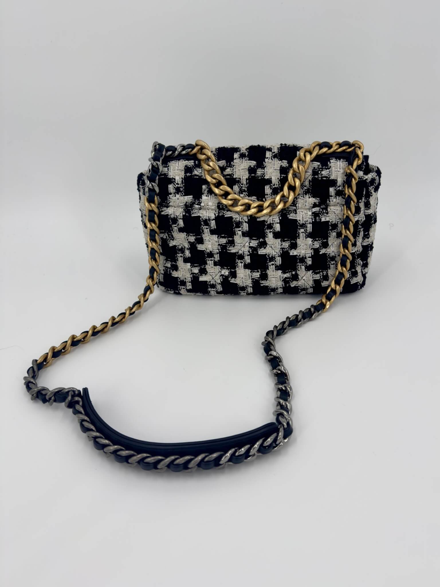 Sac Chanel 19 en tweed noir et blanc, modèle iconique à l’élégance intemporelle.