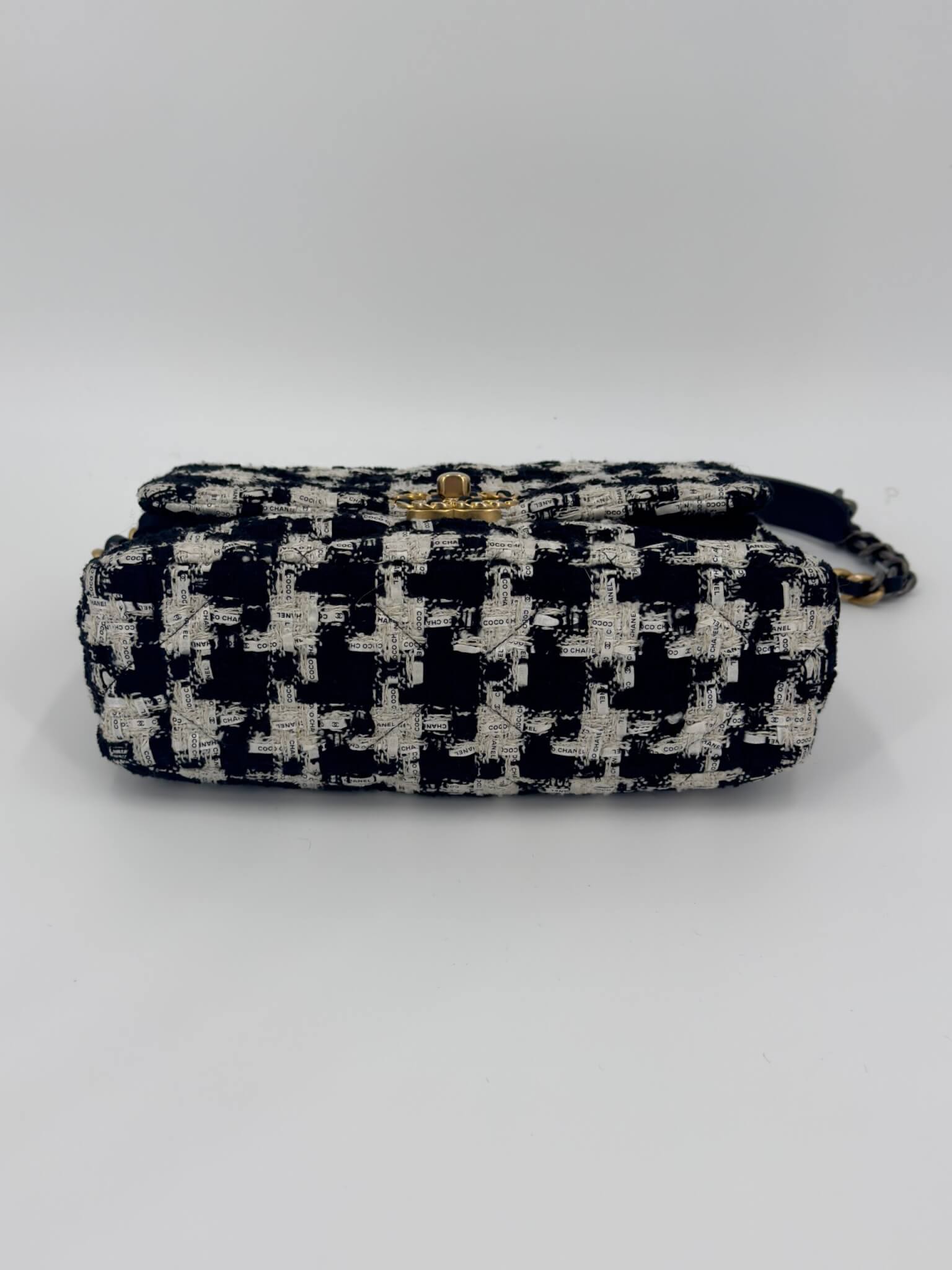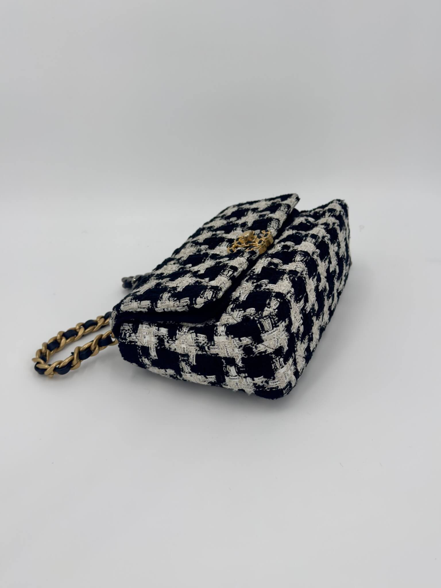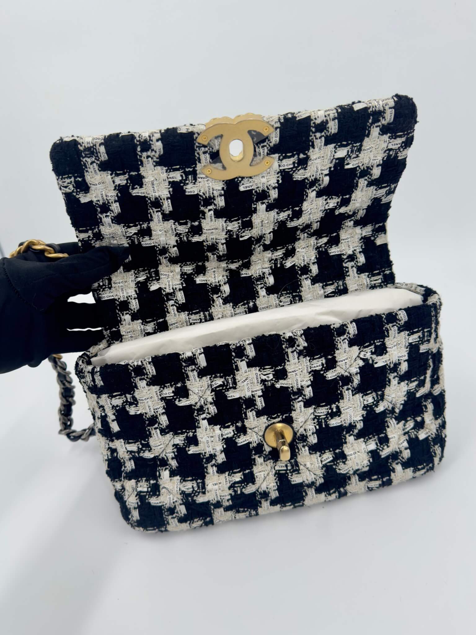 Sac Chanel 19 en tweed noir et blanc, modèle iconique à l’élégance intemporelle.