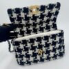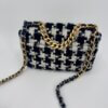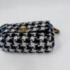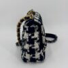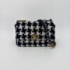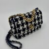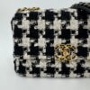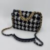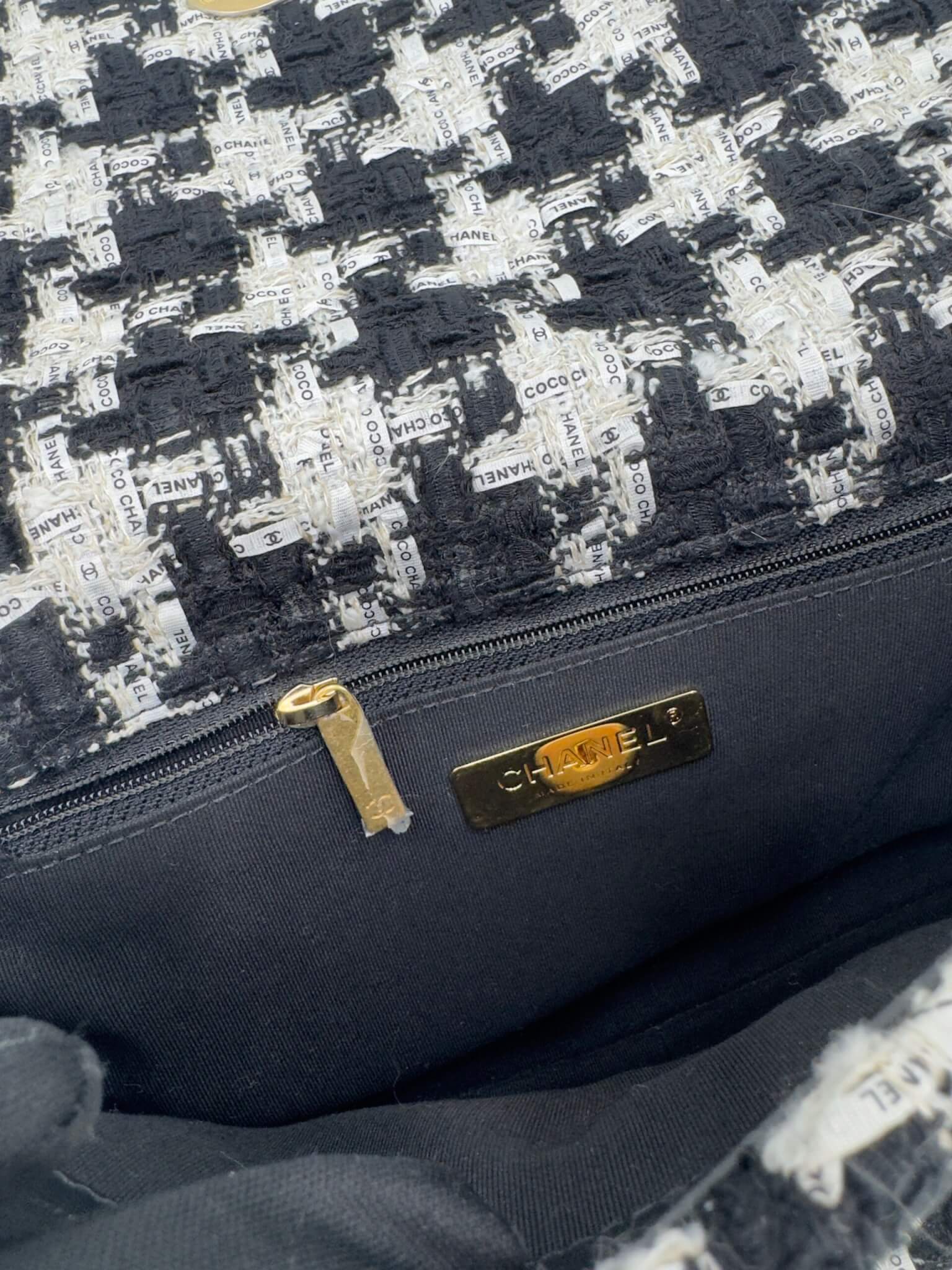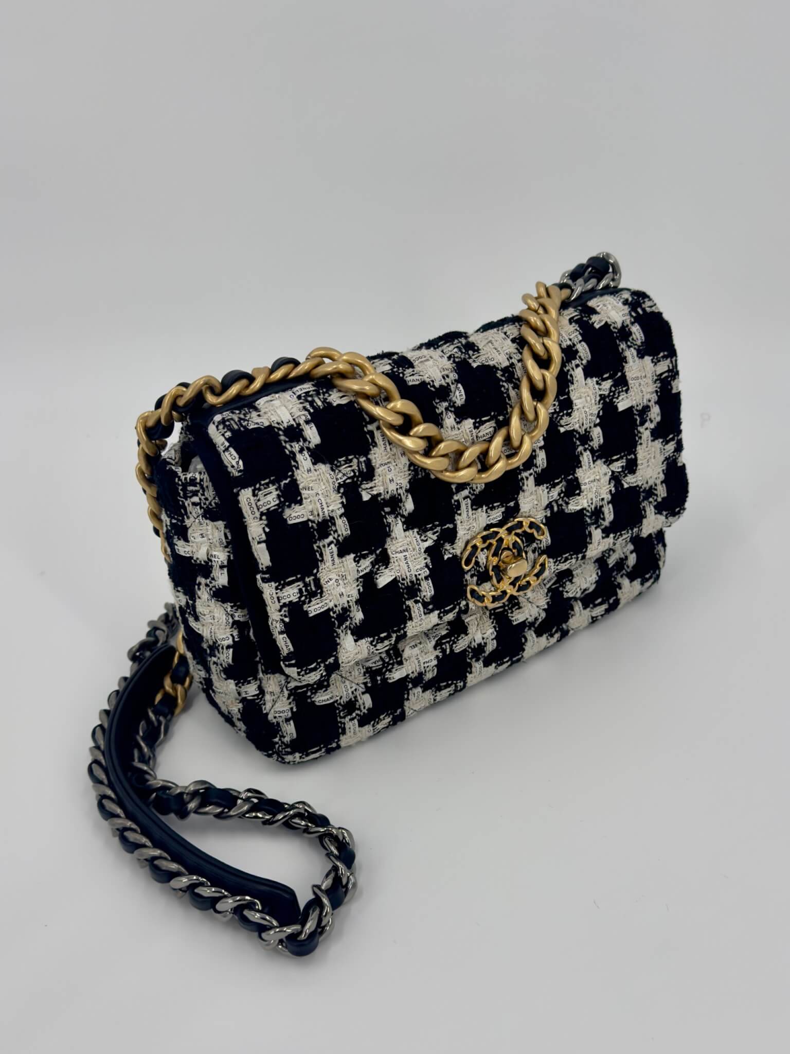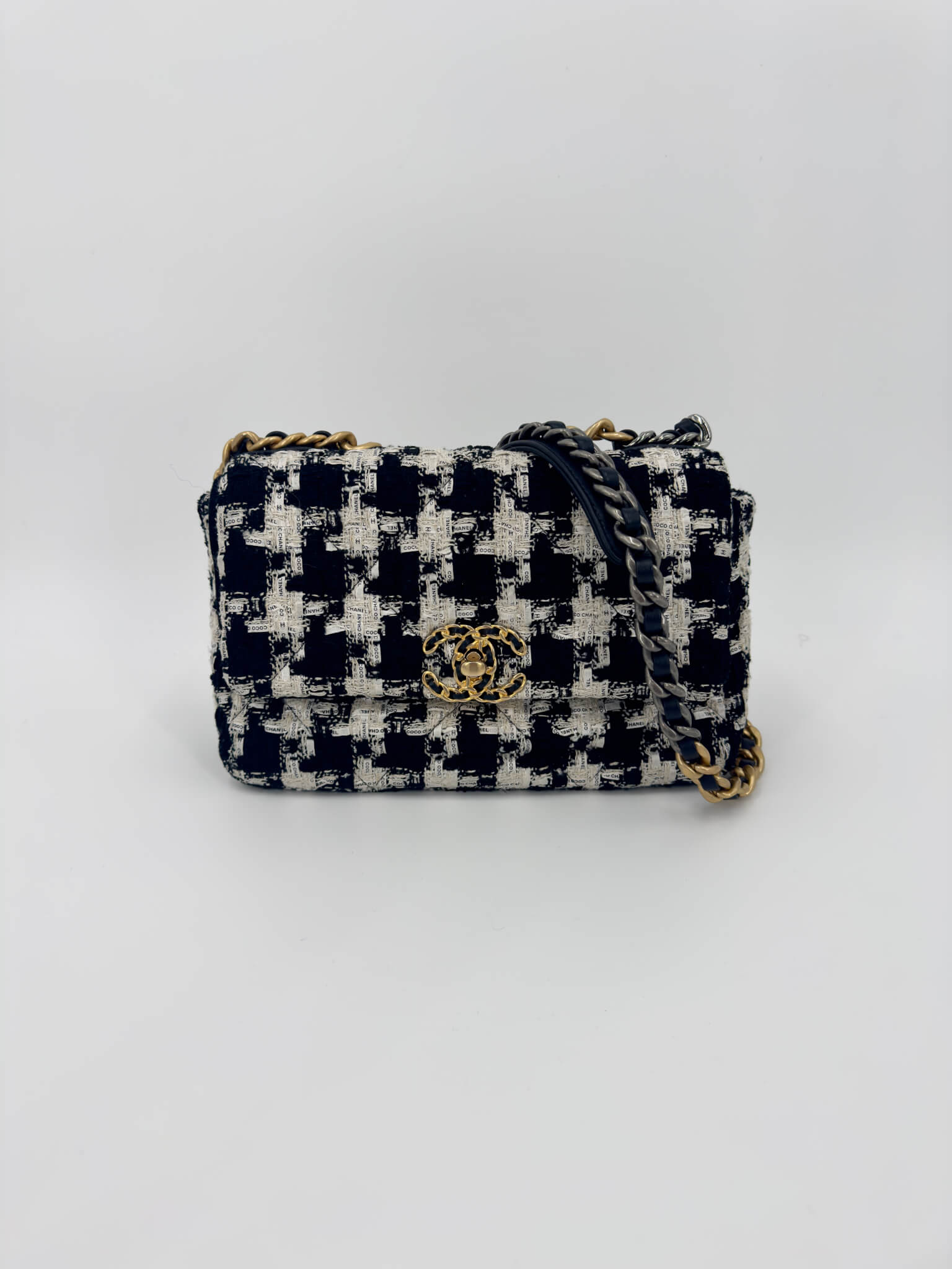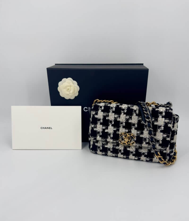 Sac Chanel 19 en tweed noir et blanc, modèle iconique à l’élégance intemporelle.