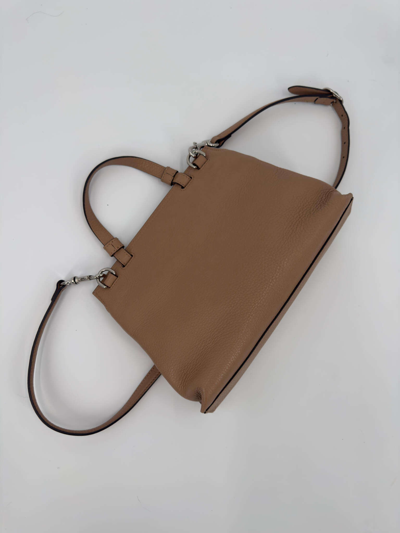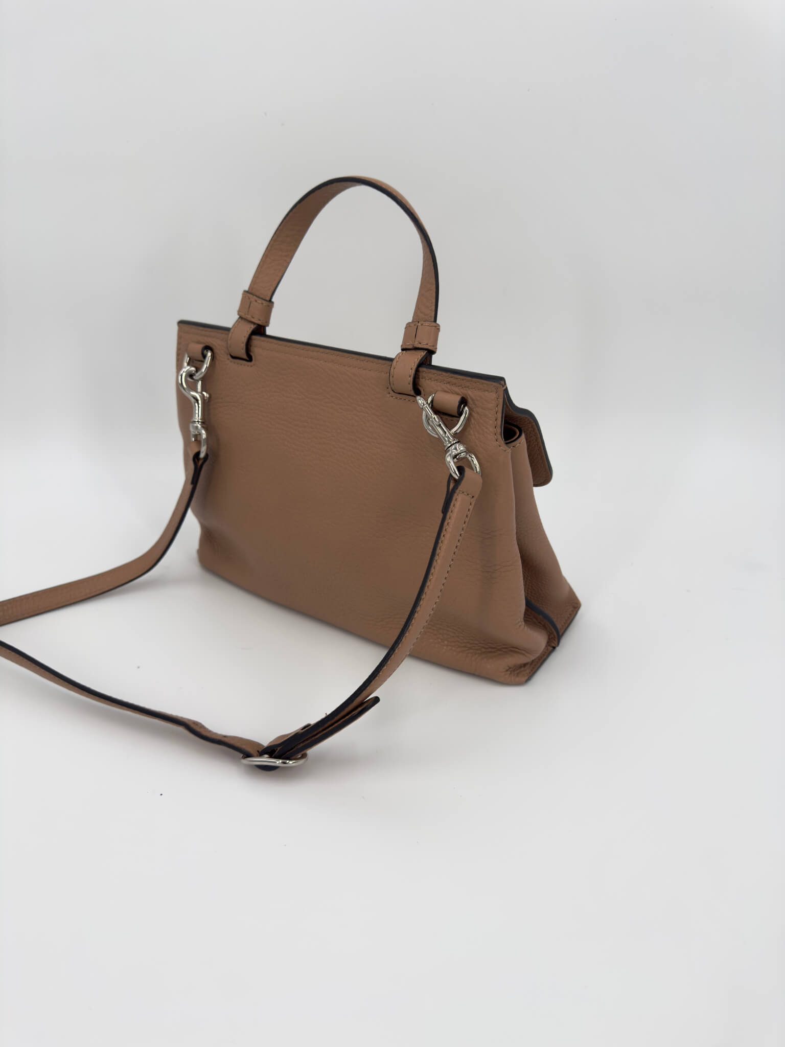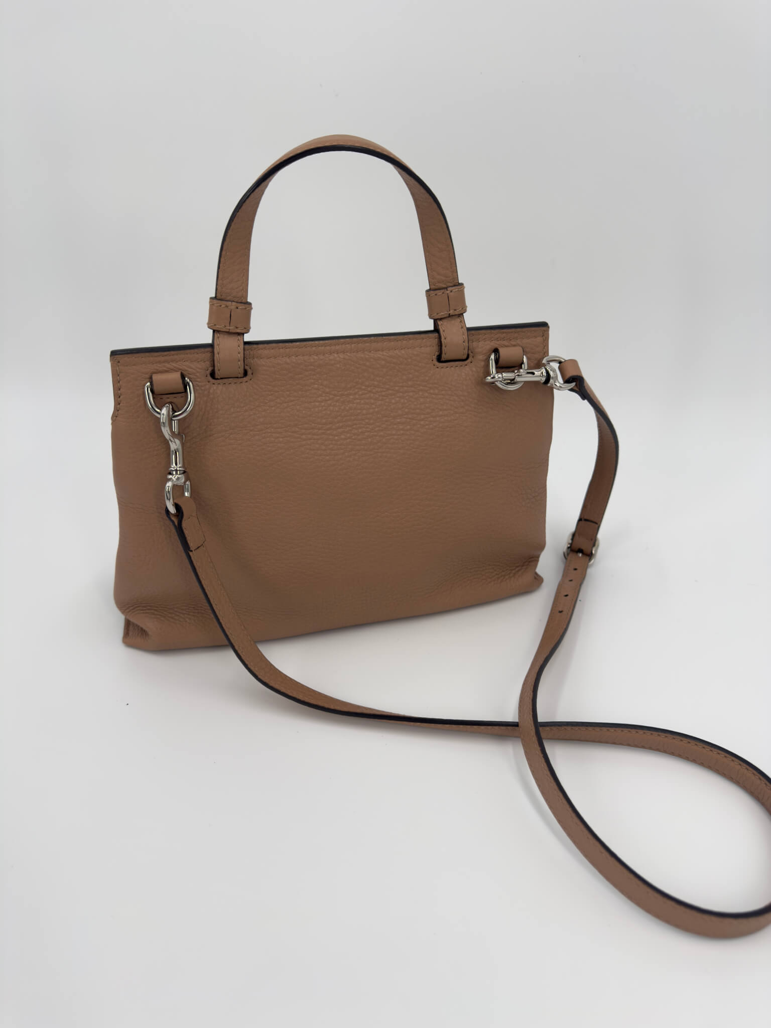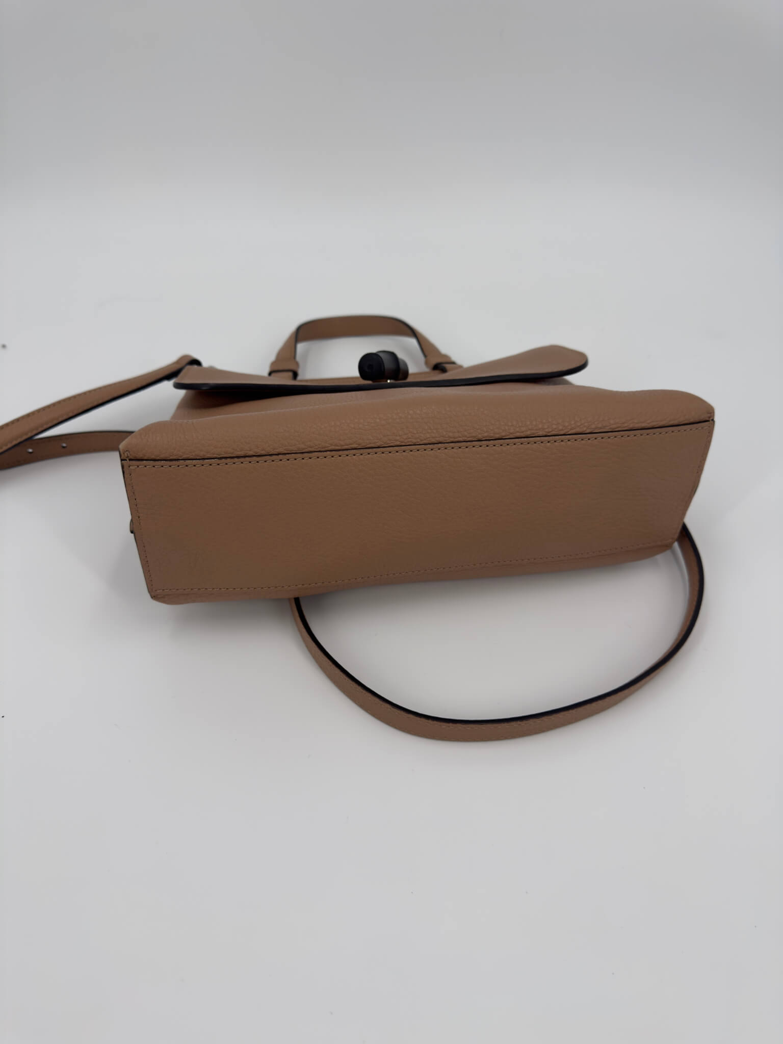 Structure souple en cuir en excellent état, doté d’une anse plate pour un porté main et d’une bandoulière cuir amovible pour un porté épaule ou croisé.