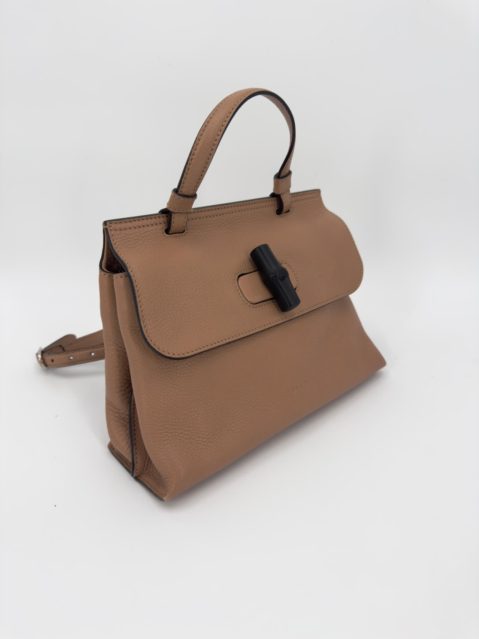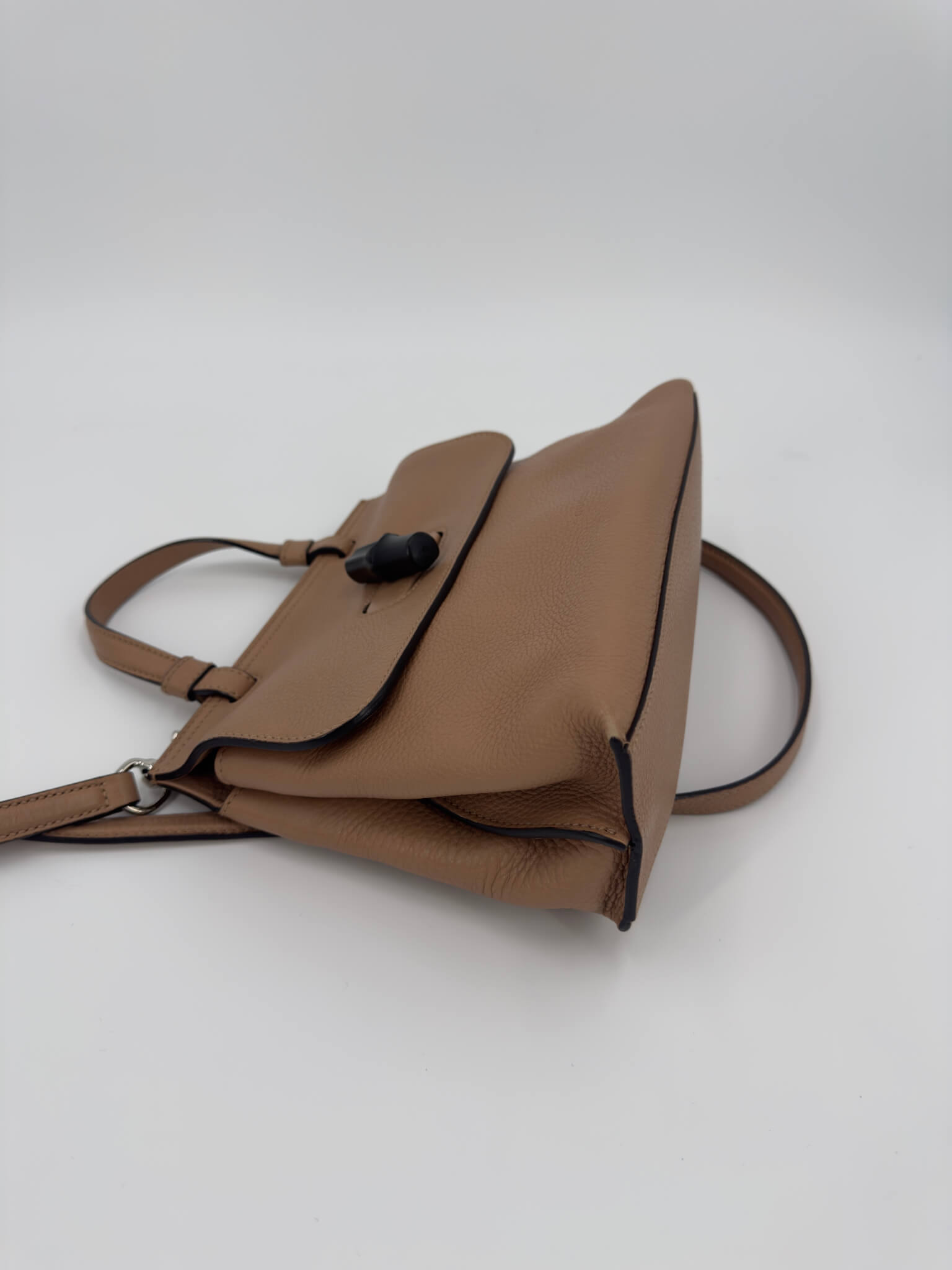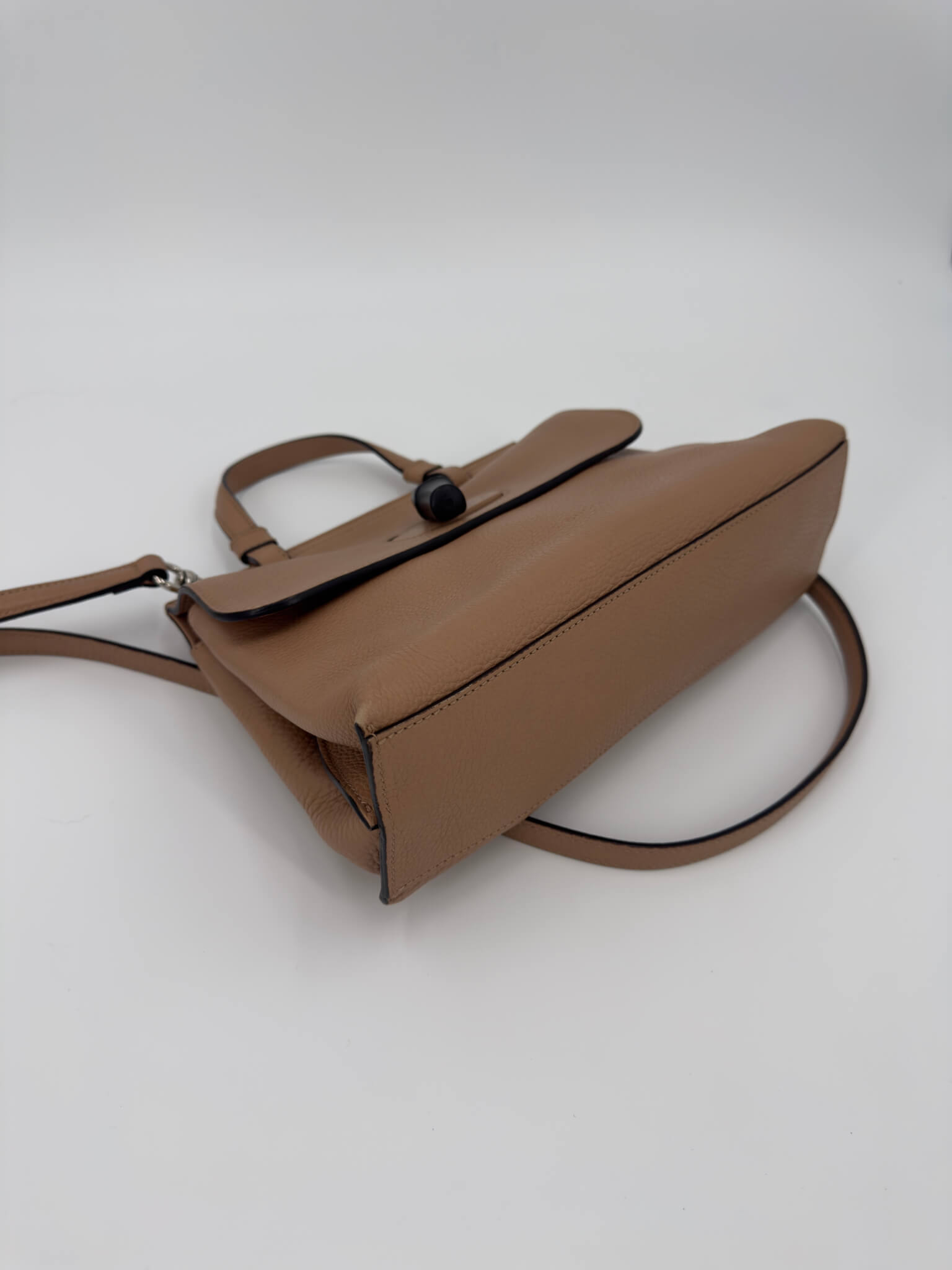 Rabat avec fermoir bambou iconique, intérieur zippé avec poches plaquées.