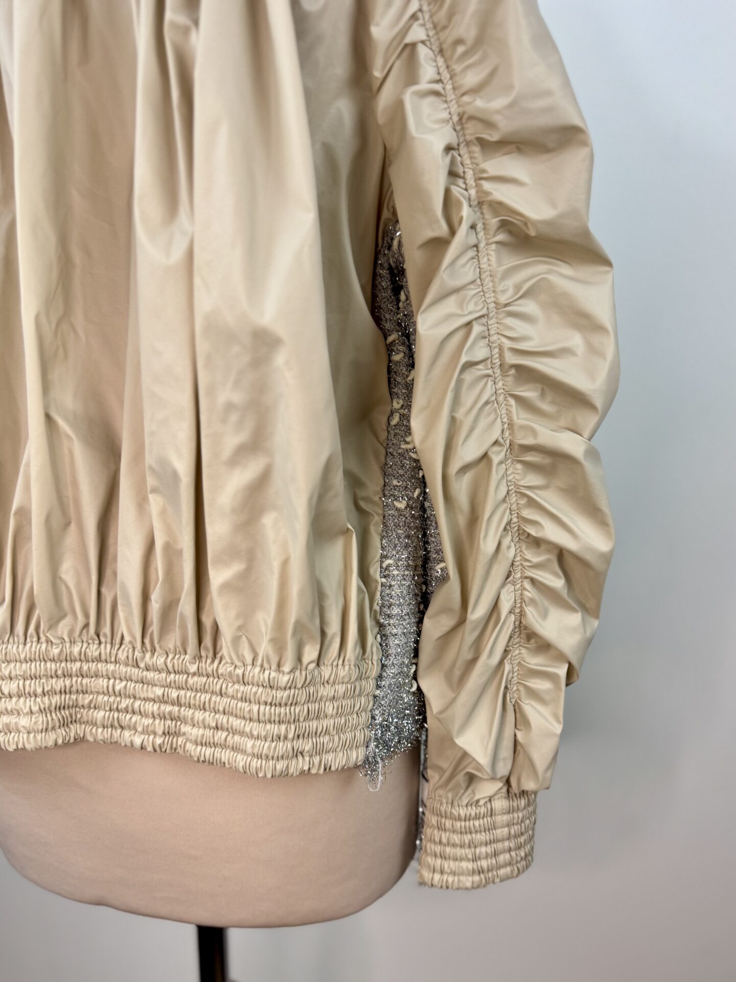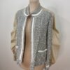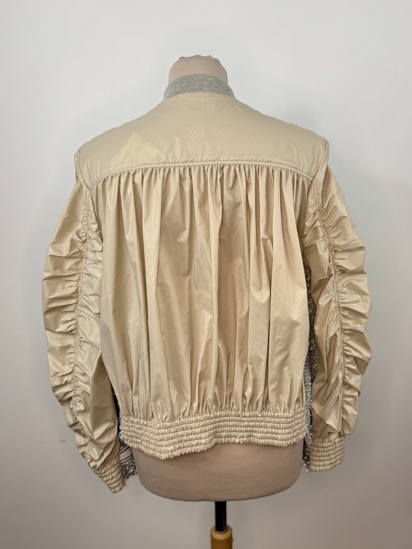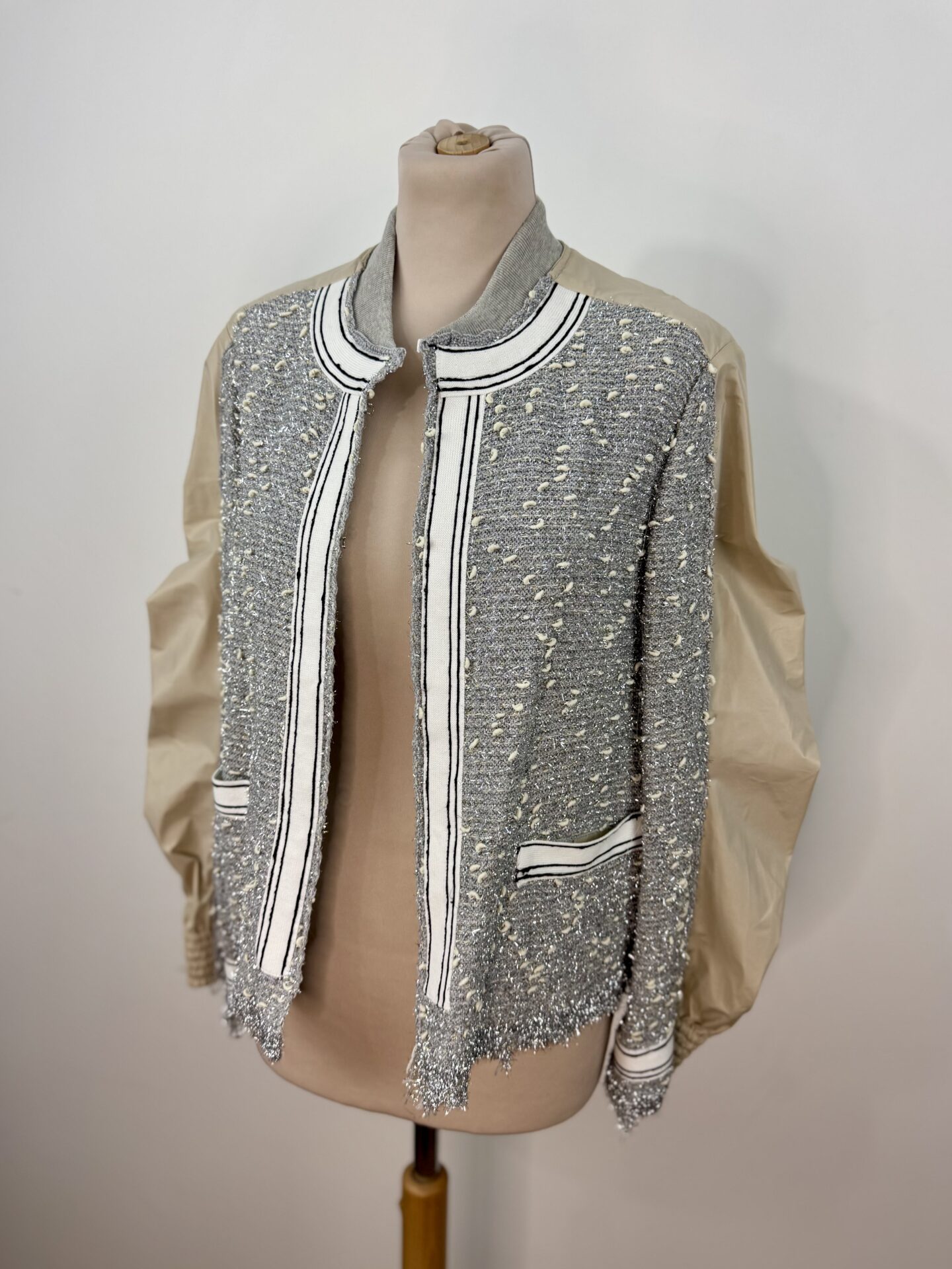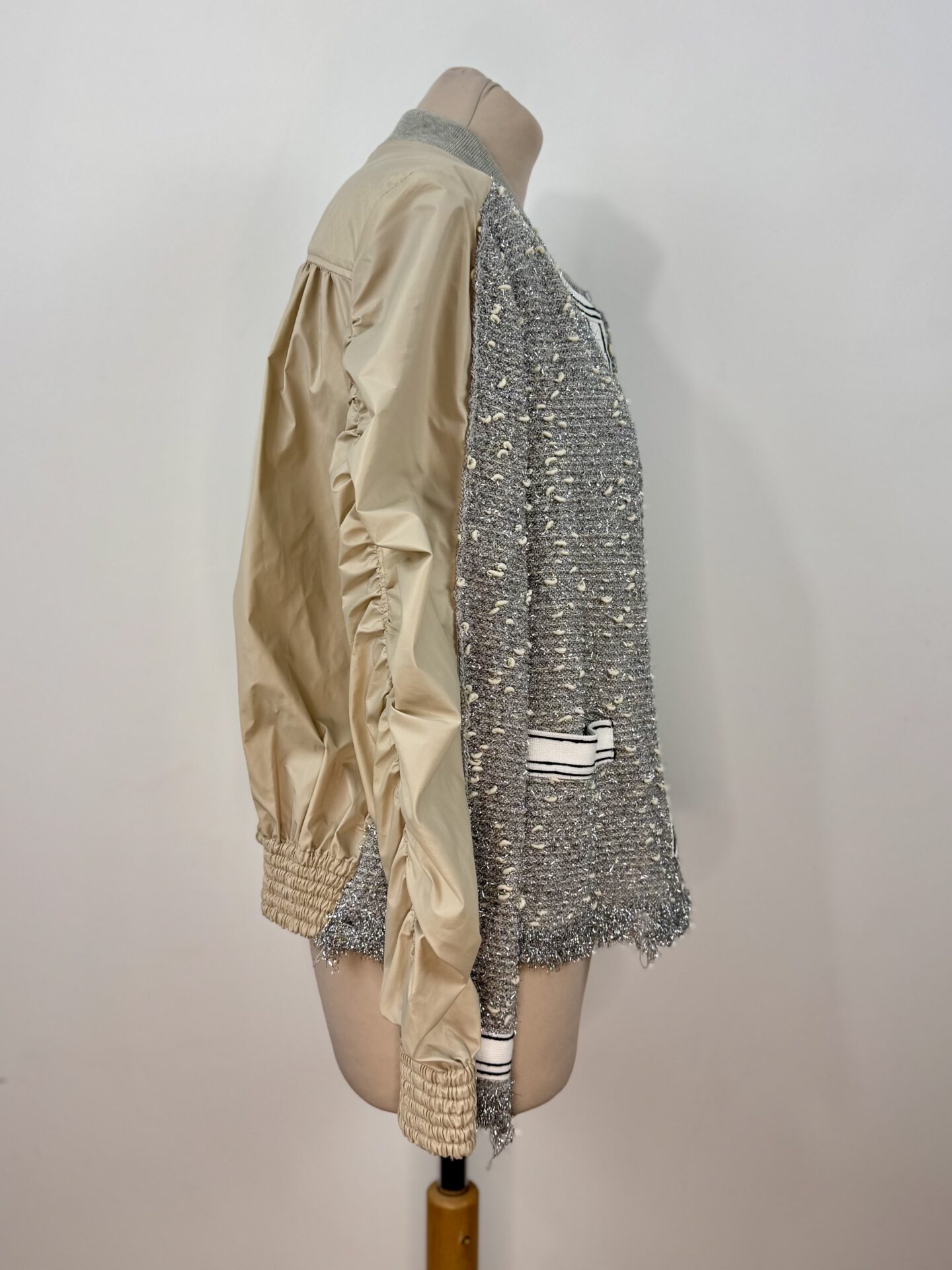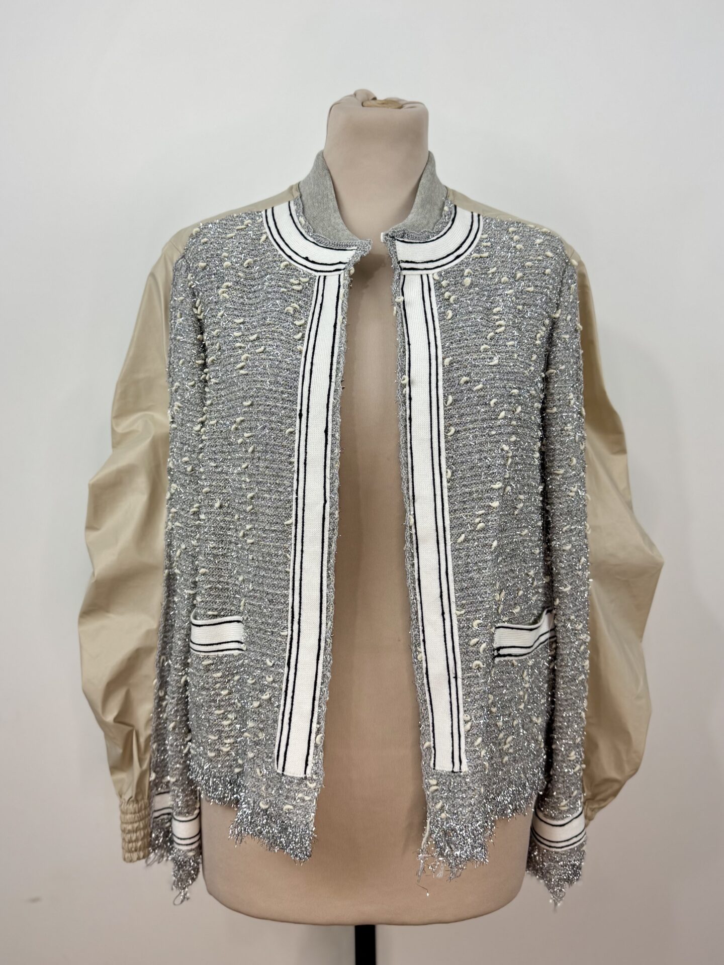 Ce bomber revisite les codes classiques avec un corps en tweed argenté aux fils texturés et des manches ballon en tissu beige. Les finitions à bords francs et les détails graphiques apportent une touche contemporaine à cette pièce qui mêle esprit couture et allure urbaine. 70% coton
