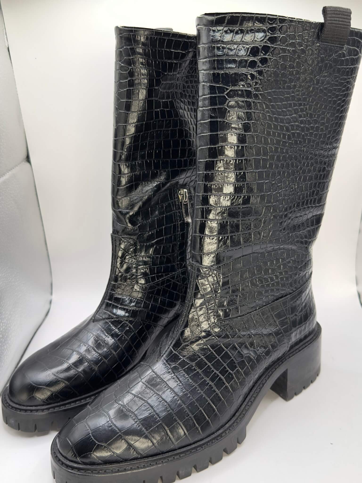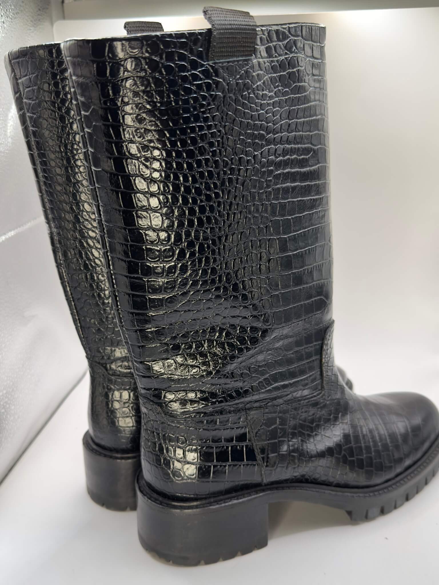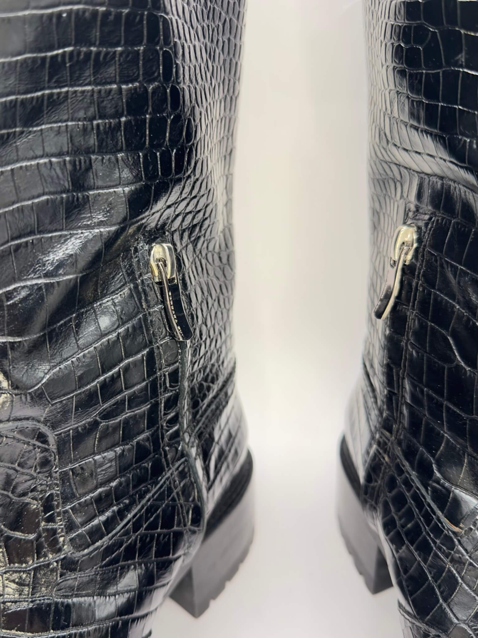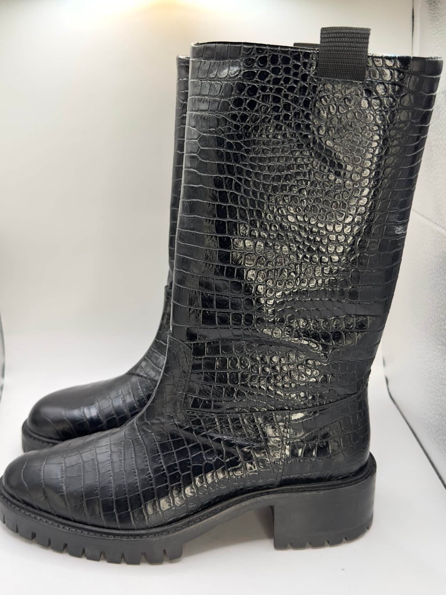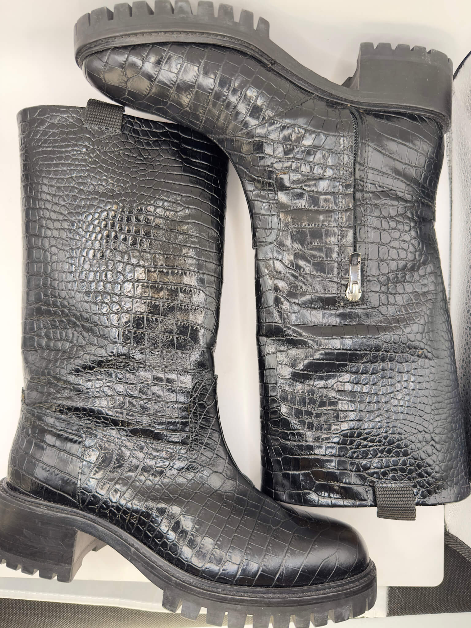 Bottes Barbara Bui en cuir noir effet croco, taille 38. Modèle à semelle crantée et talon bloc, alliant confort et allure rock chic. Fermeture zippée latérale, finitions soignées et silhouette structurée. Très bon état général, vendues avec leur boîte d’origine.