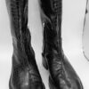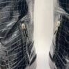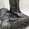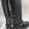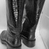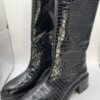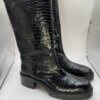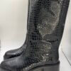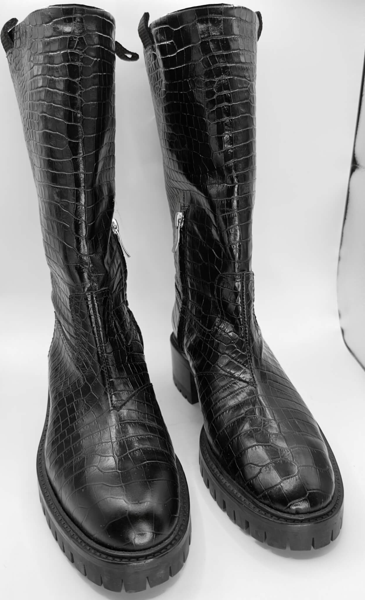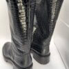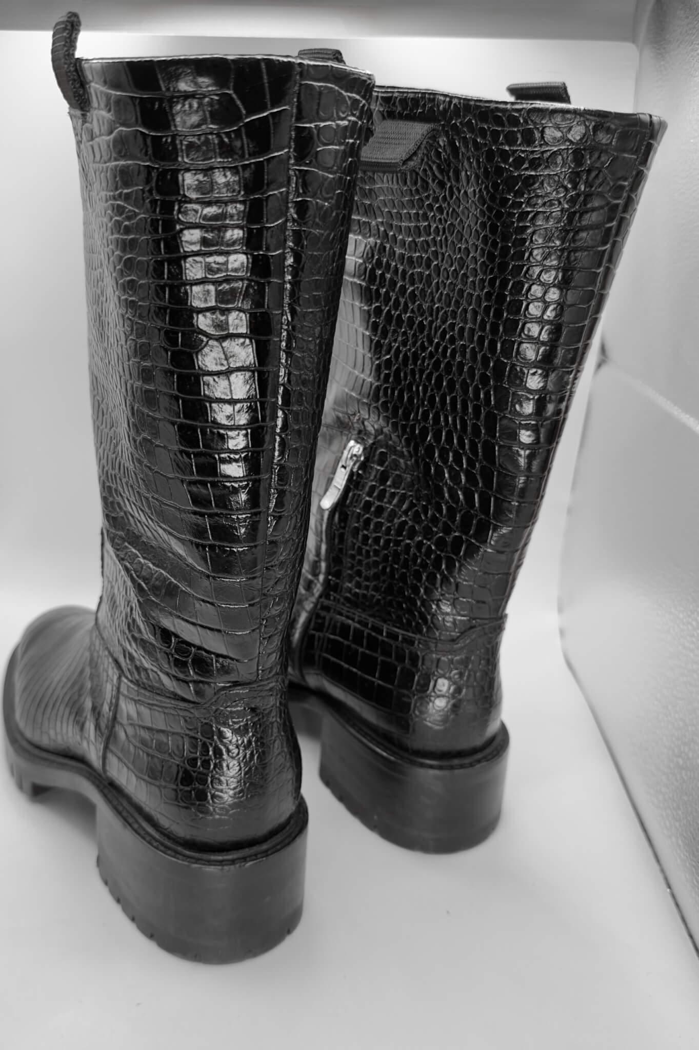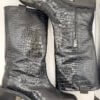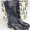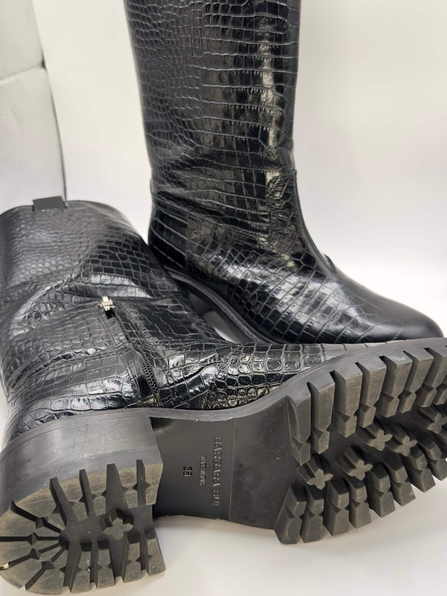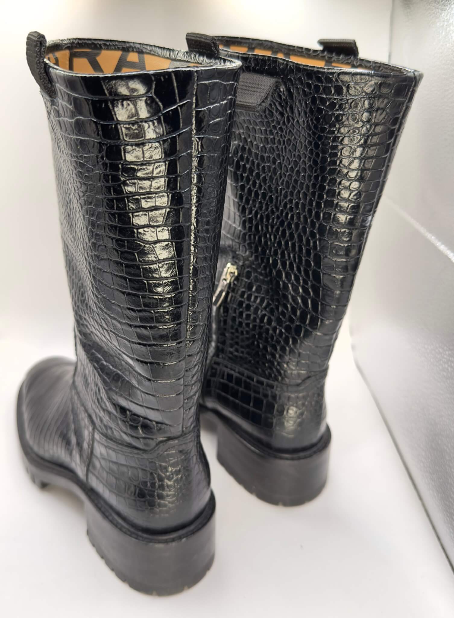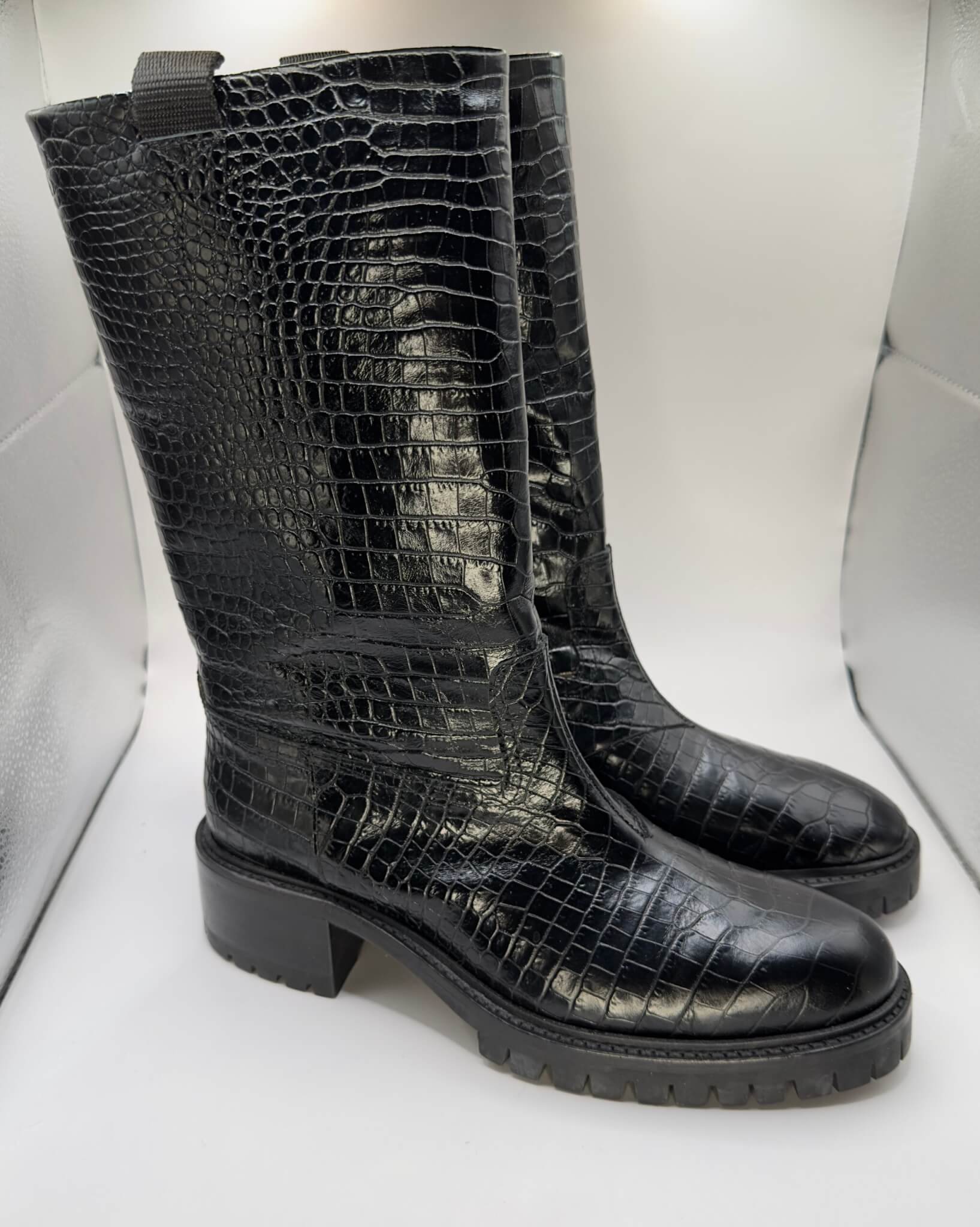 Bottes Barbara Bui en cuir noir effet croco, taille 38. Modèle à semelle crantée et talon bloc, alliant confort et allure rock chic. Fermeture zippée latérale, finitions soignées et silhouette structurée. Très bon état général, vendues avec leur boîte d’origine.