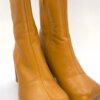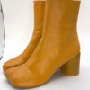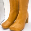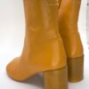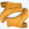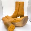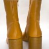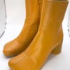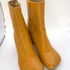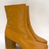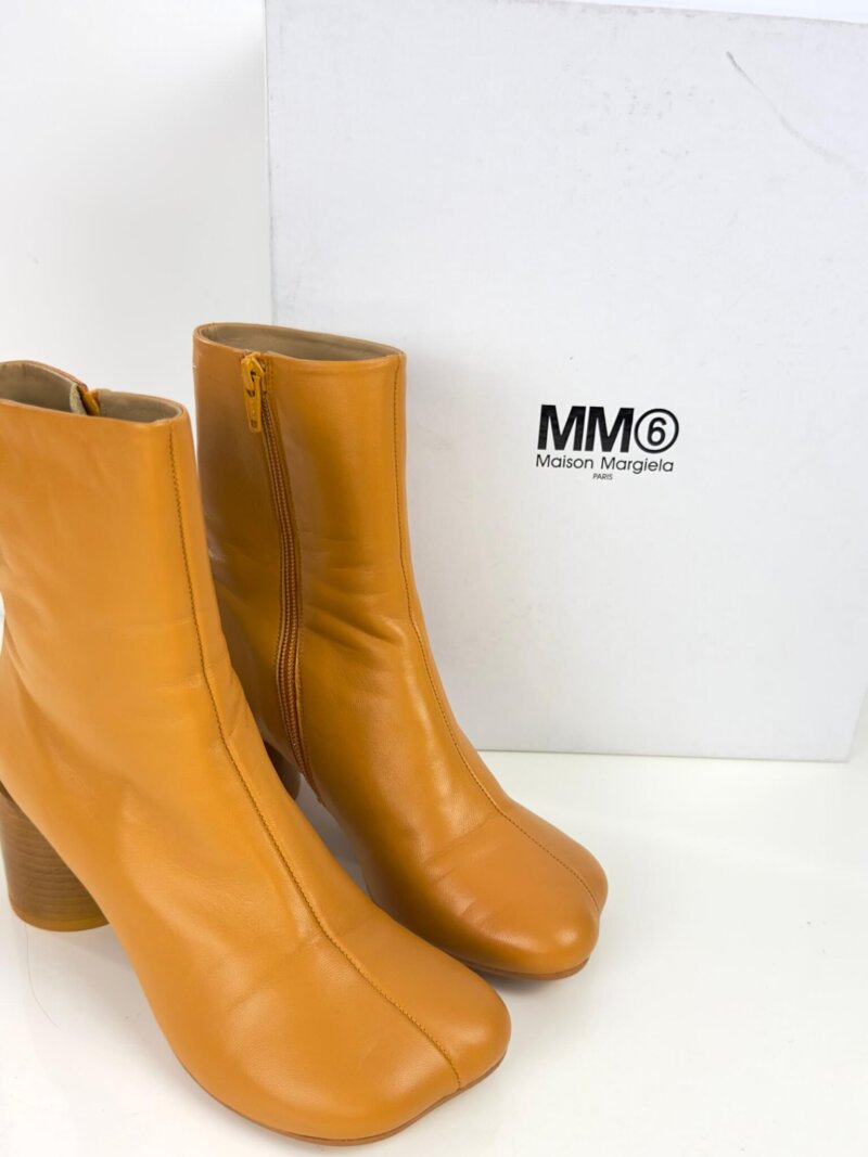 Bottines MM6 Maison Margiela en cuir coloris tournesol, avec couture signature sur le dessus du pied. Talon cylindrique en bois, zip latéral et silhouette épurée emblématique de la maison. Très bon état général, vendues avec leur boîte d’origine.
