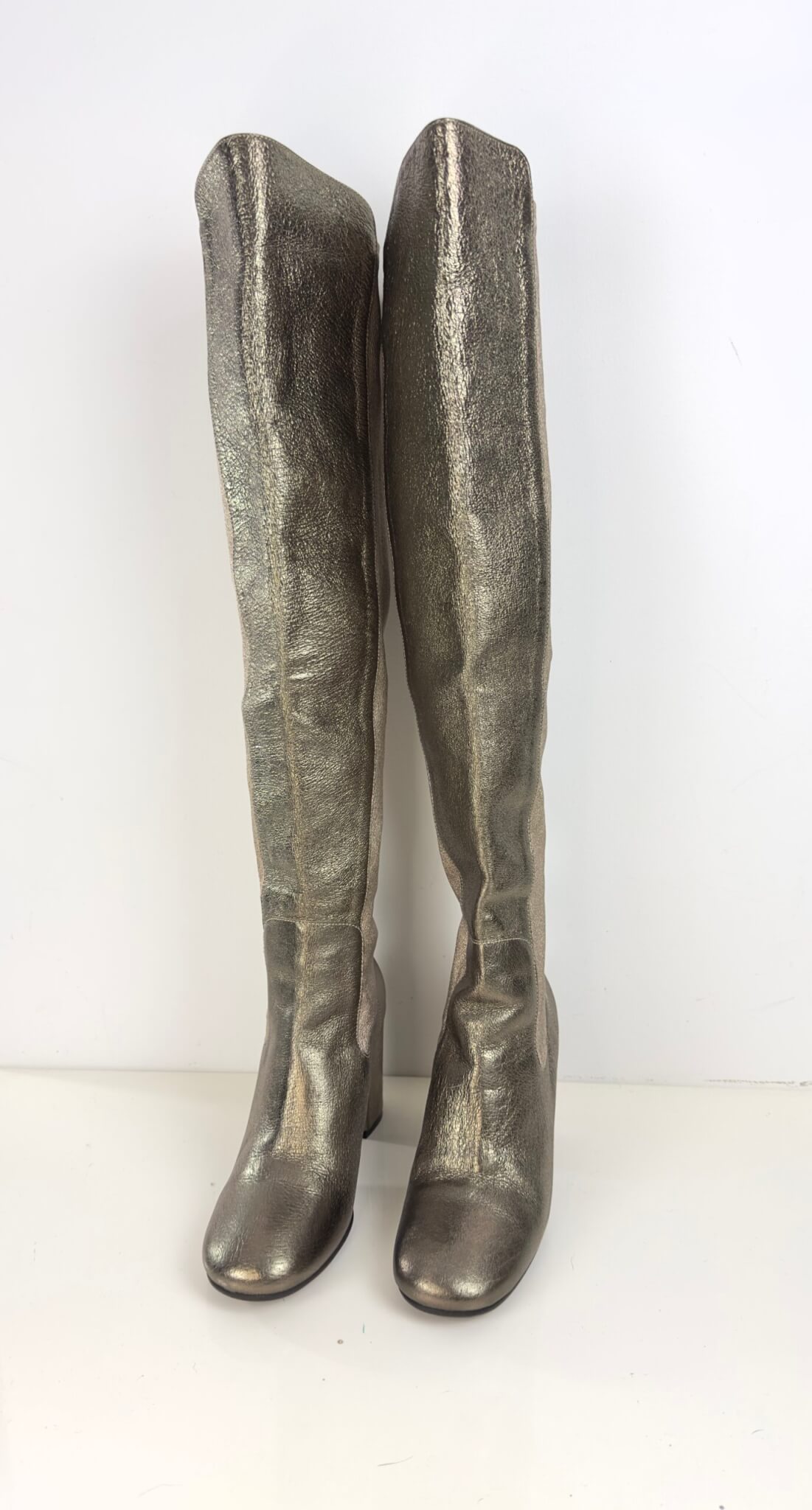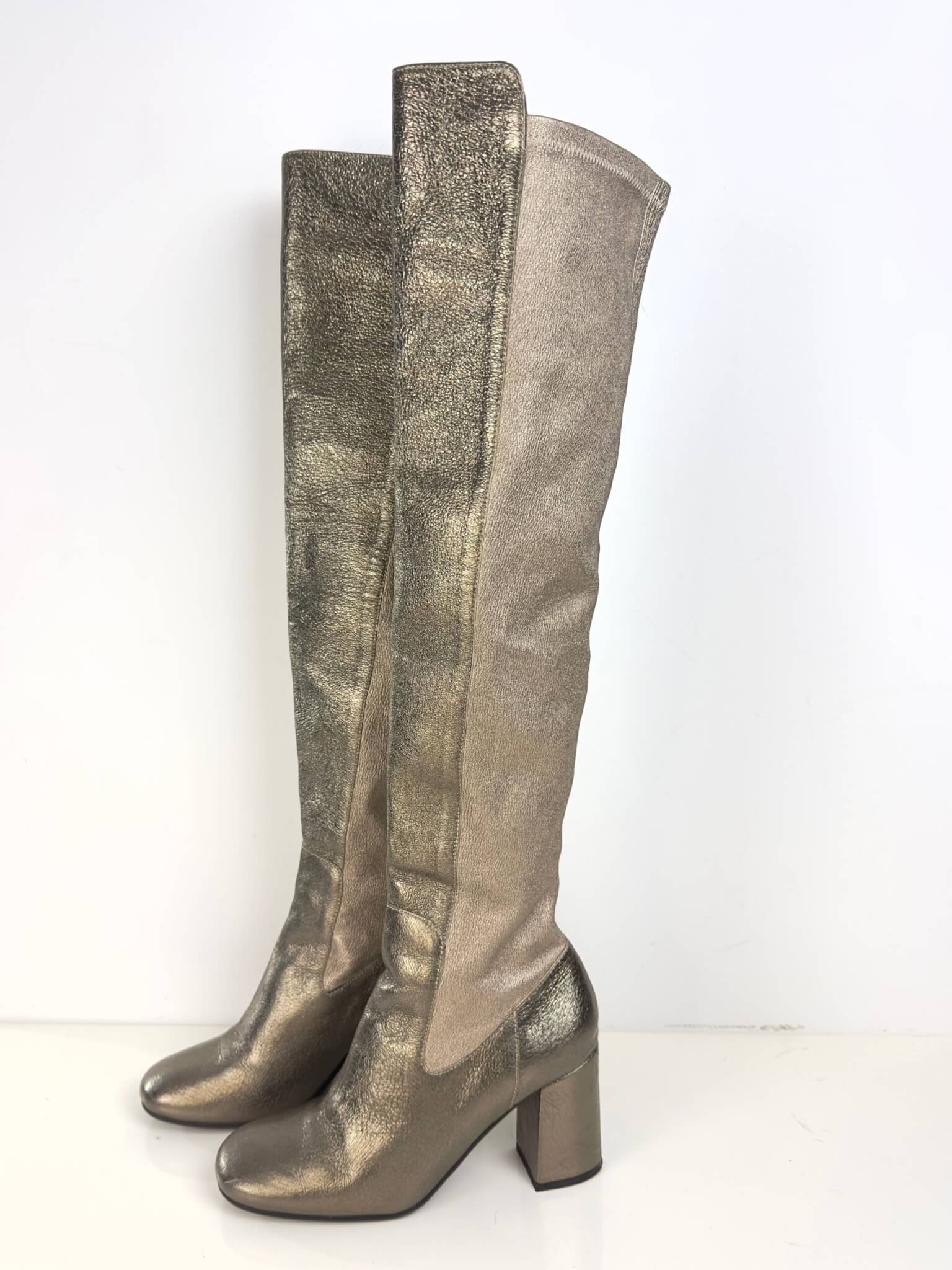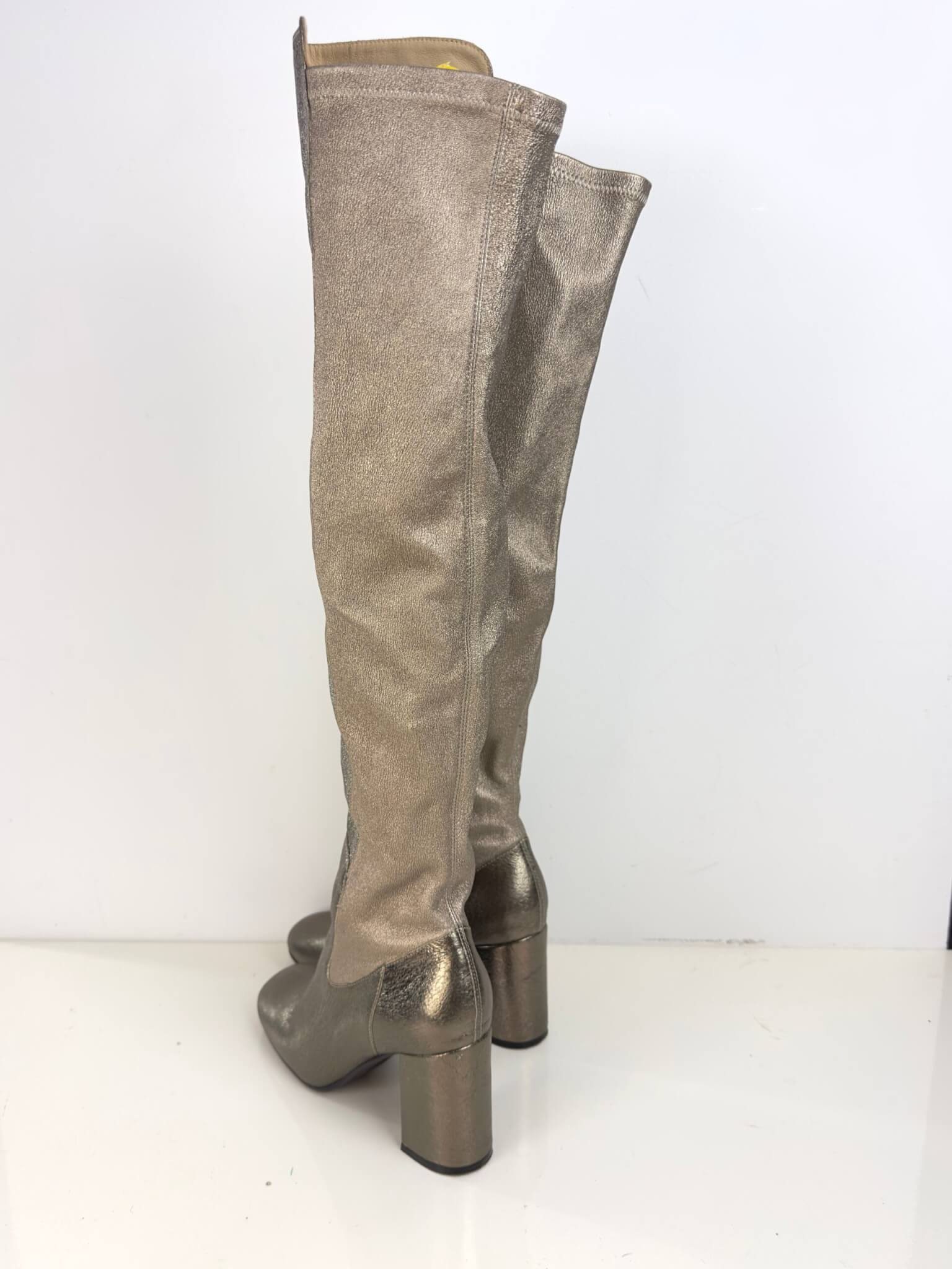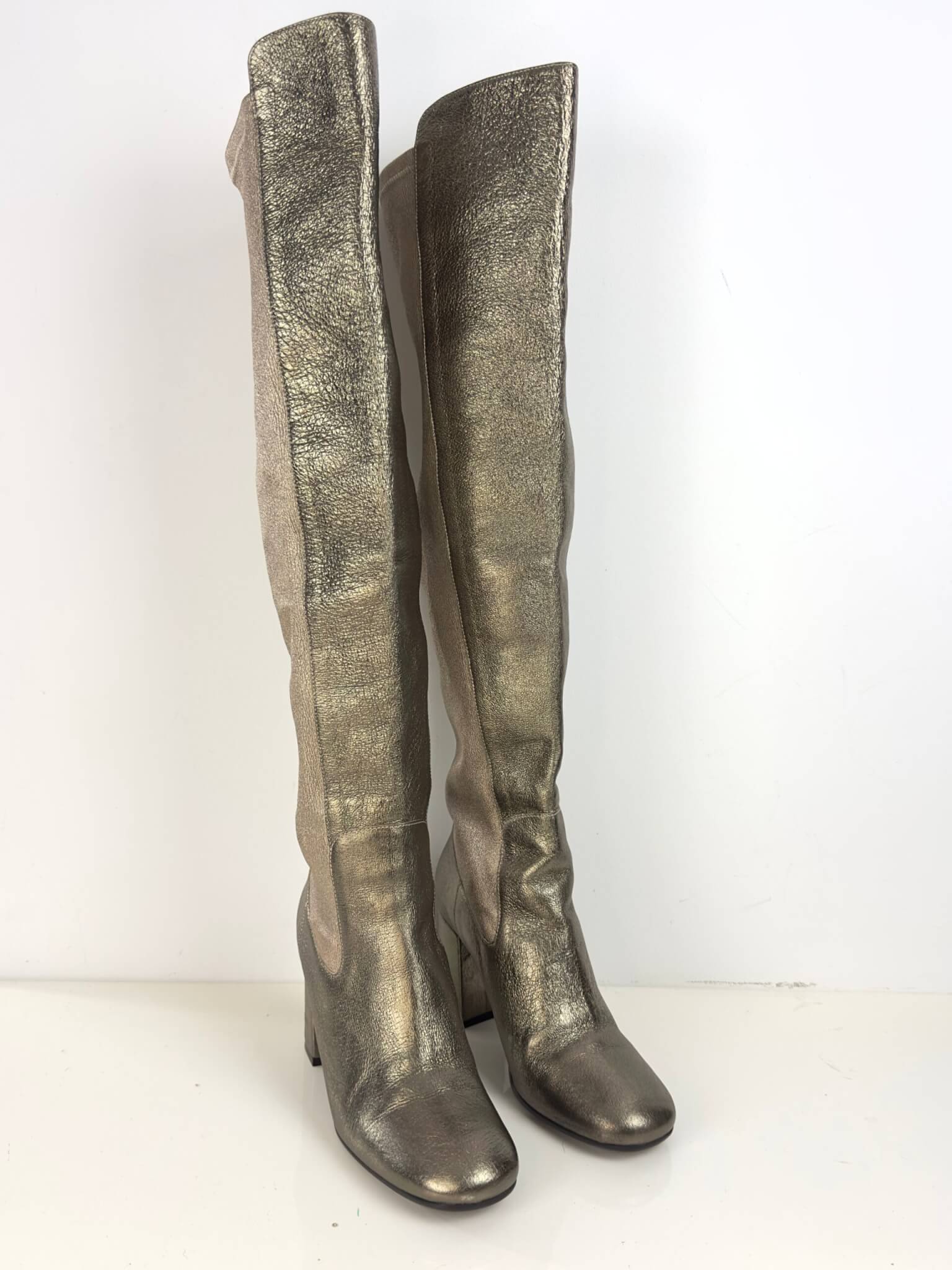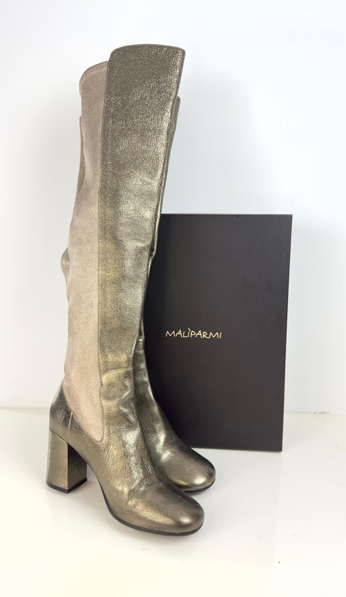 Cuissardes Malìparmi en cuir métallisé bronze, avec empiècement stretch à l’arrière pour un maintien parfait. Talon bloc confortable et bout arrondi. Très bon état général, vendues avec leur boîte d’origine.