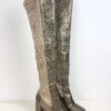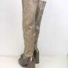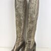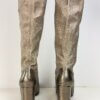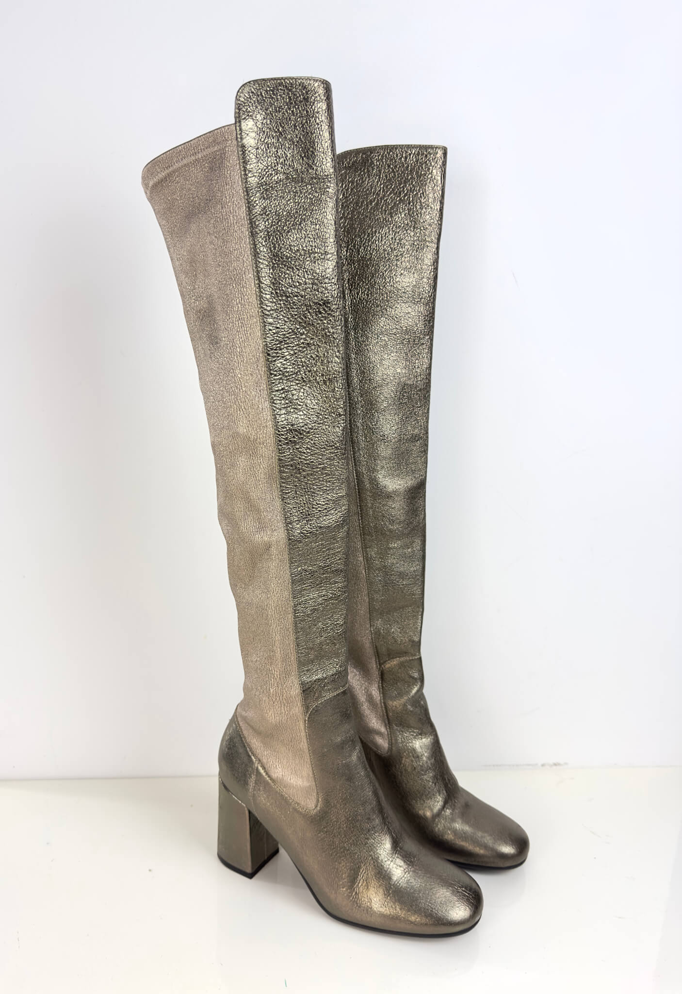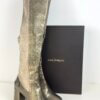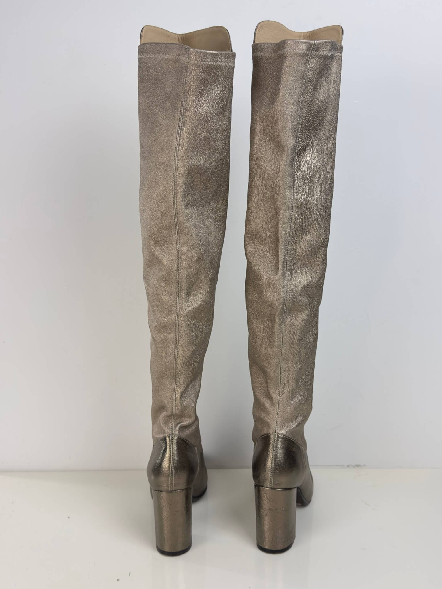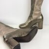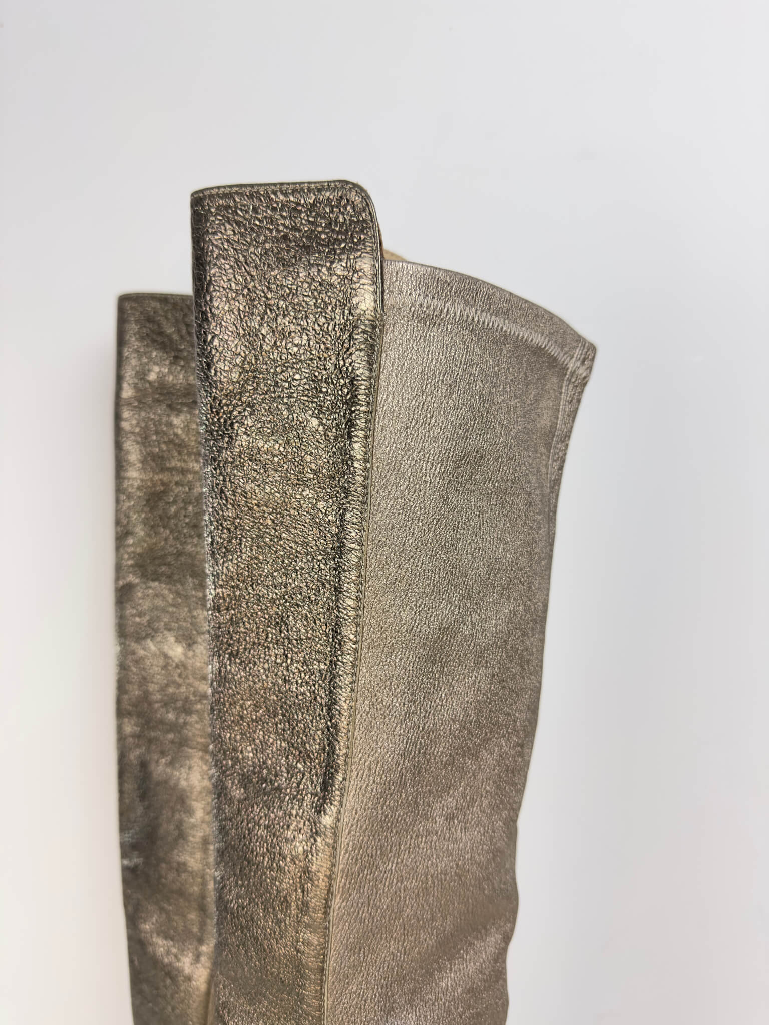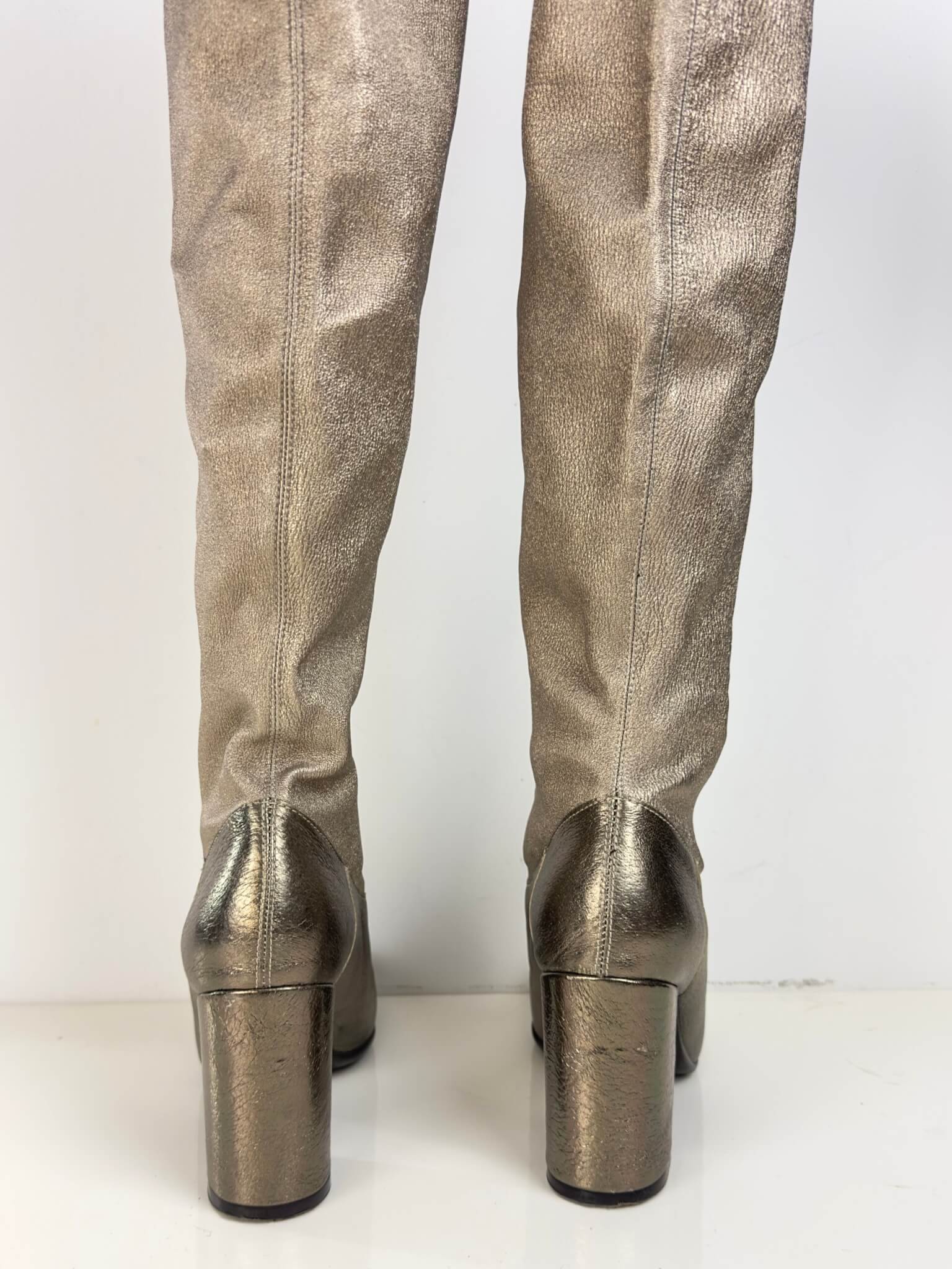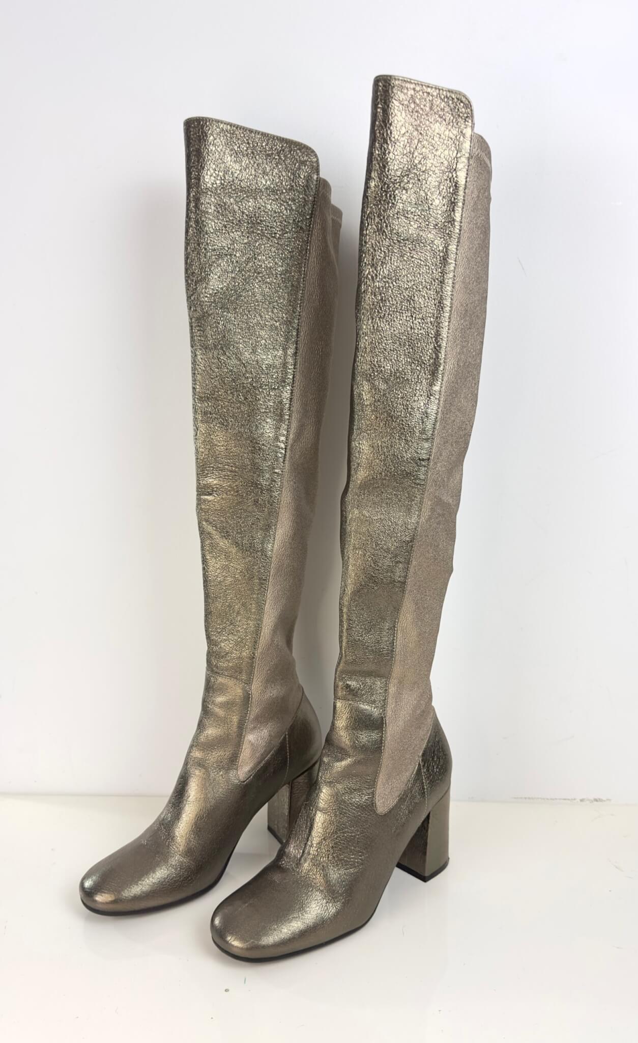Cuissardes Malìparmi en cuir métallisé bronze, avec empiècement stretch à l’arrière pour un maintien parfait. Talon bloc confortable et bout arrondi. Très bon état général, vendues avec leur boîte d’origine.