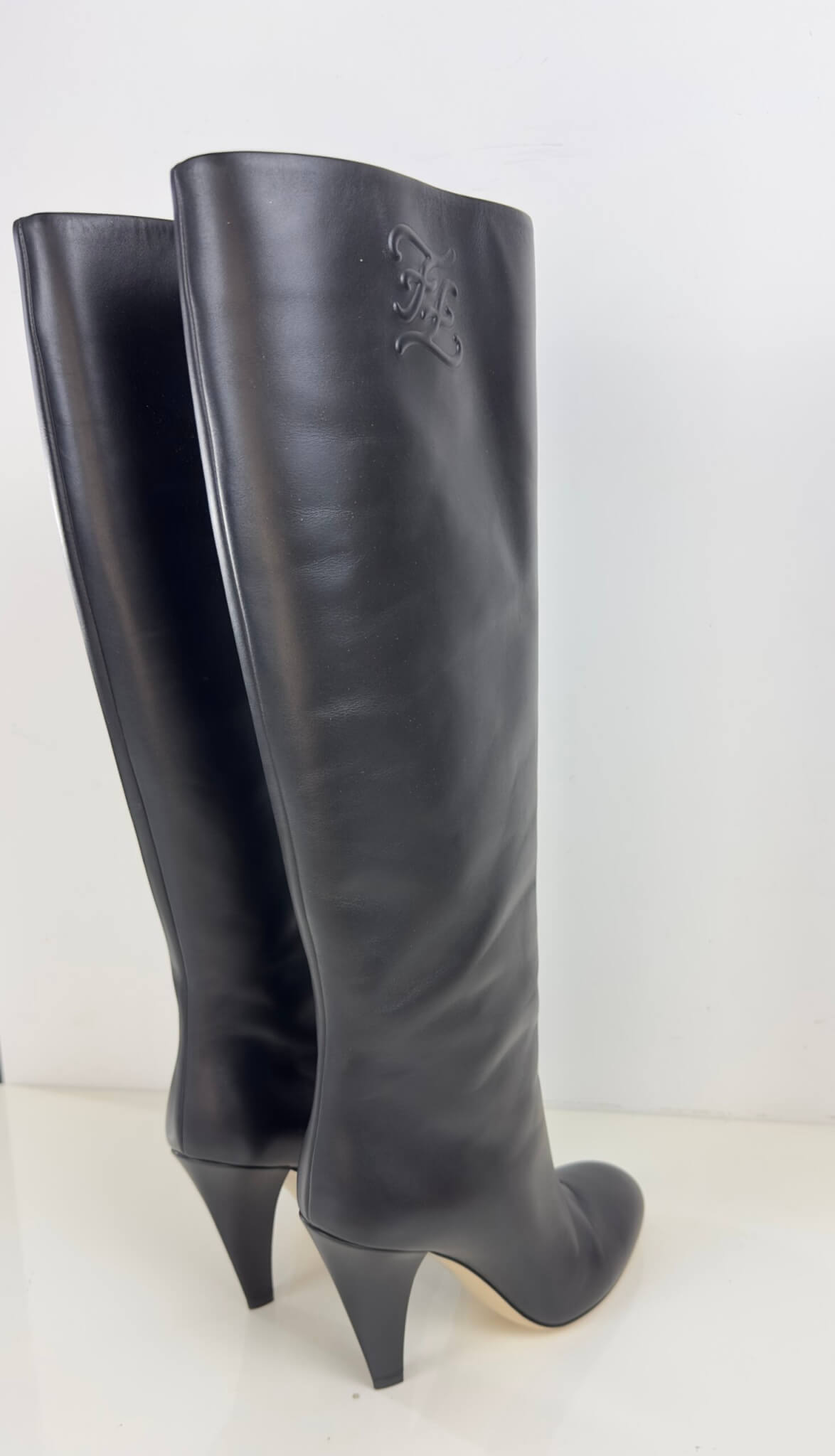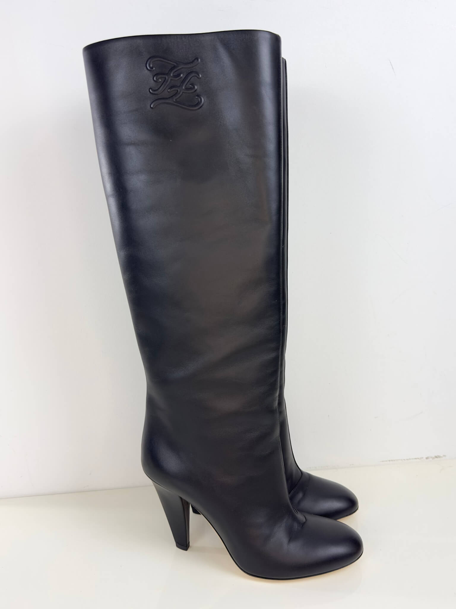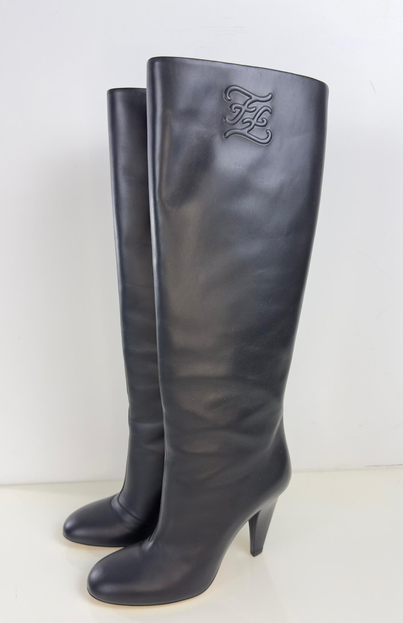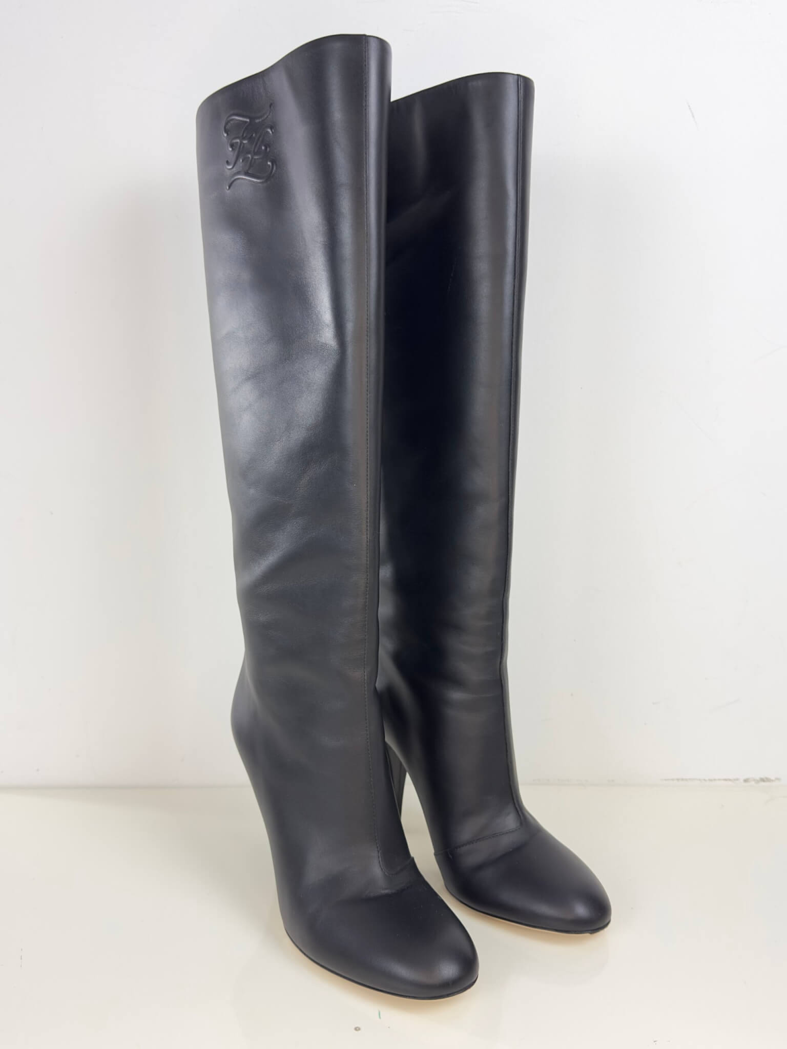 Bottes Fendi en cuir noir, logo embossé sur la tige. Modèle à talon haut et bout arrondi, élégant et intemporel. Très bon état général, vendues sans boîte mais avec dustbag d’origine.