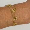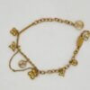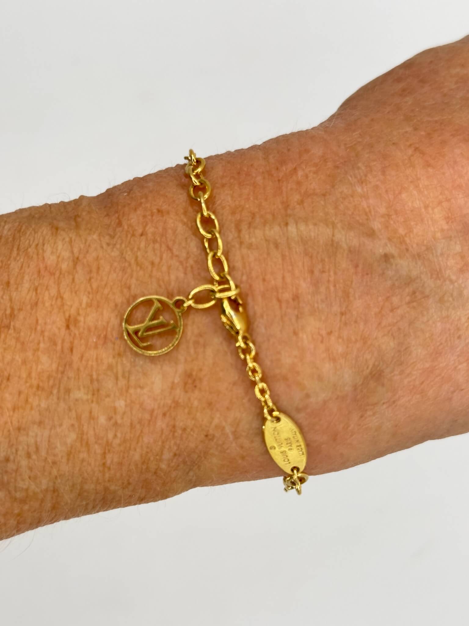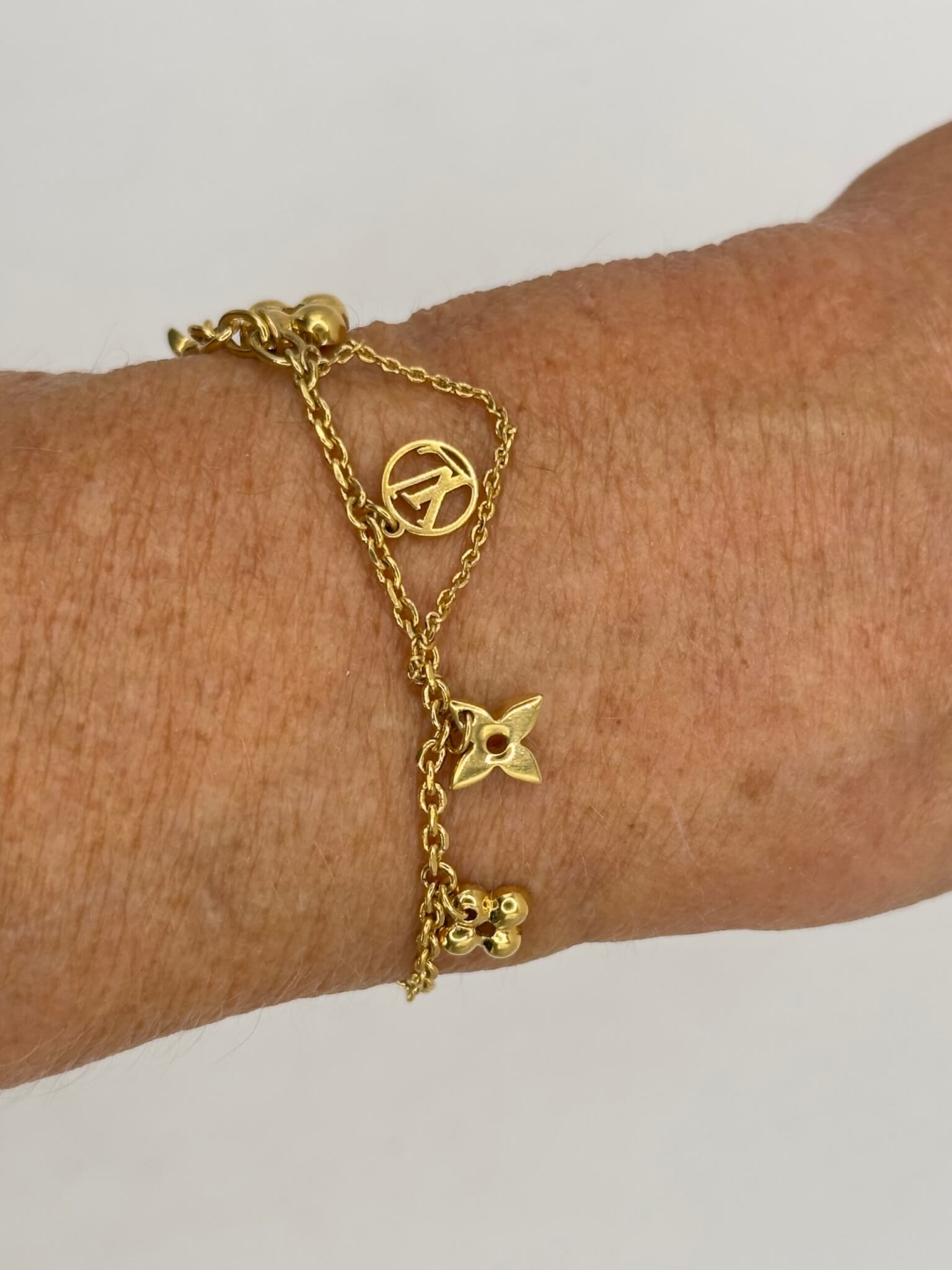 Bracelet souple Louis Vuitton Blooming, en métal doré. Orné des emblèmes iconiques de la Maison — fleurs de Monogram et logo LV — sur une double chaîne délicate. Fermoir mousqueton, longueur ajustable. Excellent état, livré avec sa boîte, son pochon et son sac Louis Vuitton.