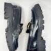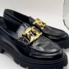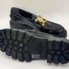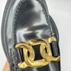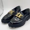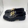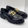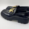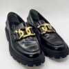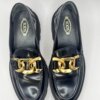 Mocassins Tod’s en cuir noir, pointure 38. Modèle chunky à semelle crantée et chaîne dorée signature sur le dessus. Confortables, modernes et élégants, ils incarnent parfaitement le style italien intemporel de la maison Tod’s. Très bon état général, vendus sans boîte d’origine.