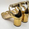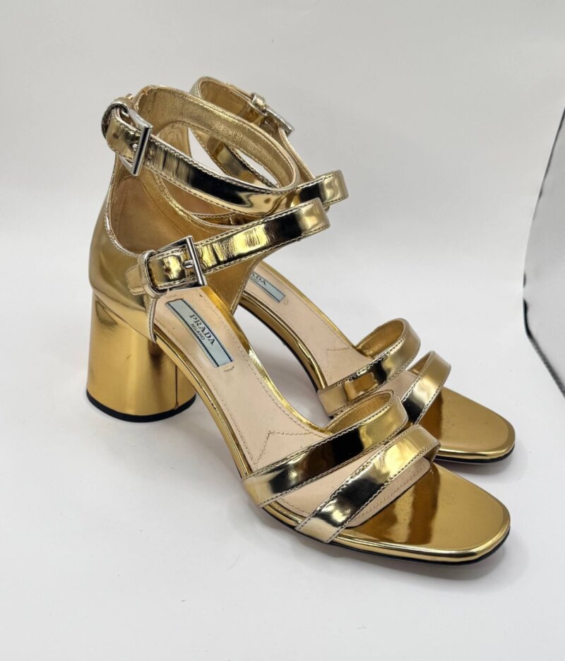 Sandales Prada en cuir verni doré, pointure 38. Modèle à brides croisées et talon carré, à la fois élégant et confortable. Finition miroir typique de la maison italienne, pour un éclat sophistiqué. Très bon état général. Vendues sans boîte d’origine, avec deux pochons Prada.