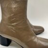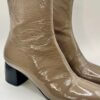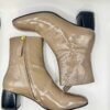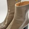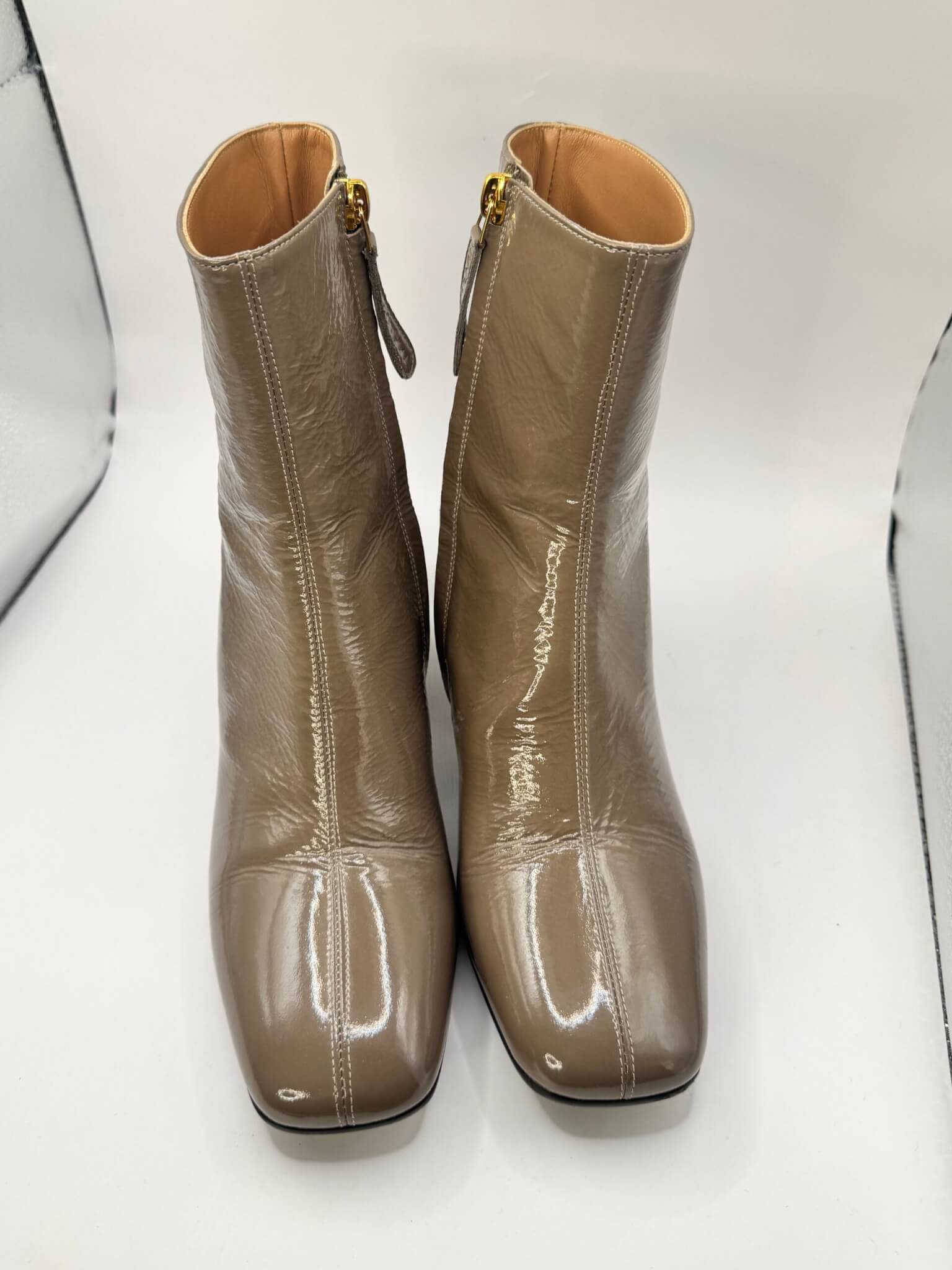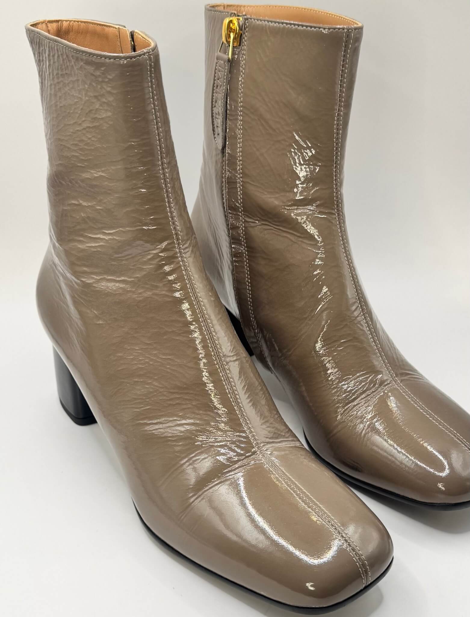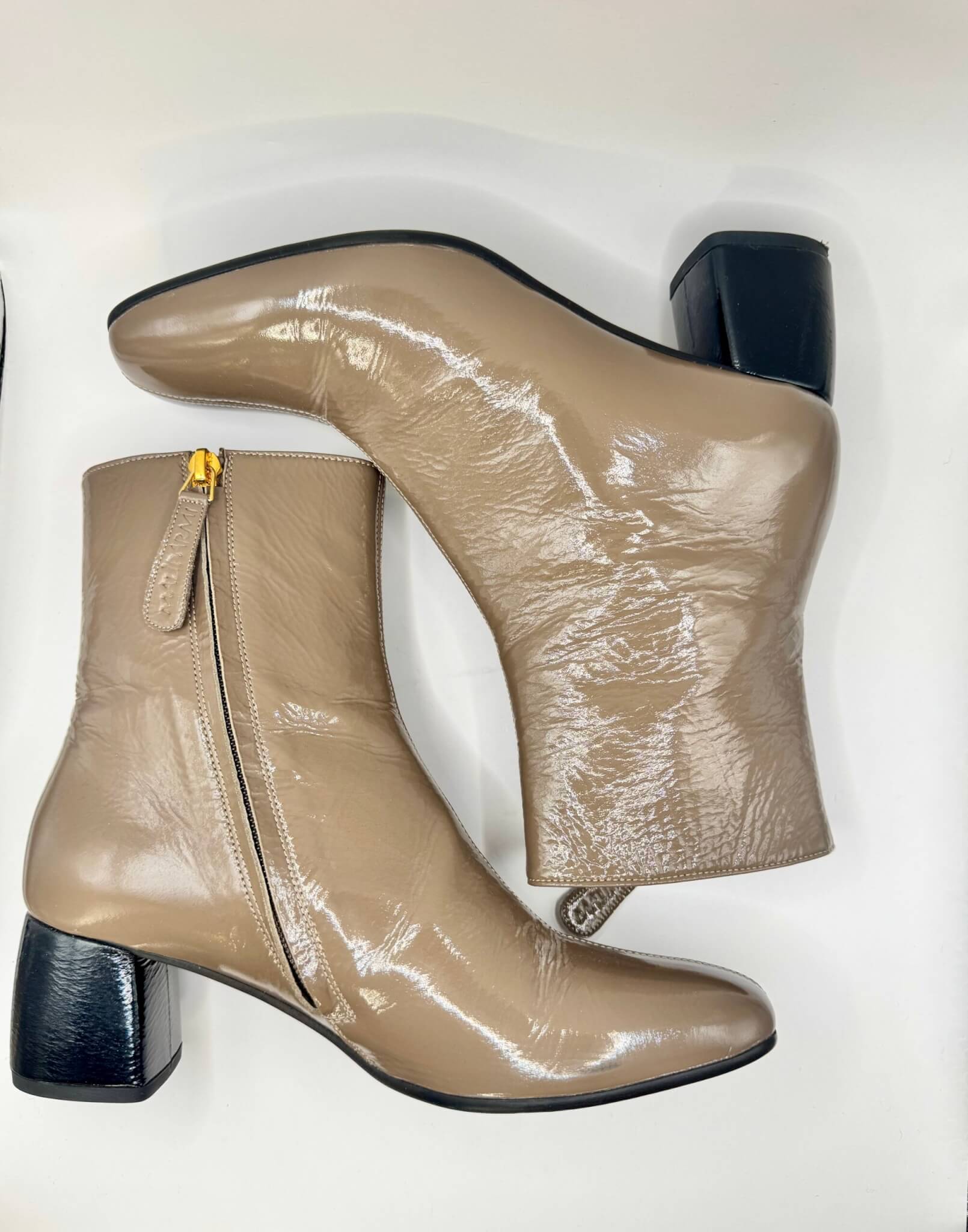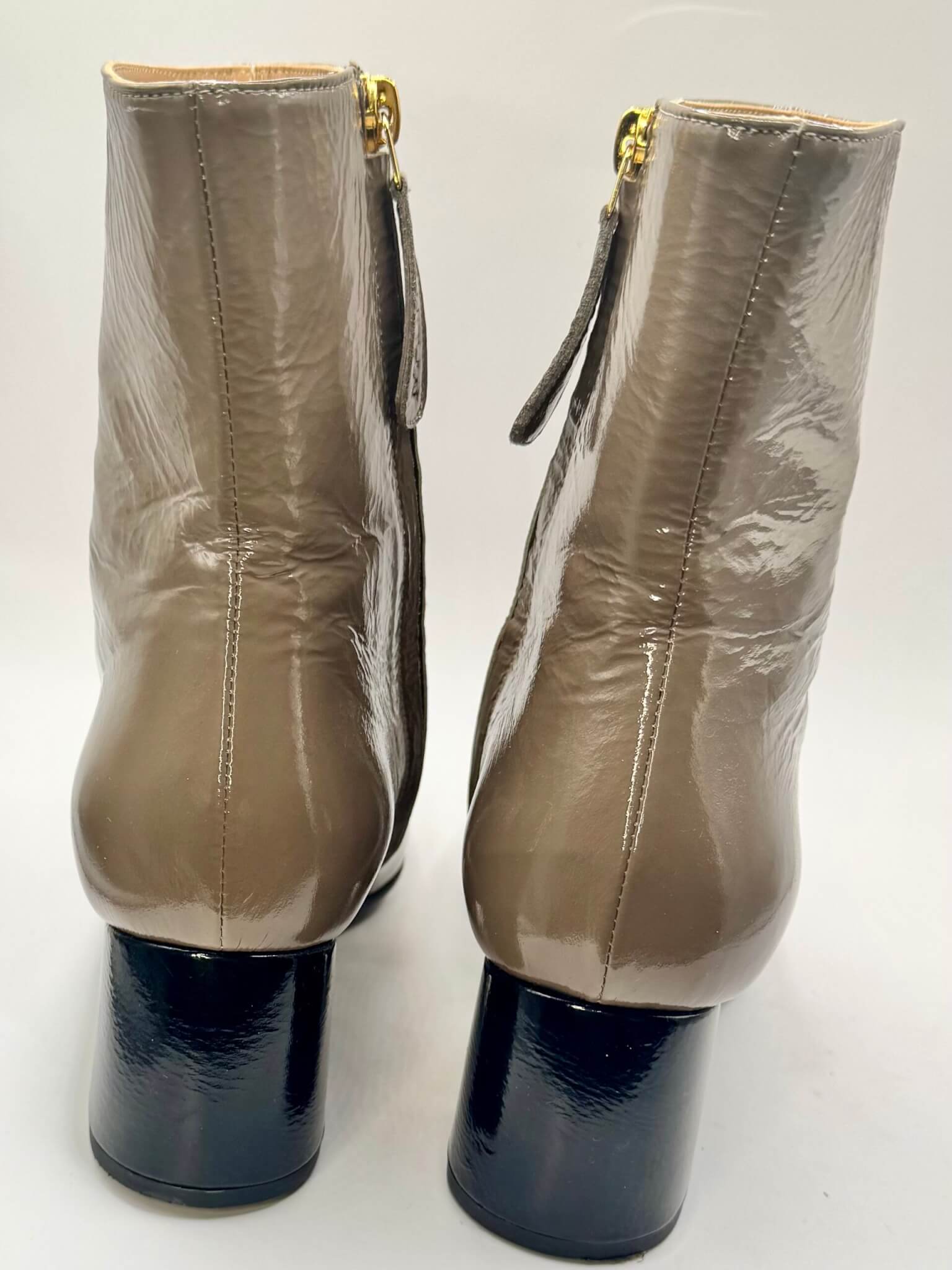 Bottines Malìparmi en cuir verni taupe, pointure 38. Modèle à talon carré noir, zip doré sur le côté et ligne épurée typique de la maison italienne. Très peu portées, en excellent état. Vendues sans boîte d’origine.