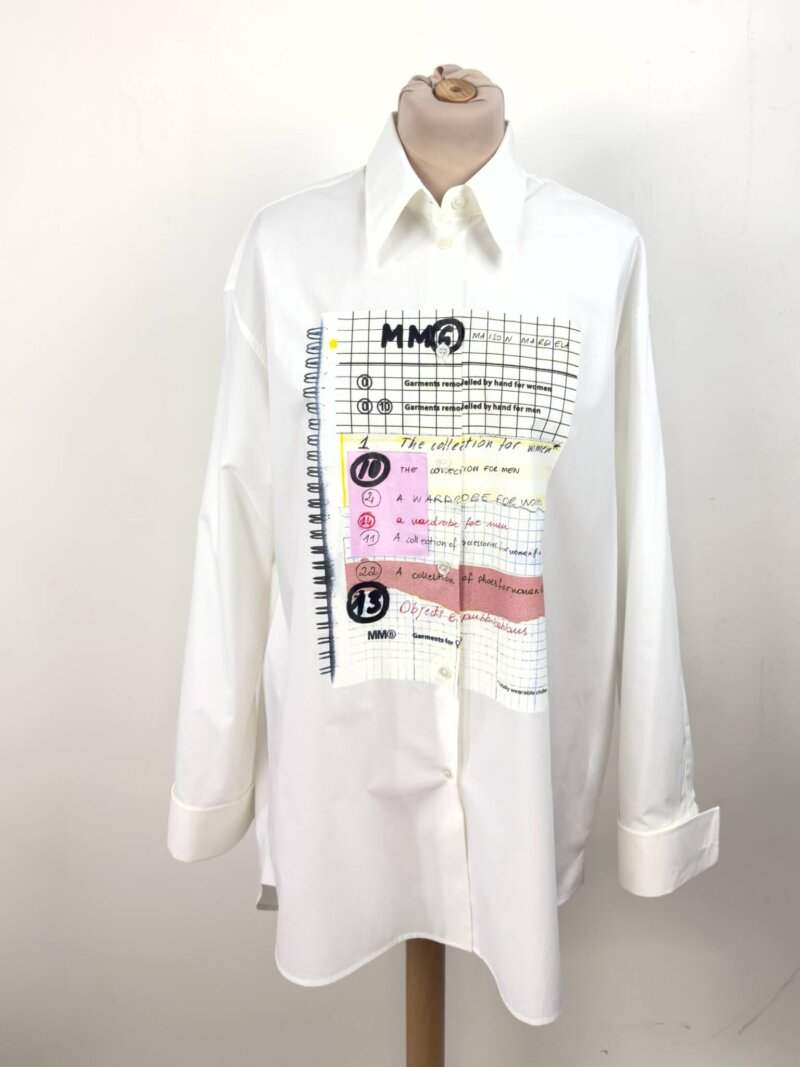 Chemise blanche MM6 Maison Margiela, 100 % coton, neuve avec étiquette. Modèle orné d’un motif graphique façon carnet de notes sur le devant, et d’un lien à nouer au dos. Col classique, poignets boutonnés et finitions impeccables.