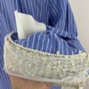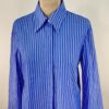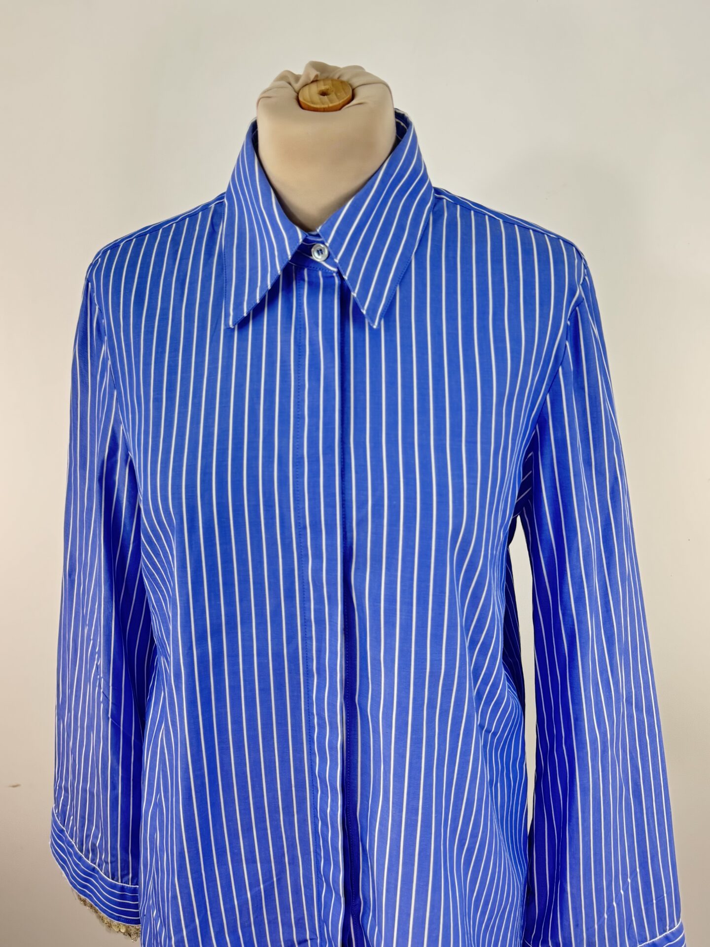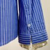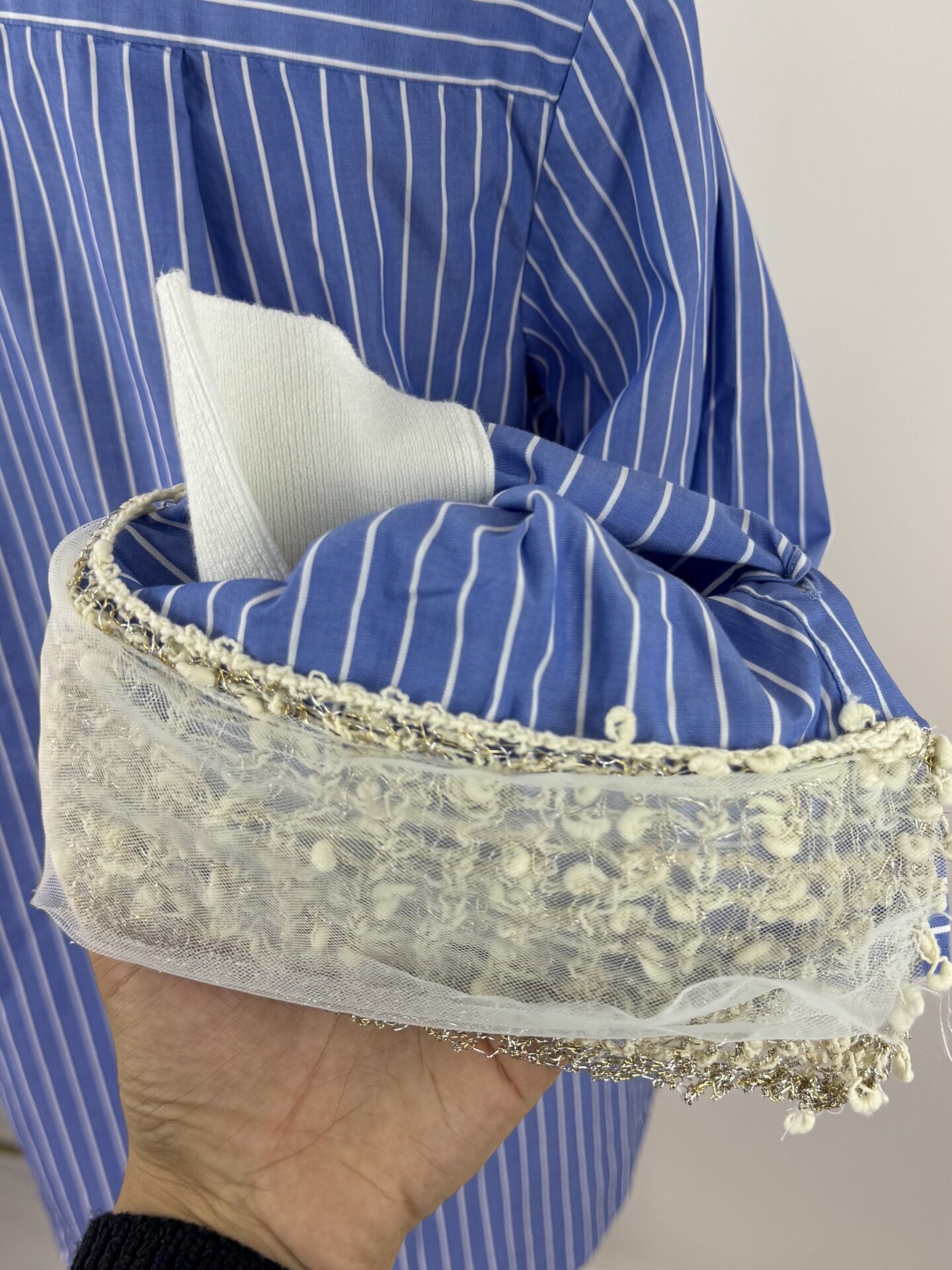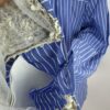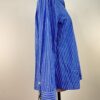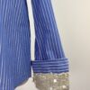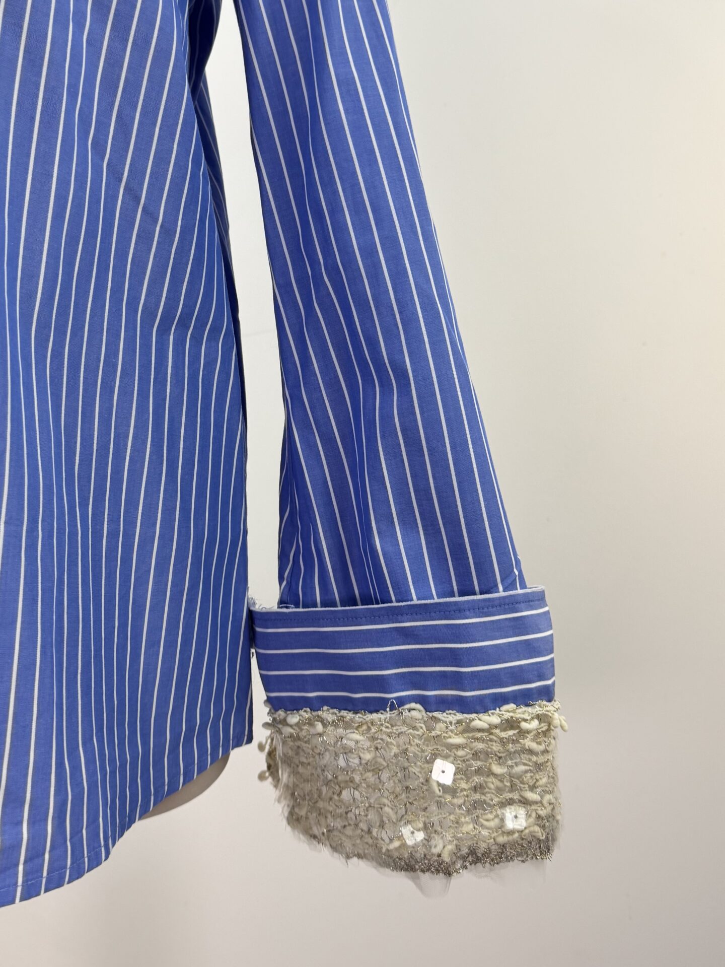 Chemisier AVIU en coton rayé bleu et blanc, rehaussé de poignets larges décorés de sequins argentés. Les manches sont dotées d’un élastique intérieur permettant d’y passer les poignets afin de maintenir la tenue et structurer le tombé. Coupe droite, col classique et fermeture dissimulée à l’avant.