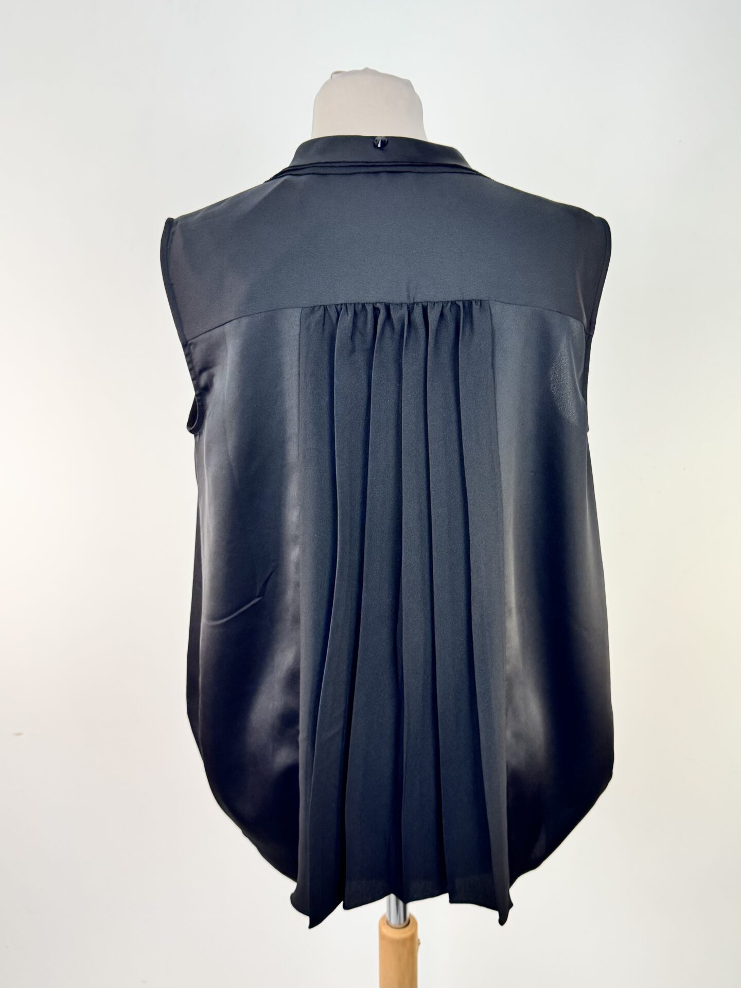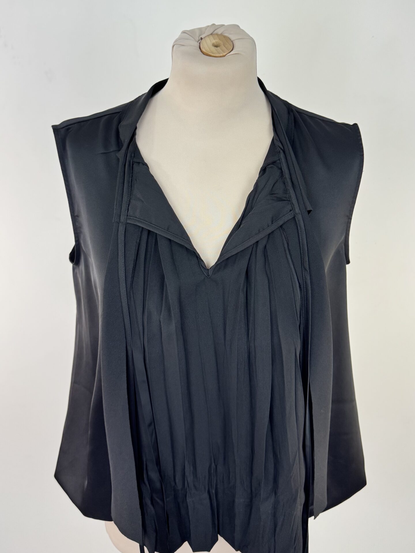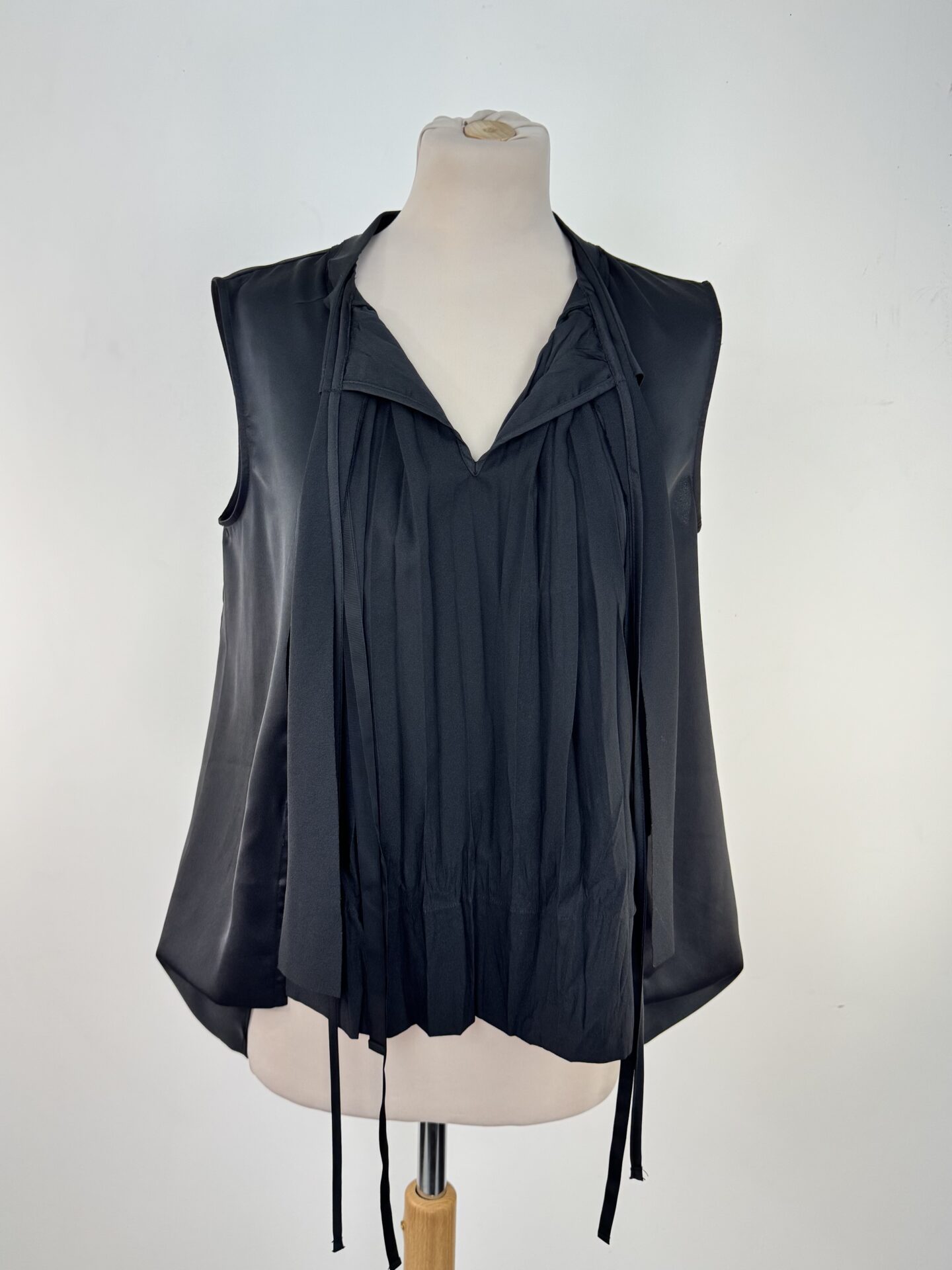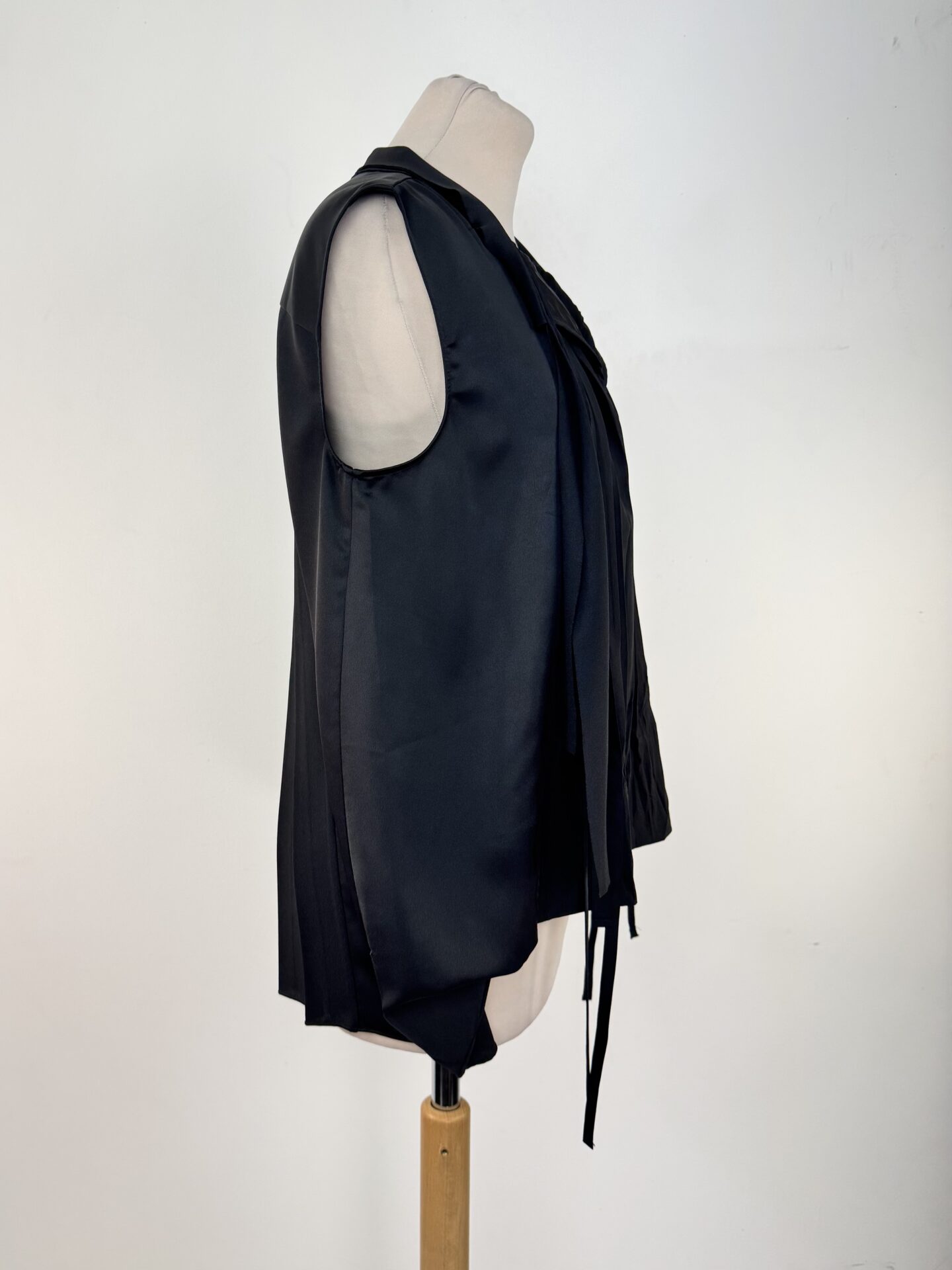 Haut sans manches High en polyester noir. Ce modèle fluide joue sur les effets de volume avec ses plis plats marqués à l’avant et au dos. Le col peut se porter ouvert façon lavallière ou fermé avec ses liens discrets, offrant plusieurs possibilités de style. La coupe ample et légère lui donne un tombé élégant et confortable.