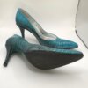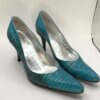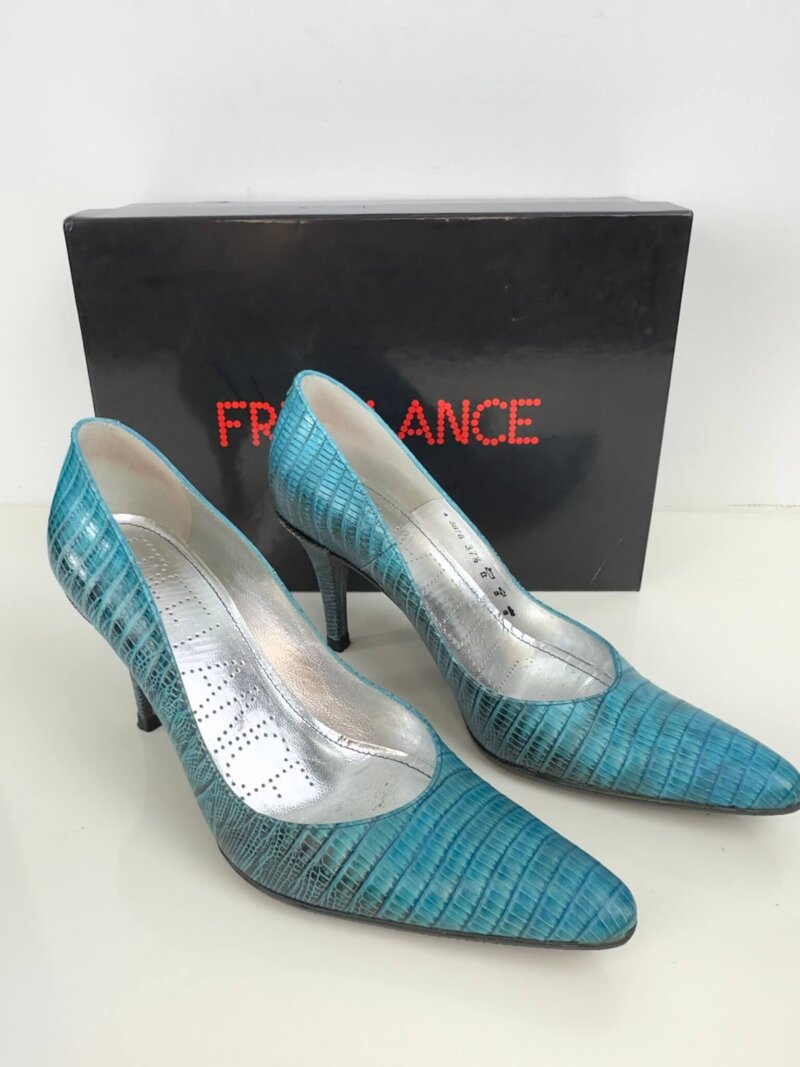 Escarpins Free Lance en cuir effet serpent turquoise. Bout pointu, talon fin et intérieur argenté. Une paire au charme rétro et à la ligne élégante, à porter aussi bien en journée qu’en soirée. Avec boîte d’origine. Taille 37,5. État excellent.