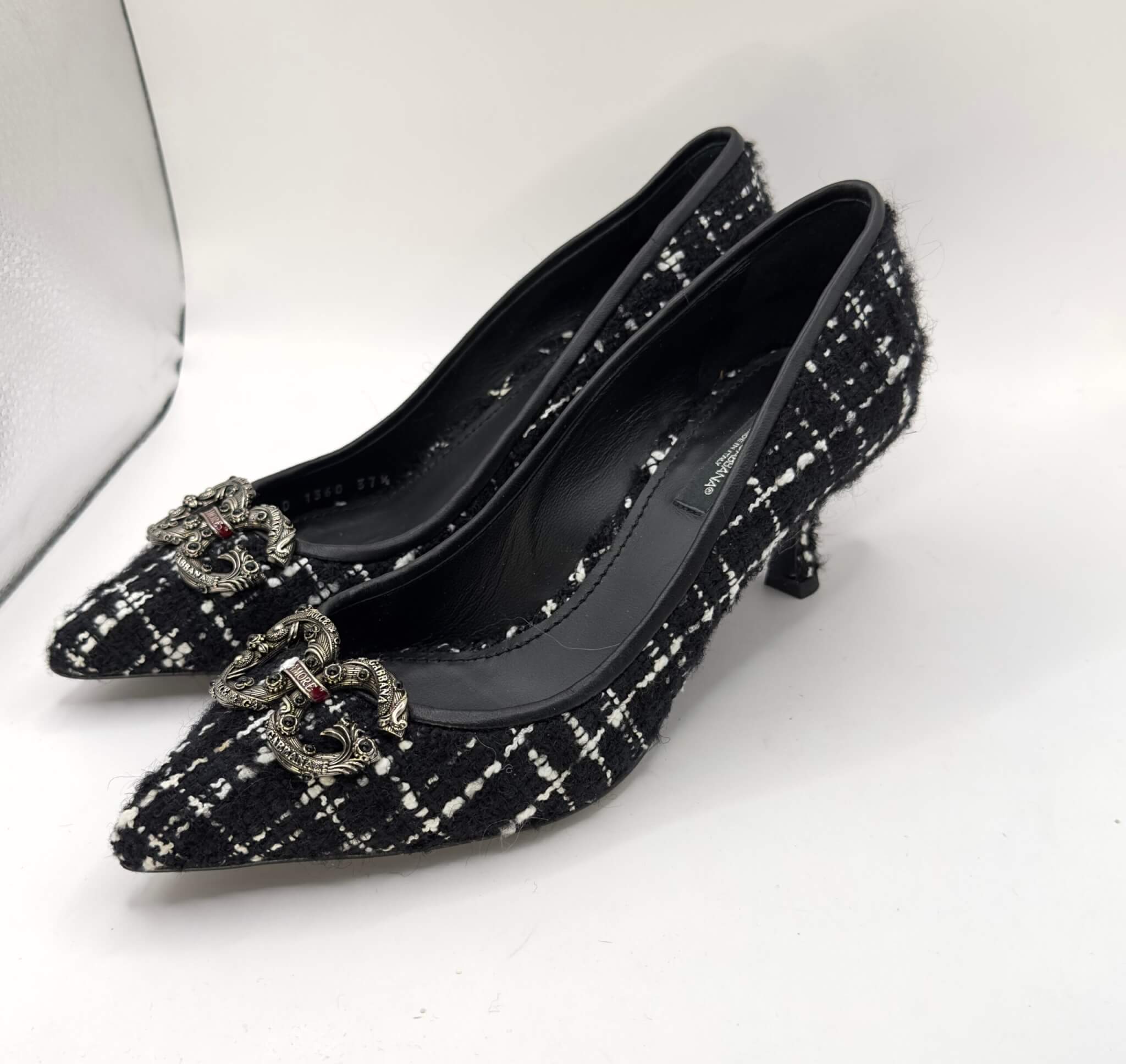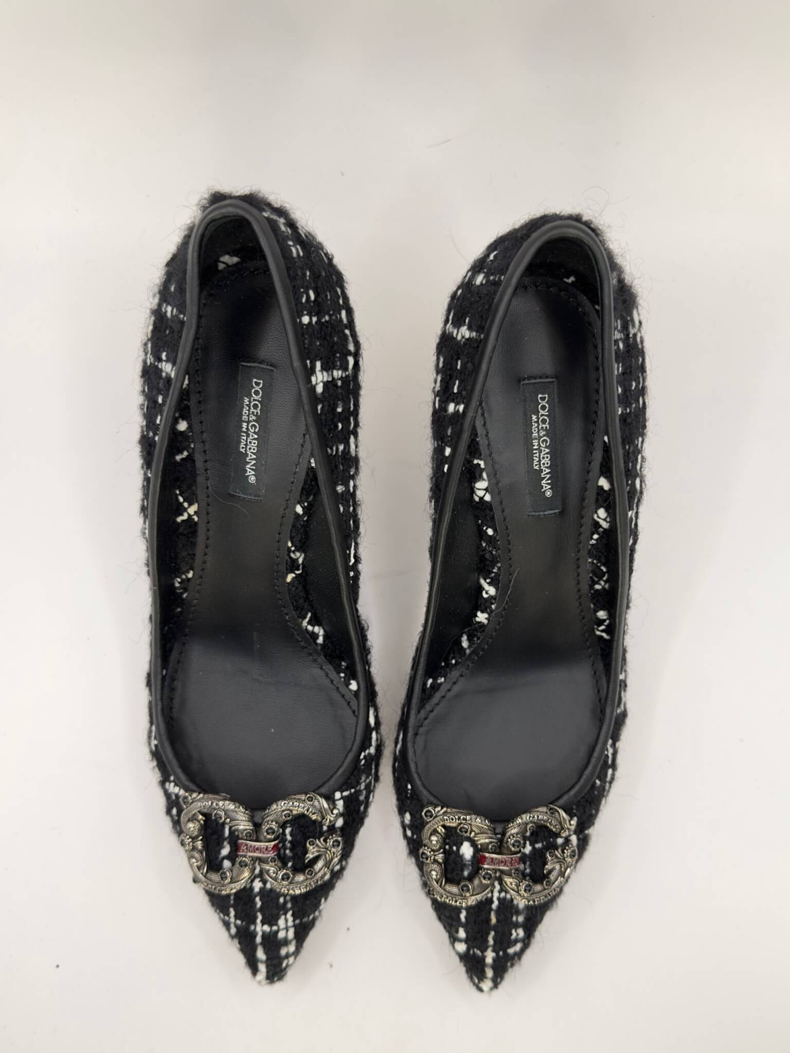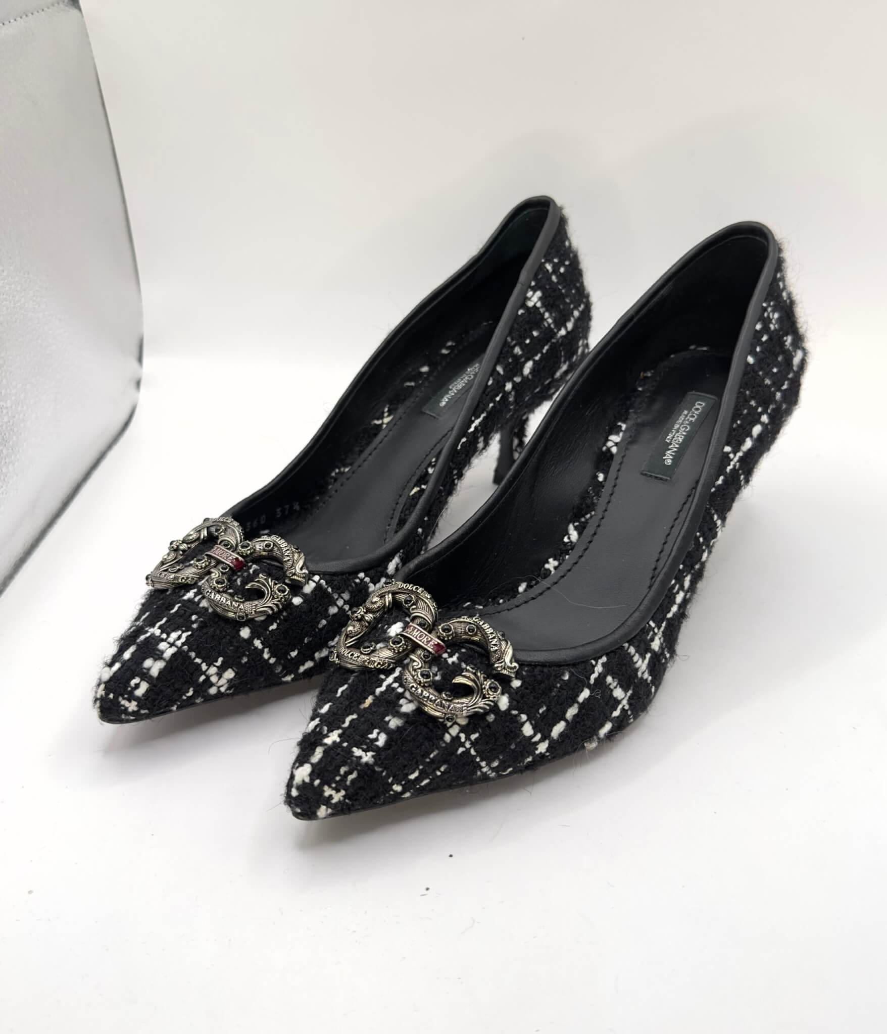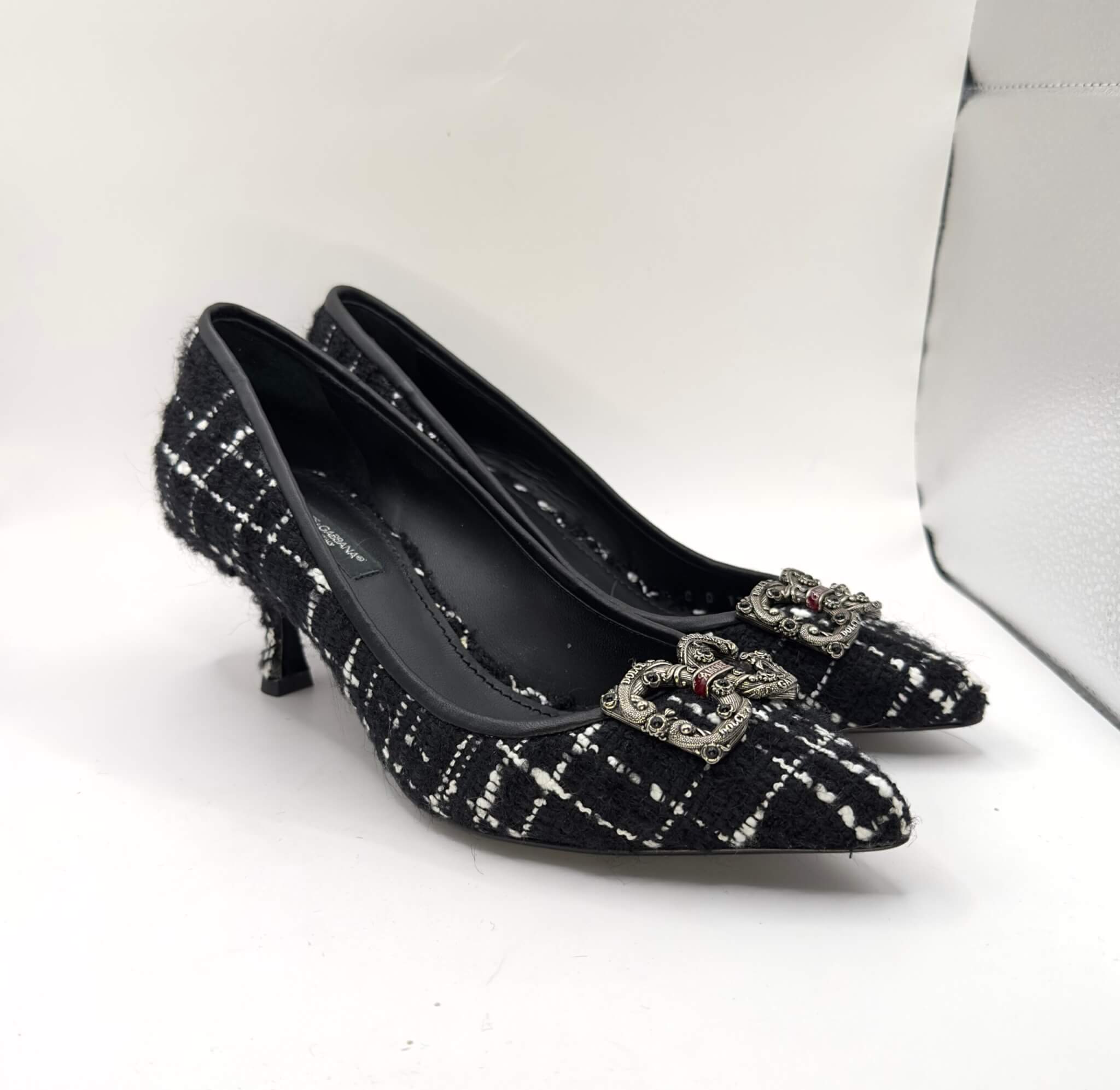 Escarpins Dolce & Gabbana en tweed bouclé noir et blanc, bout pointu et boucle bijou baroque en métal argent vieilli sur l’empeigne. Intérieur cuir noir, talon moyen. Avec boîte d’origine. État excellent, portées une heure. Une paire couture au charme milanais qui signe instantanément une silhouette chic et féminine.