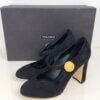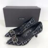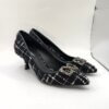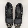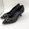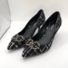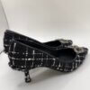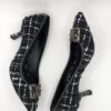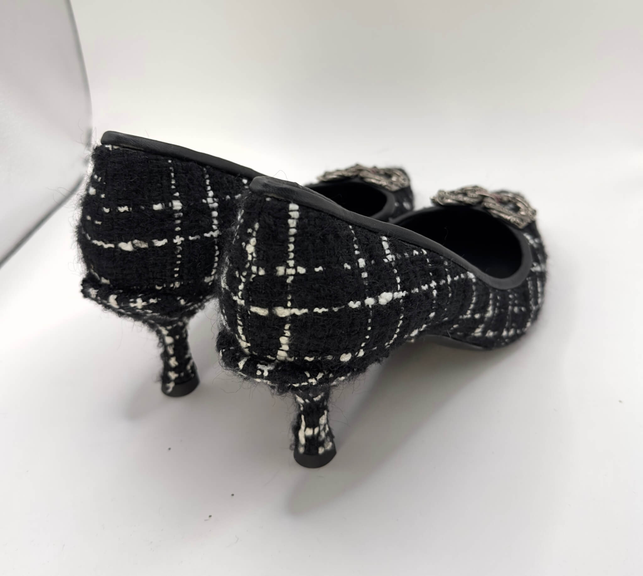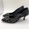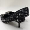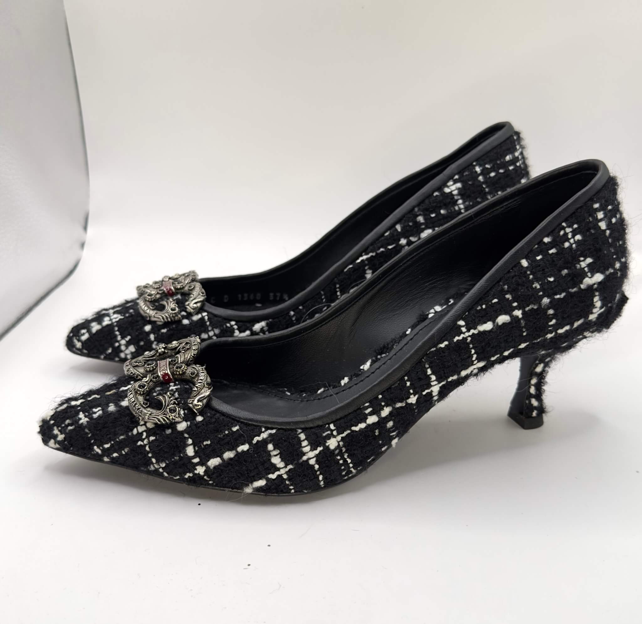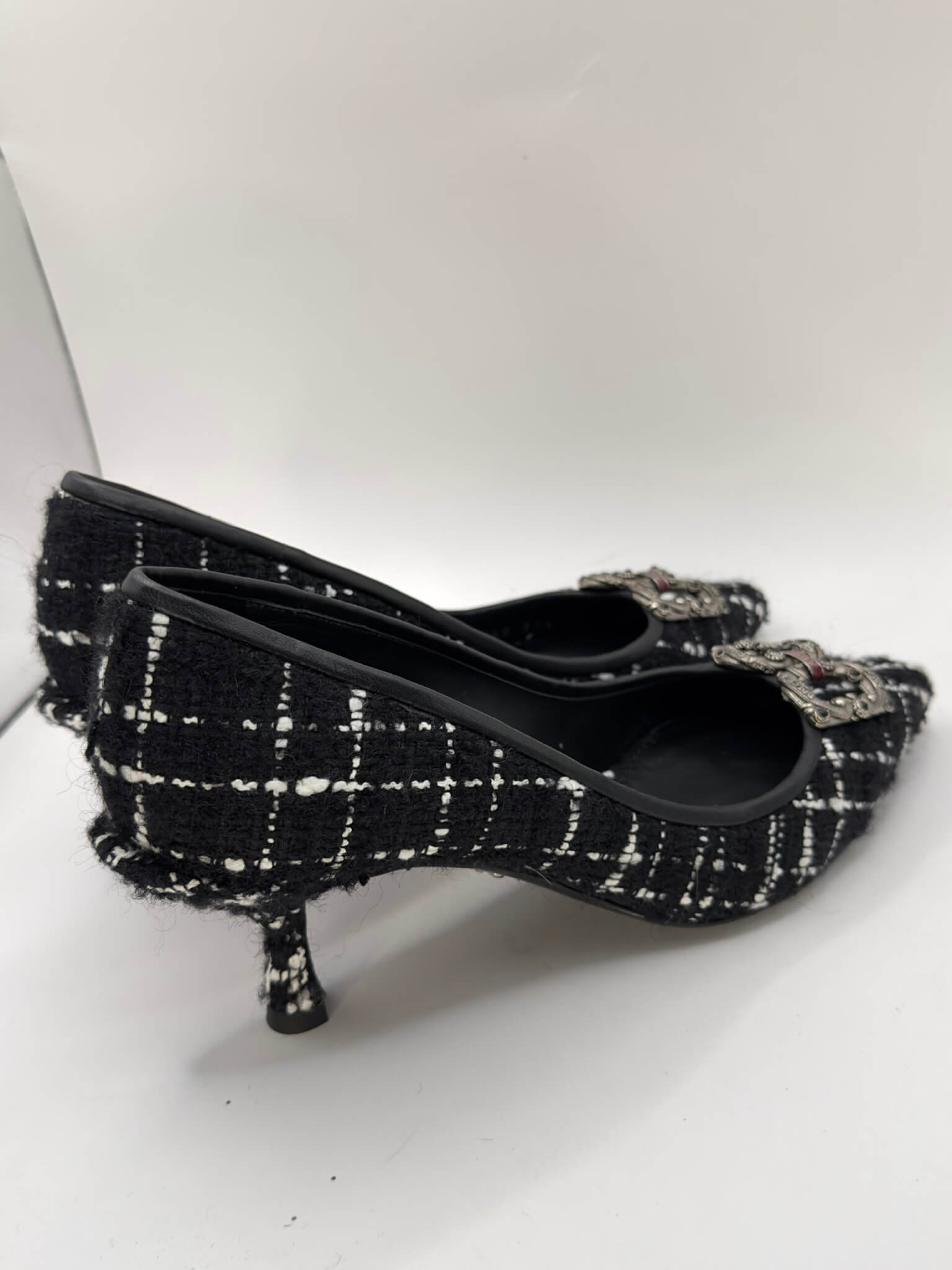 Escarpins Dolce & Gabbana en tweed bouclé noir et blanc, bout pointu et boucle bijou baroque en métal argent vieilli sur l’empeigne. Intérieur cuir noir, talon moyen. Avec boîte d’origine. État excellent, portées une heure. Une paire couture au charme milanais qui signe instantanément une silhouette chic et féminine.