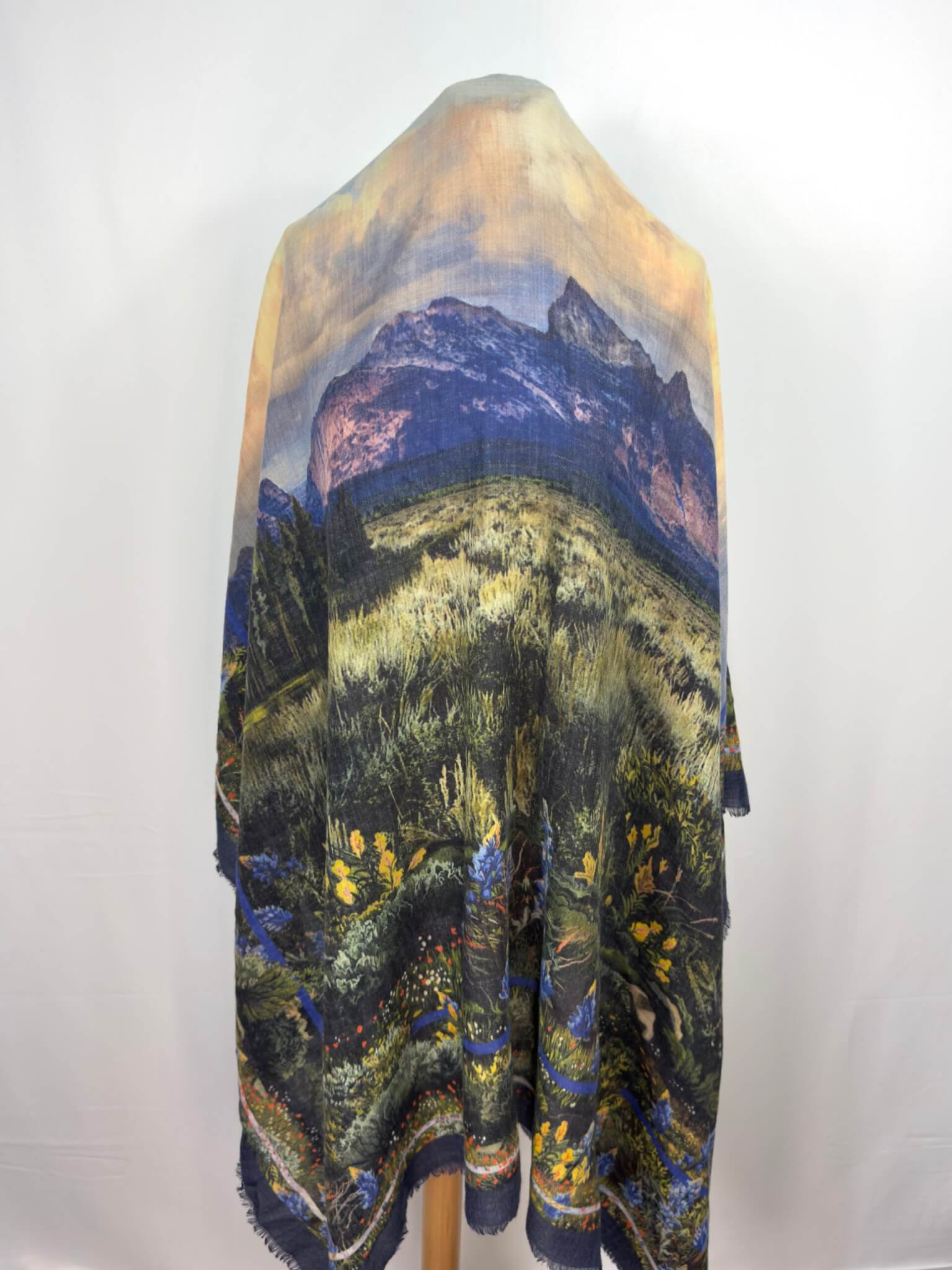 Foulard High en laine et soie, au motif montagne et coucher de soleil.