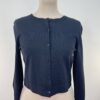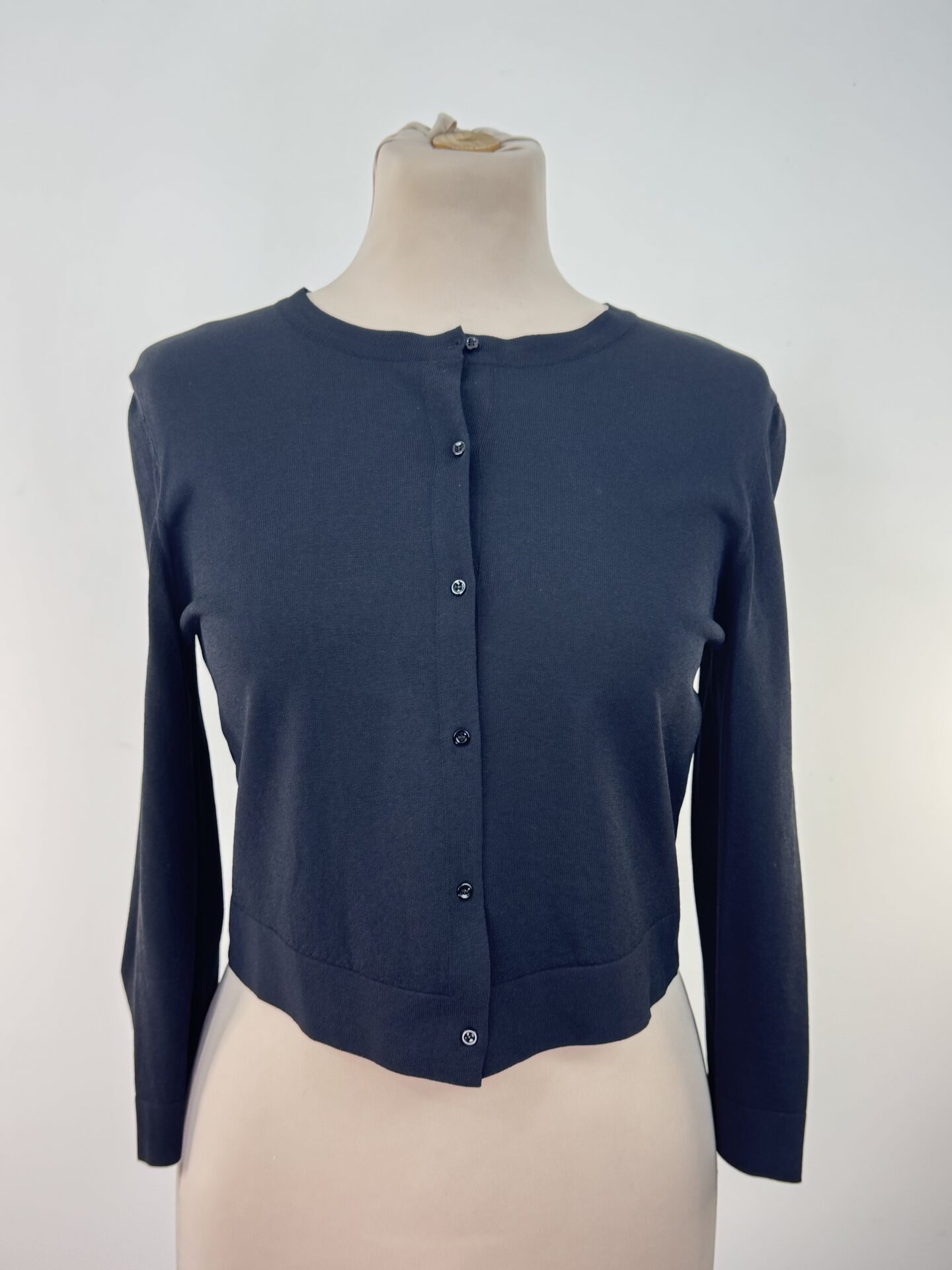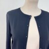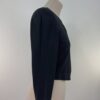 Gilet ALAÏA en maille fine noire type boléro, confectionné à 94% de viscose. Ce modèle à col rond présente une fermeture par petits boutons ton sur ton et des manches longues trois-quarts. Sa coupe ajustée et épurée incarne l’élégance minimaliste de la maison Alaïa.