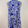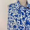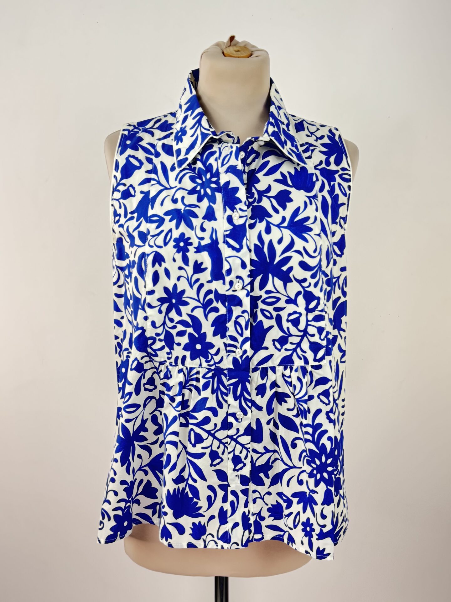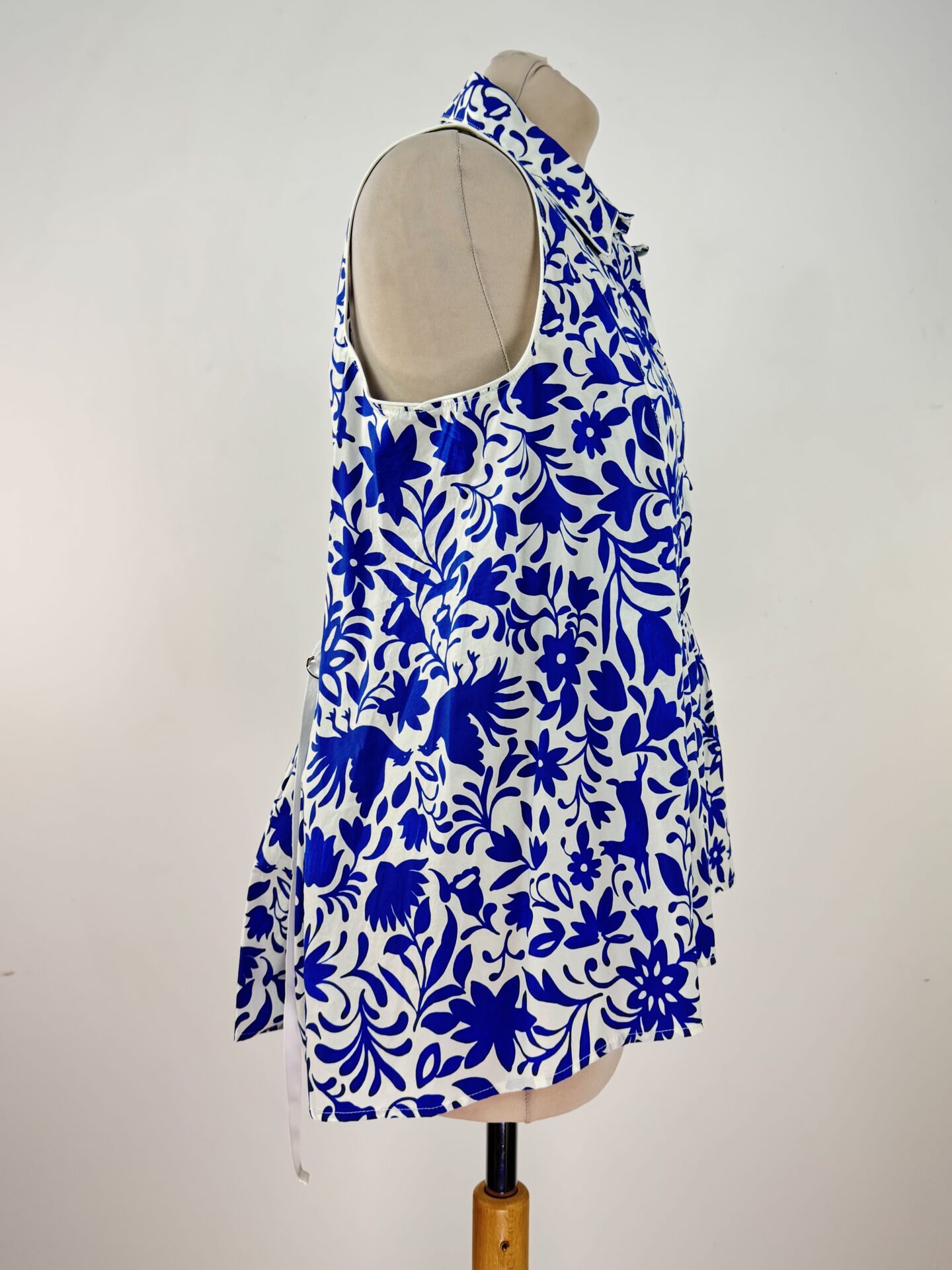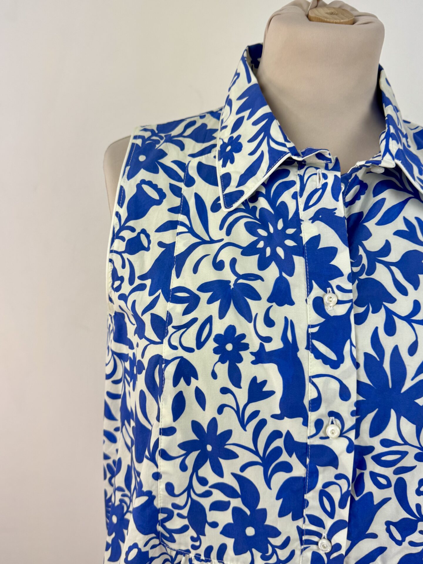 Chemisier sans manche High en coton à imprimé floral bleu sur fond blanc. Ce modèle sans manches adopte une coupe chemisier boutonnée devant avec col classique. Le dos est fendu et ceinturé par un lien qui structure la silhouette tout en laissant un effet fluide et léger.