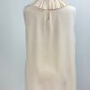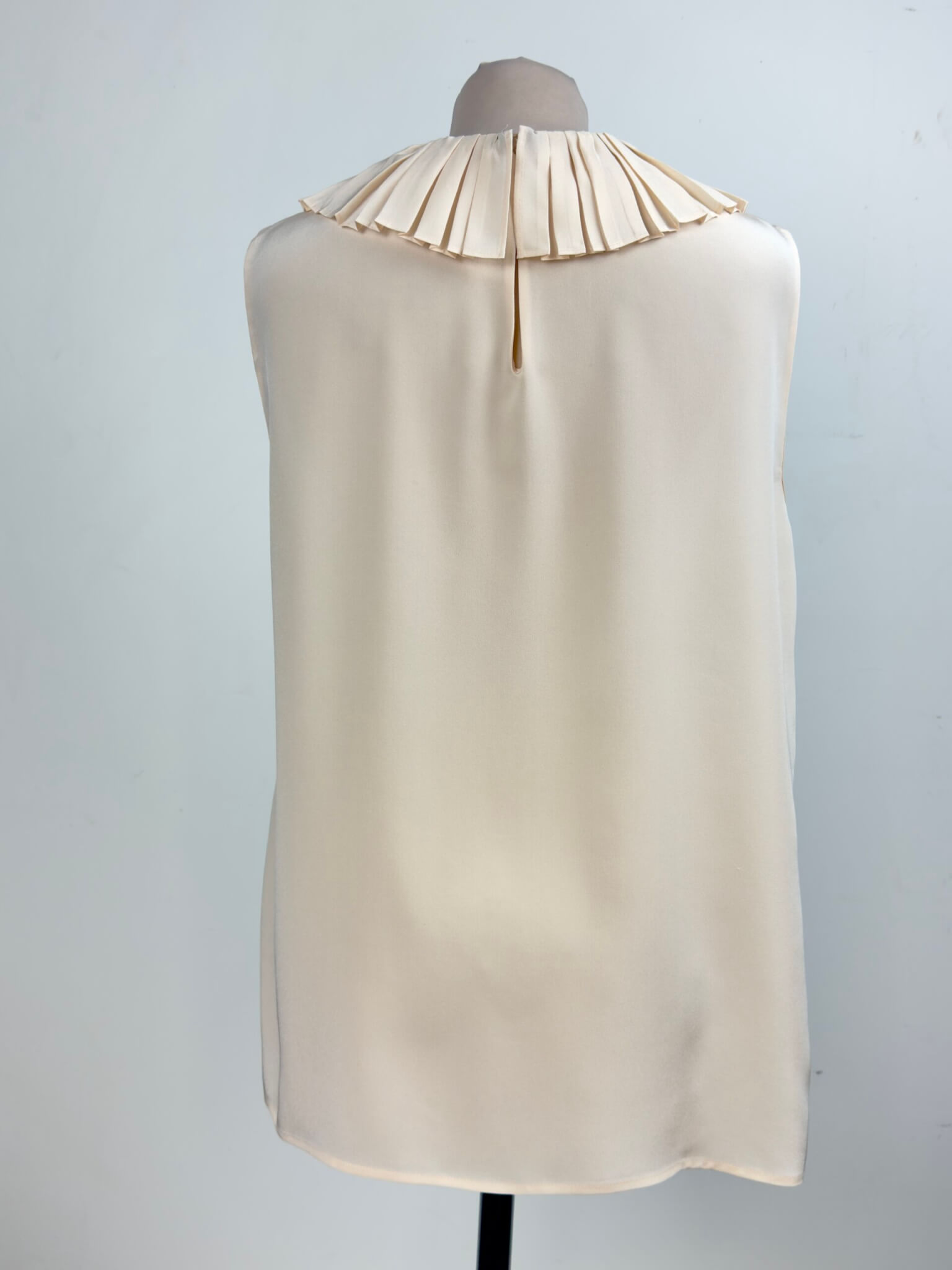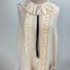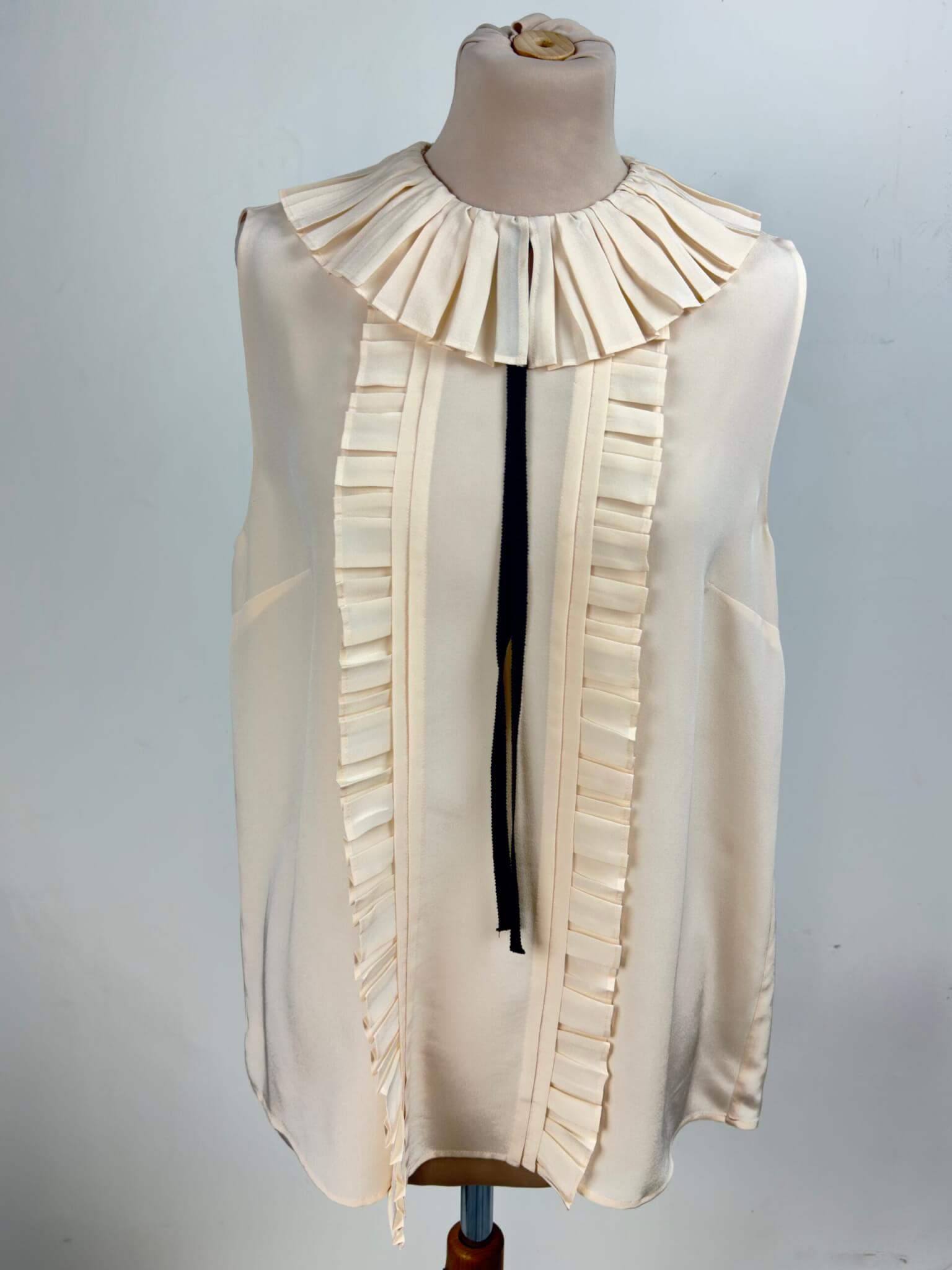 Haut Miu Miu en soie rose poudré, taille 40. Modèle sans manches, orné de volants plissés et d’un petit ruban noir sur le devant. L’étiquette de composition a été retirée car elle grattait, mais l’étiquette de la marque est bien présente. Très bon état général.