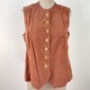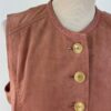Gilet sans manches HIGH en cuir et daim rose. Le devant est travaillé en daim souple avec une fermeture à larges boutons contrastés, tandis que le dos en cuir lisse est structuré par des découpes et rehaussé d’un basque plissé féminin. Le col rond et les finitions piquées ajoutent une touche élégante et originale.