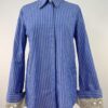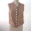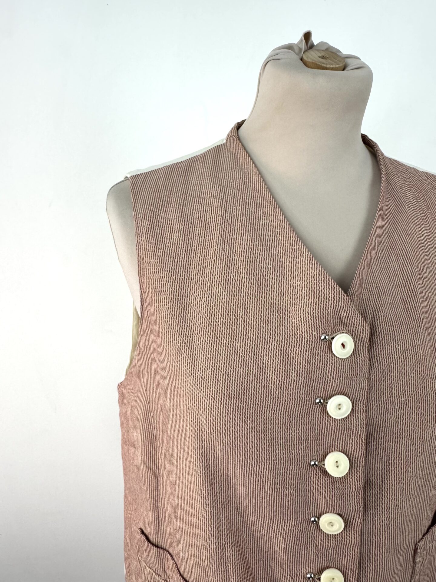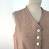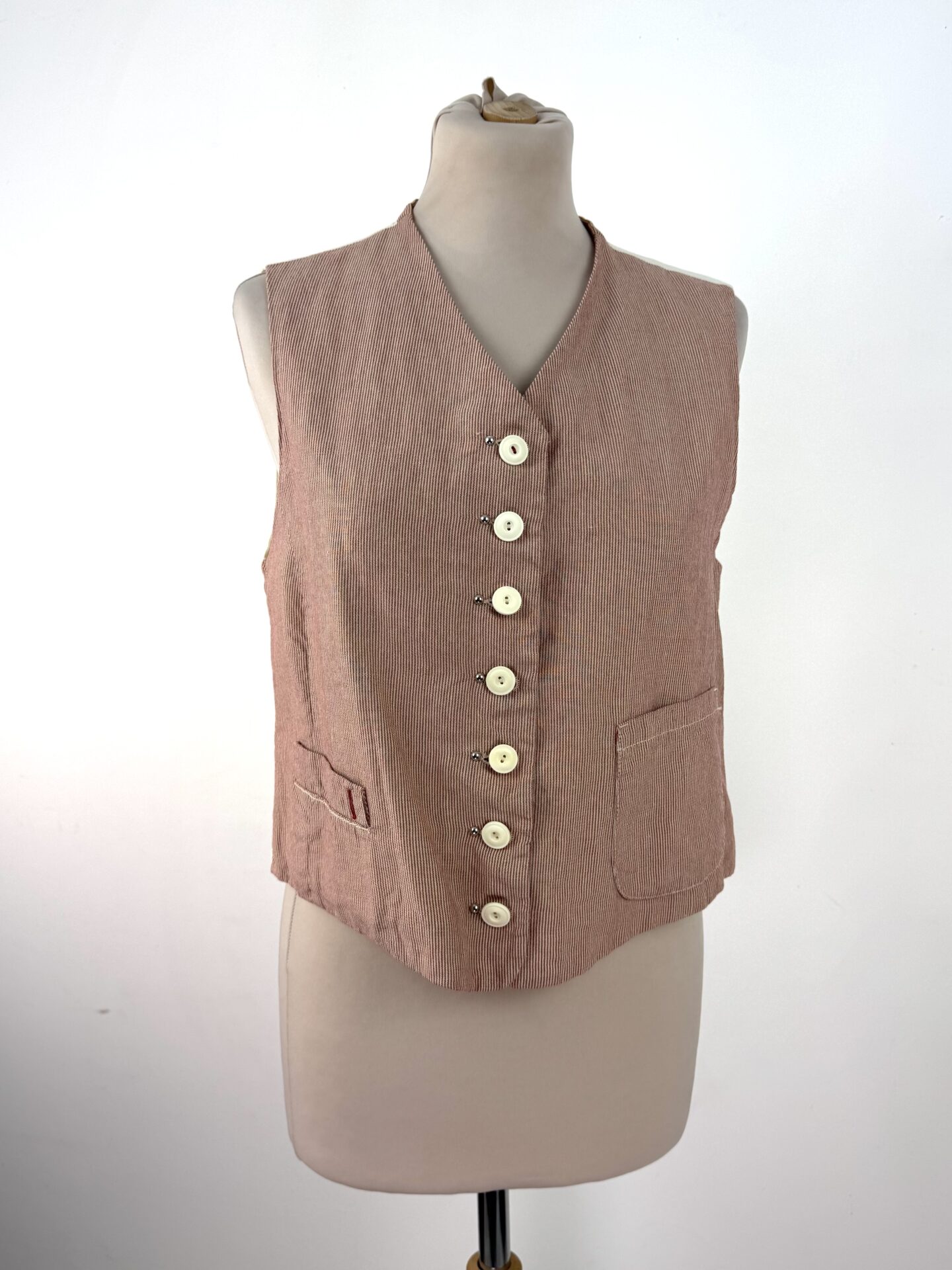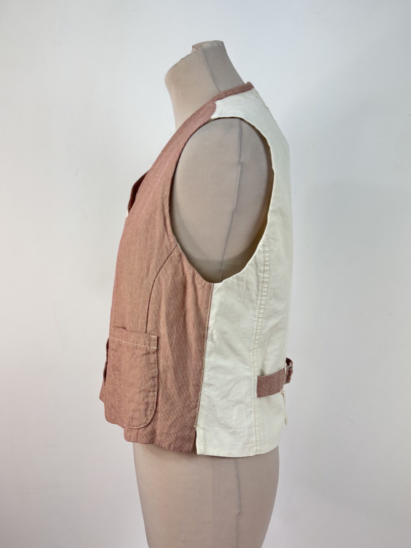 Gilet sans manches HIGH à fines rayures rouges et blanches, en coton et lin, doté d’une fermeture boutonnée sur le devant et de deux petites poches plaquées. Le dos en coton écru est orné d’un empiècement brodé multicolore et d’une martingale ajustable ton sur ton.