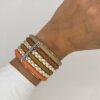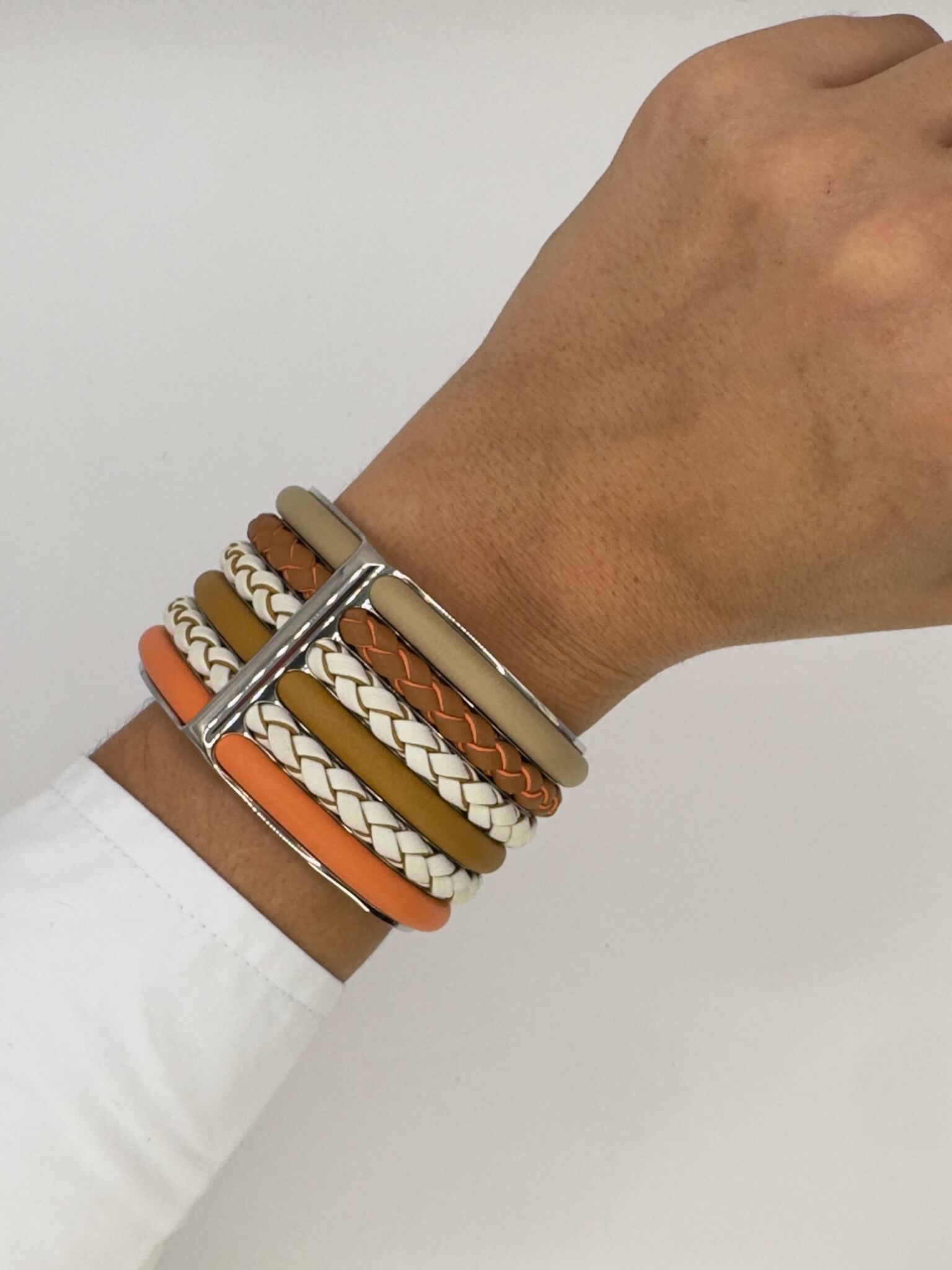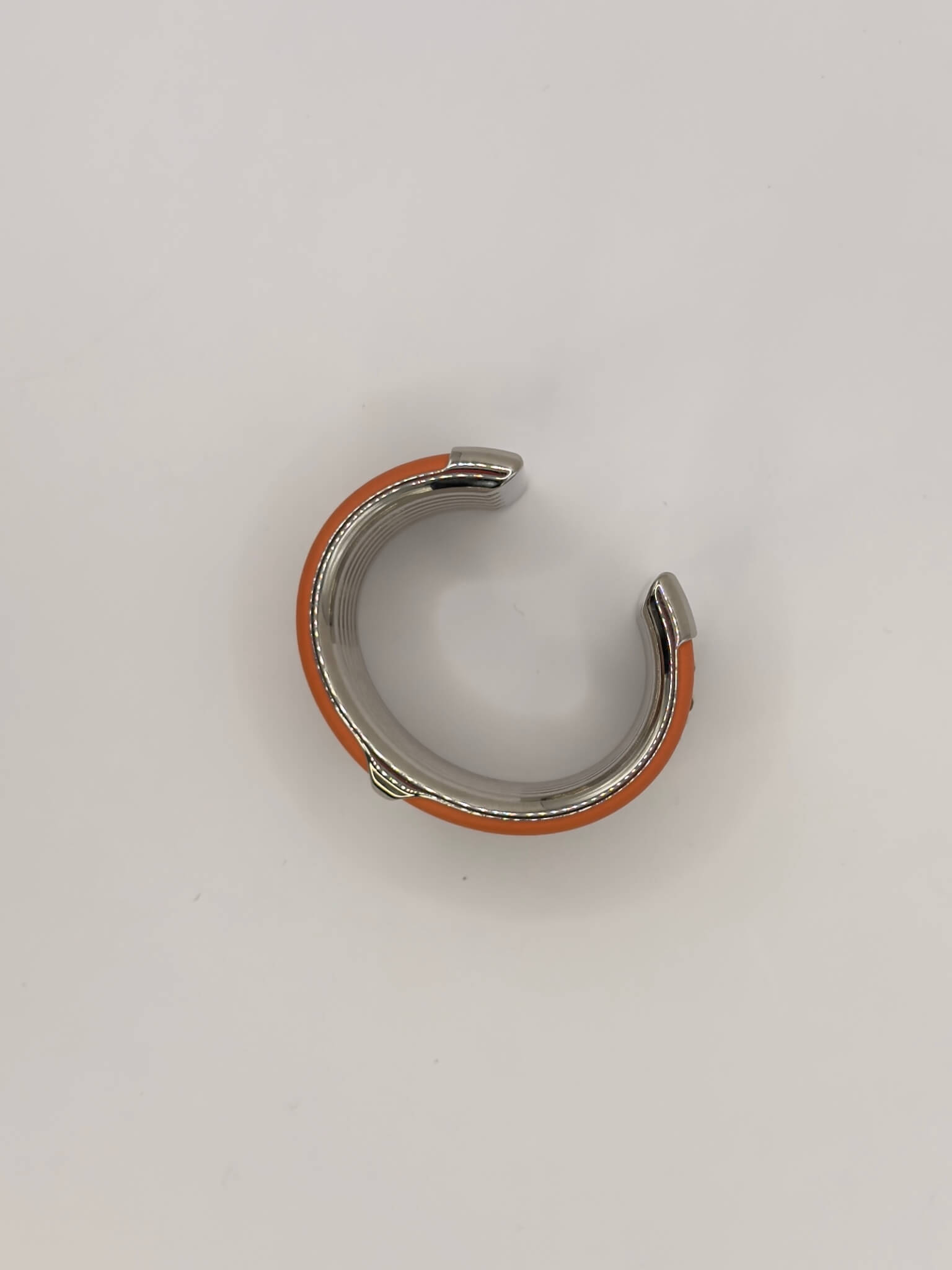 Ce bracelet Hermès est une pièce rare au design très reconnaissable, composé de plusieurs liens en cuir tressé dans des tons corail, sable, caramel et blanc, réunis par une structure métallique sophistiquée. Son mélange de couleurs et de textures en fait un bijou à la fois moderne et iconique, typique du savoir-faire de la maison. Proposé avec sa boîte Hermès et son livret, il est en très bon état. Une pièce forte qui apporte immédiatement du style et de la personnalité à une tenue.