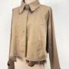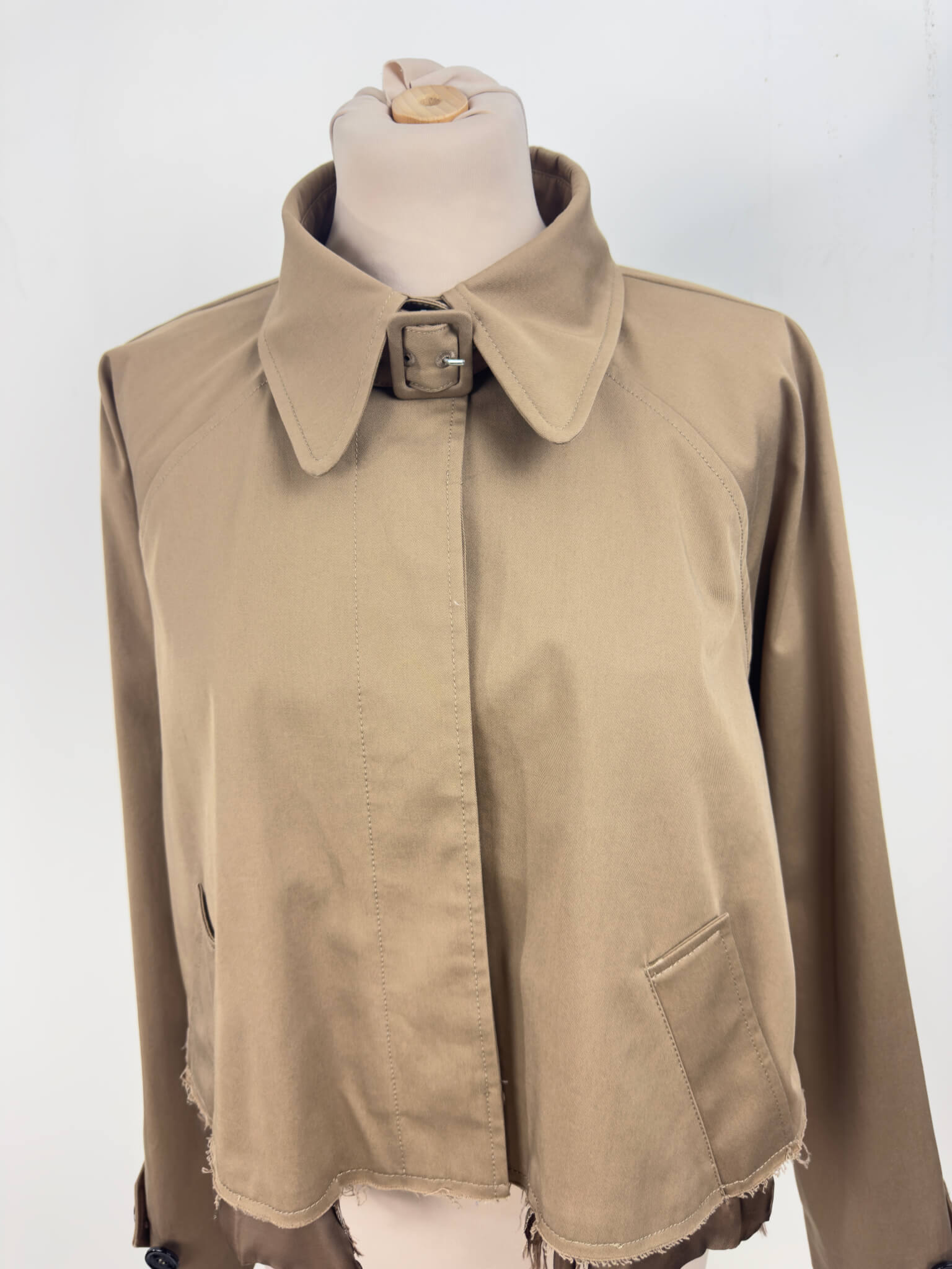Veste courte MM6 Maison Margiela en viscose beige, taille 40. Modèle signature à effet effiloché sur le bas, pour une allure déstructurée typique de la maison. Col chemise avec boucle, poches latérales et boutons noirs contrastants. Très bon état général.