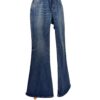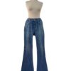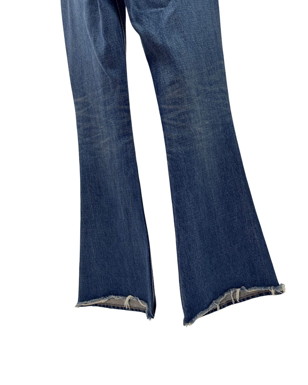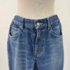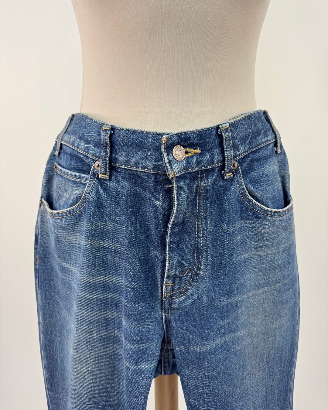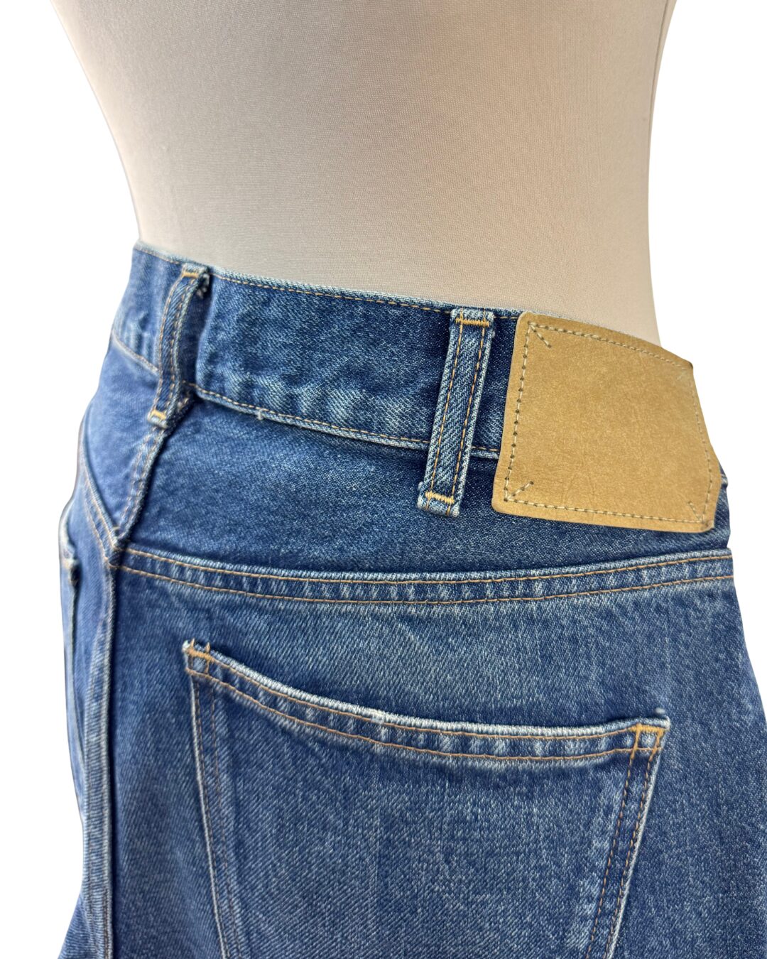 Jean Céline en denim brut bleu à la coupe large et évasée. Taille haute flatteuse, longueur généreuse parfaite pour les grandes silhouettes. Effet usé discret sur l’arrière pour un rendu mode et authentique. Confectionné en 100 % coton, il allie confort et allure sophistiquée.