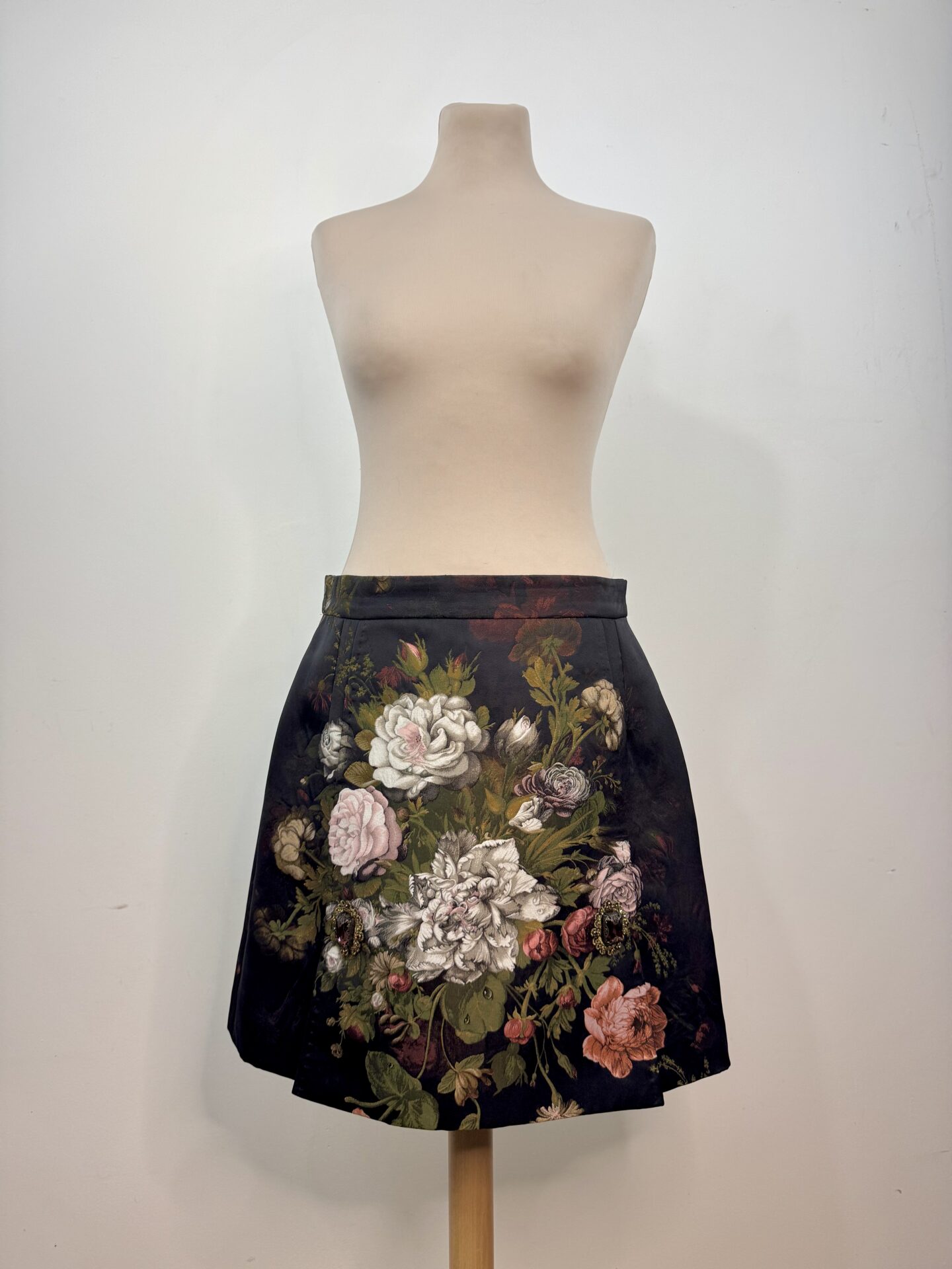 Jupe Dolce & Gabbana au fond noir orné d’un somptueux motif floral et bijoux