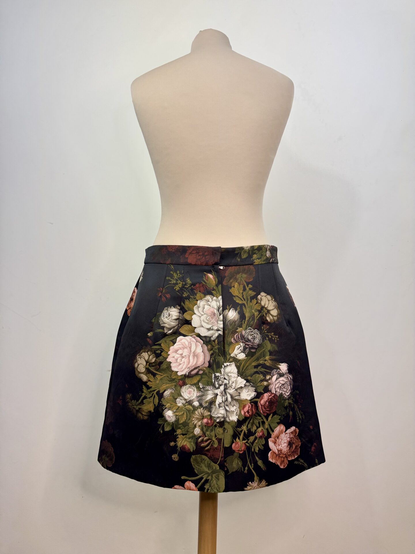 Jupe Dolce & Gabbana en taille 42, au fond noir orné d’un somptueux motif floral. La pièce est sublimée par deux imposants bijoux appliqués, signature du style baroque de la maison italienne. Sa coupe évasée et structurée apporte une allure féminine et élégante, parfaite pour les grandes occasions.