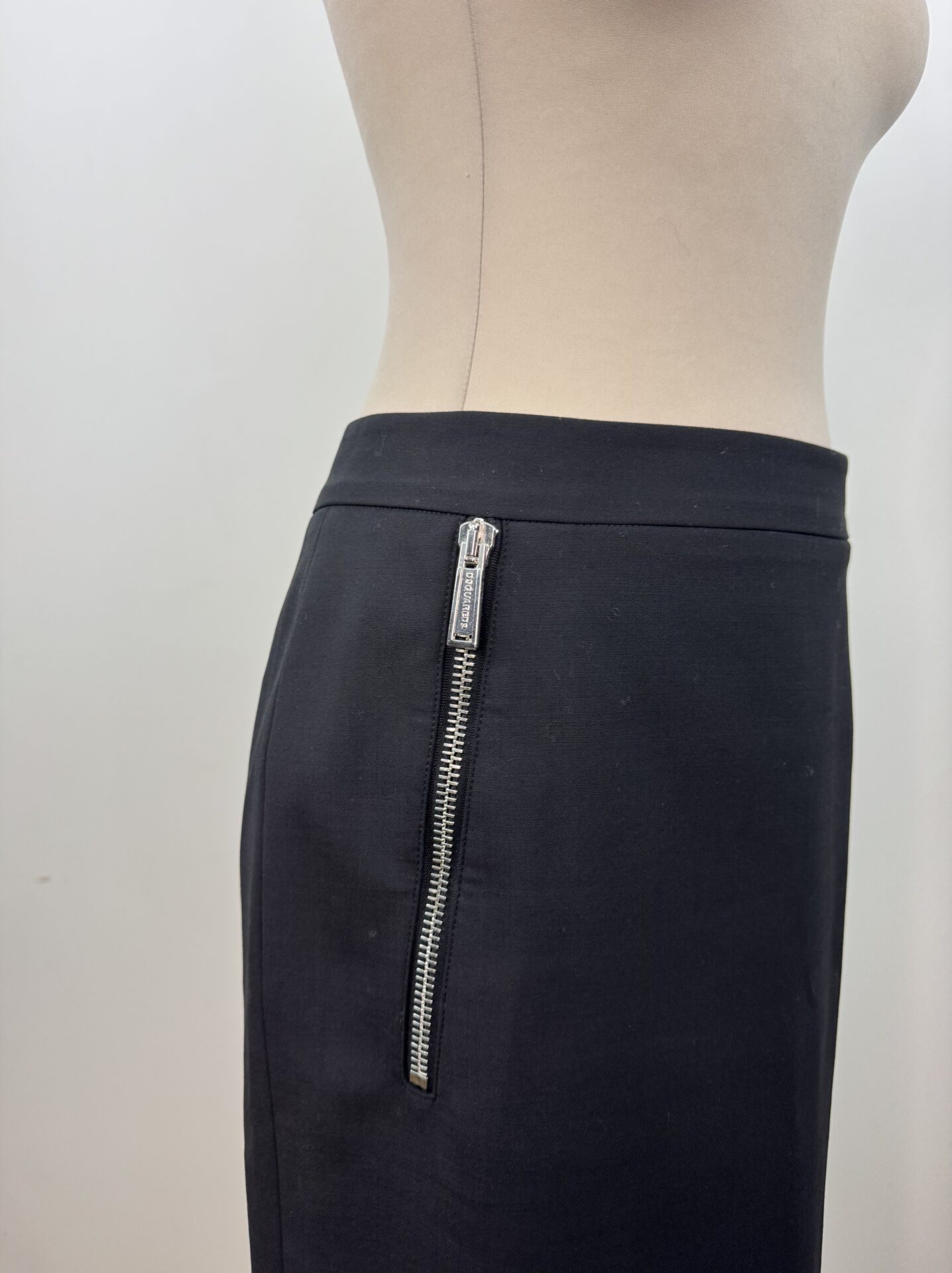 Jupe Dsquared noire, coupe droite, fermeture zippée apparente sur le côté qui apporte une touche moderne et graphique. Sobre et facile à associer, c’est une pièce polyvalente qui peut se porter aussi bien en journée qu’en soirée. 95% laine