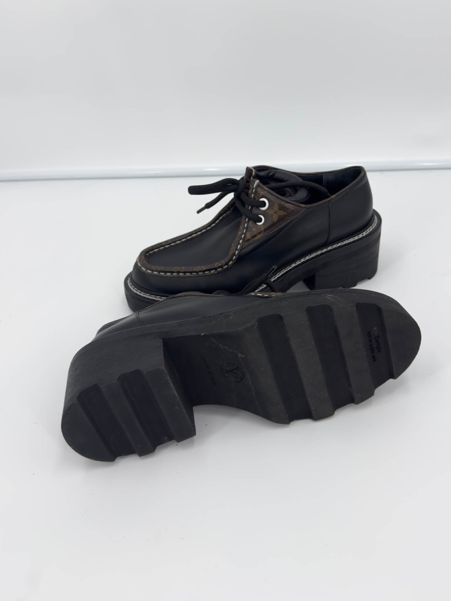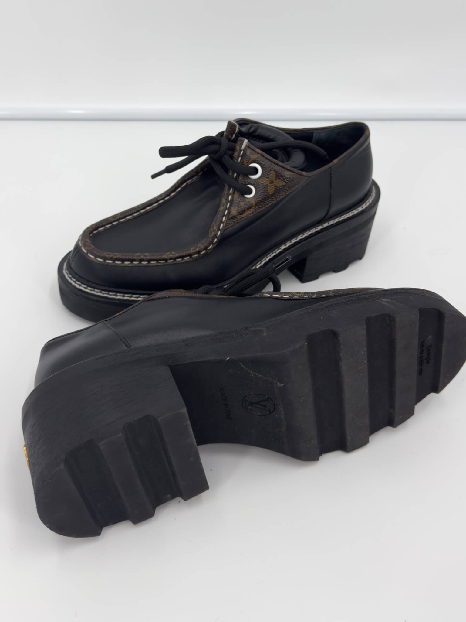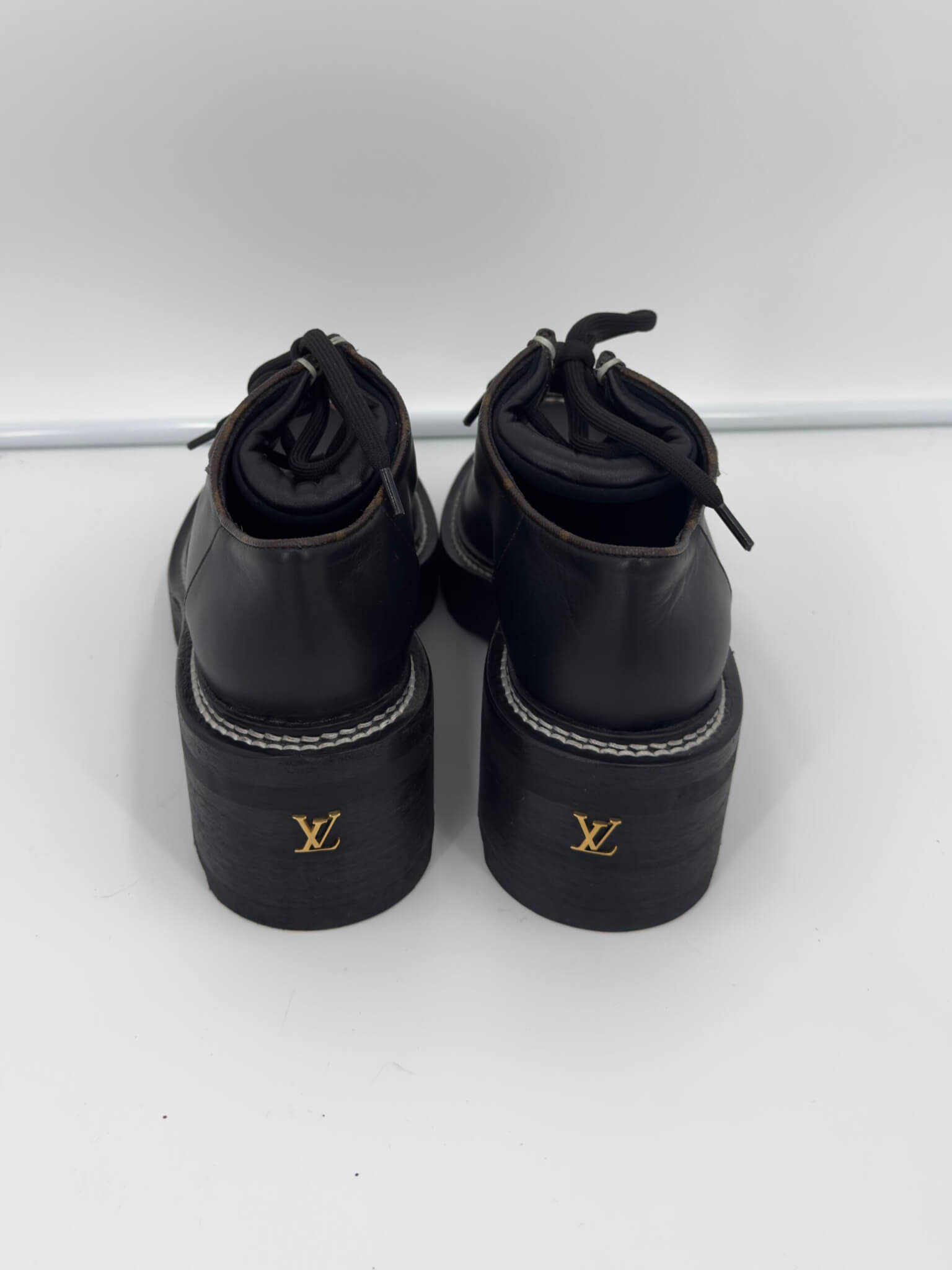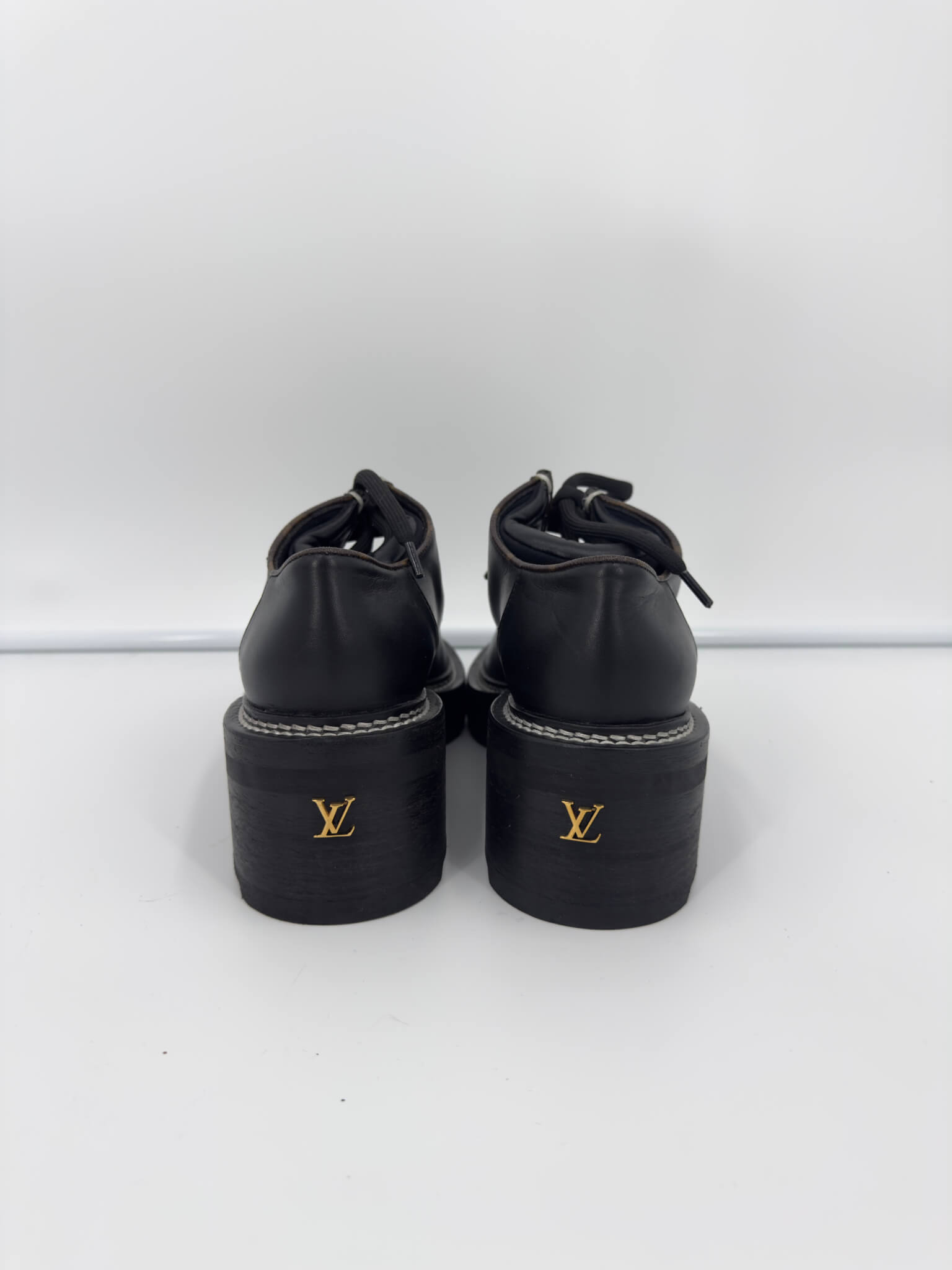 Semelles épaisses et talons robustes ornés du logo LV doré.