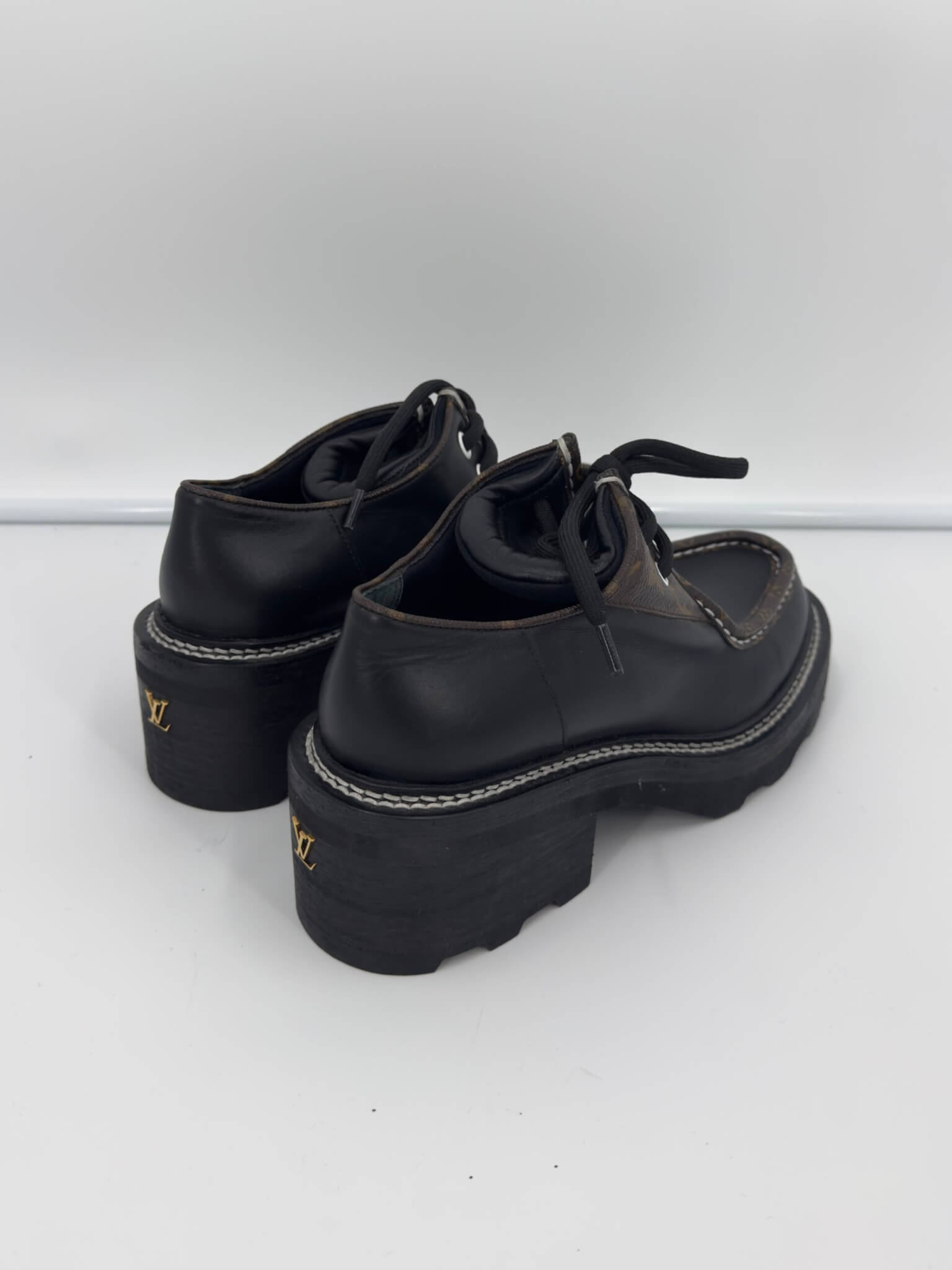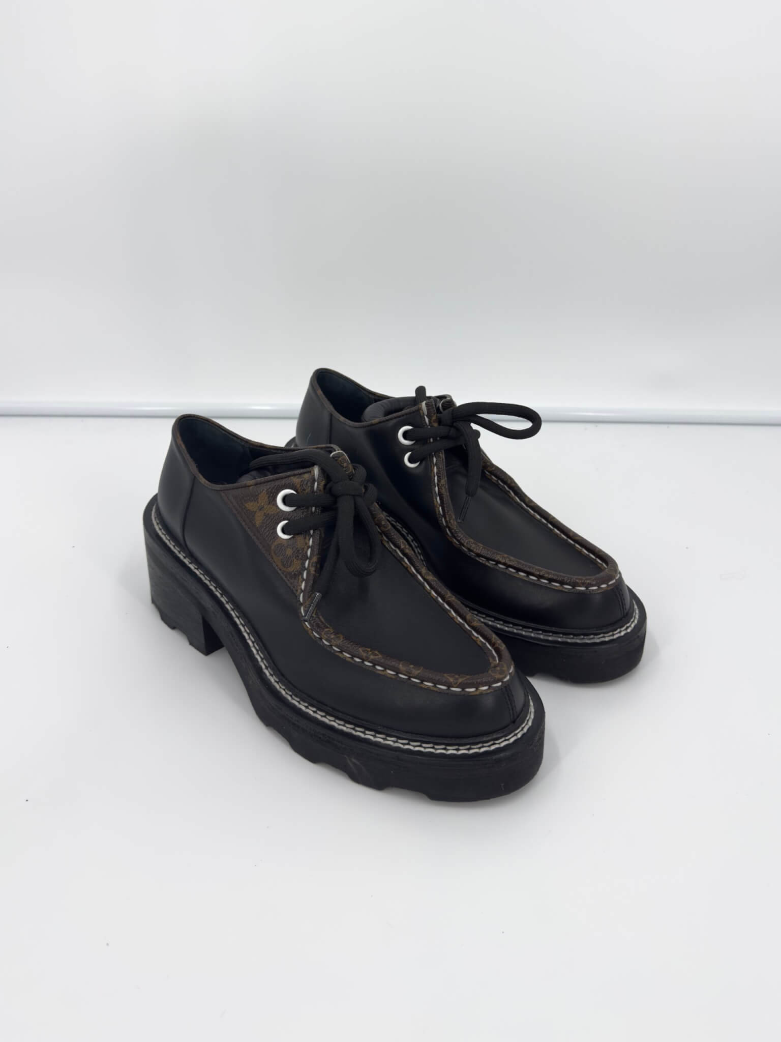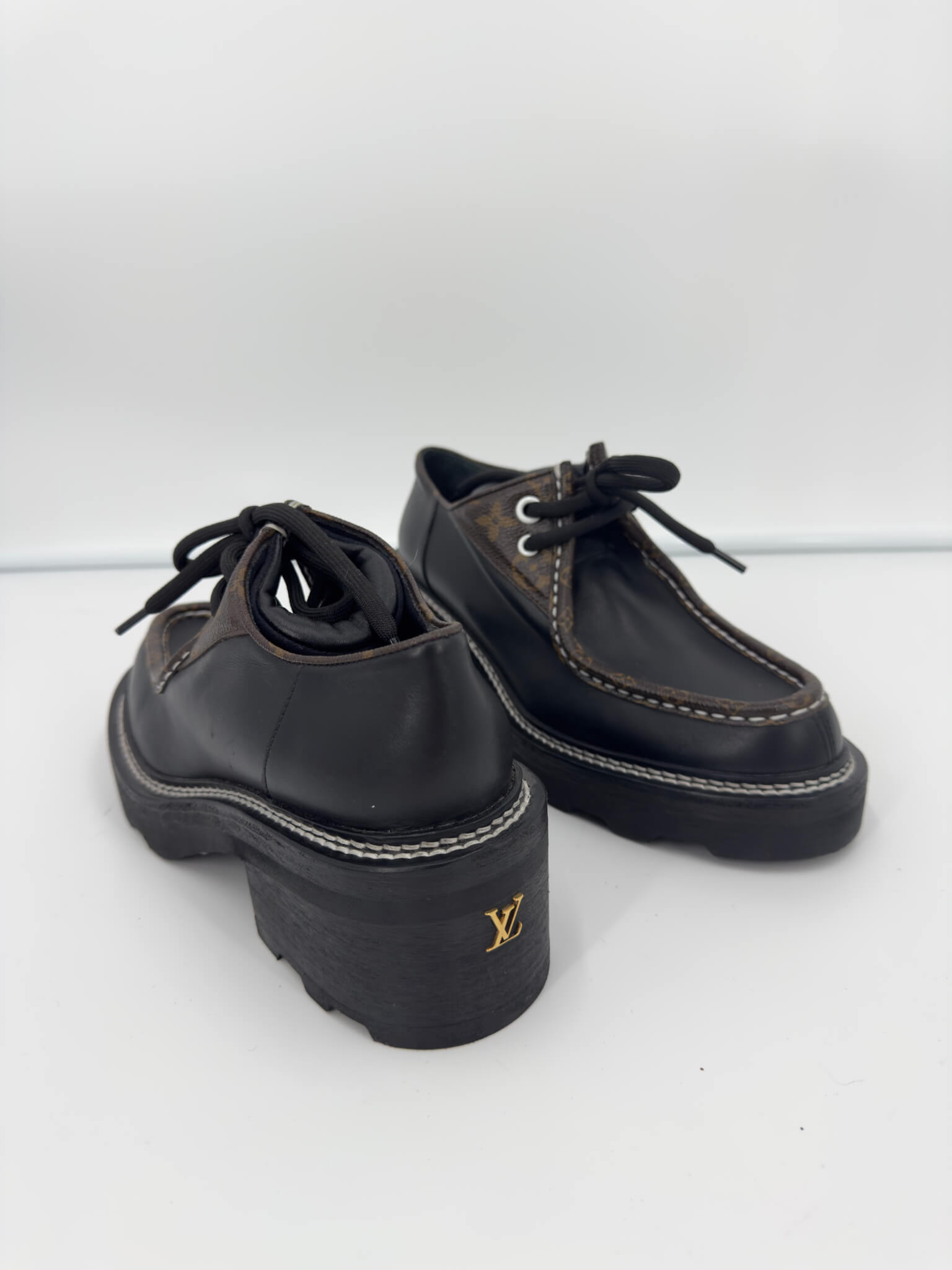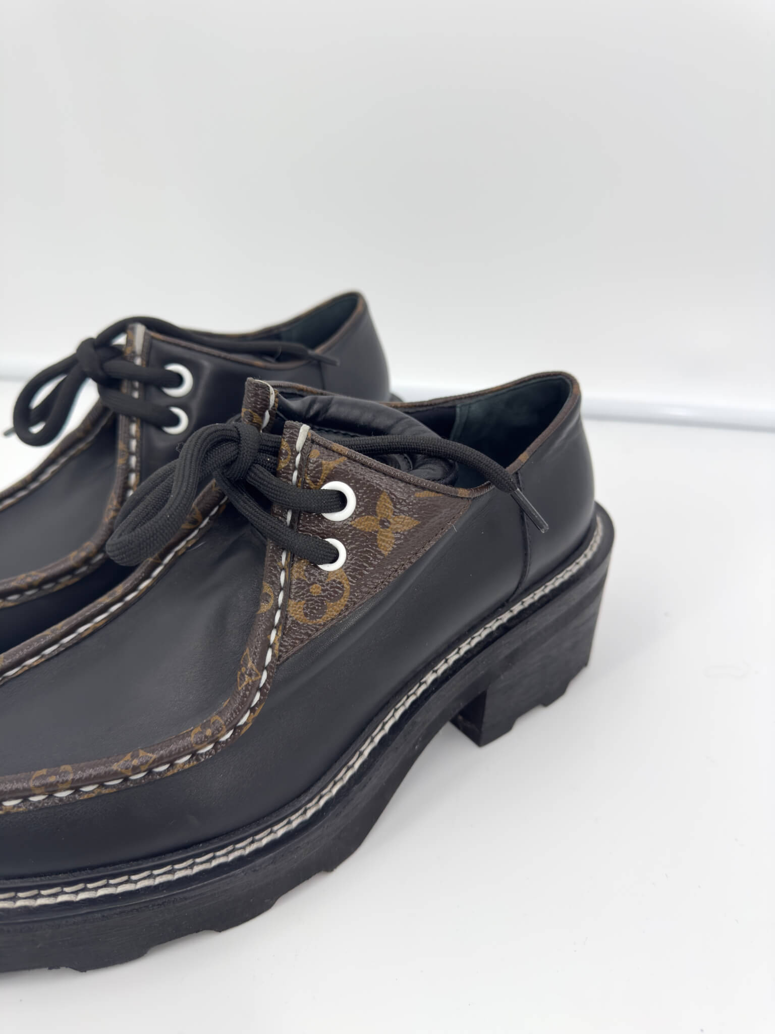Semelles épaisses et talons robustes ornés du logo LV doré.
