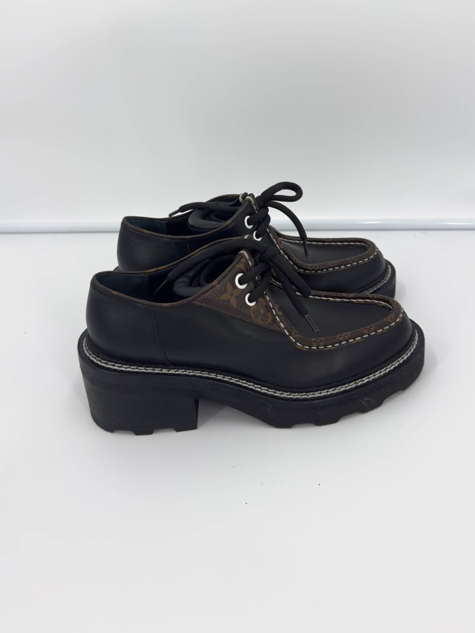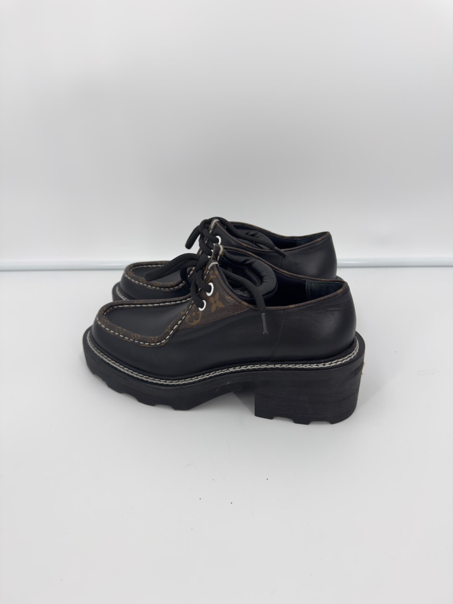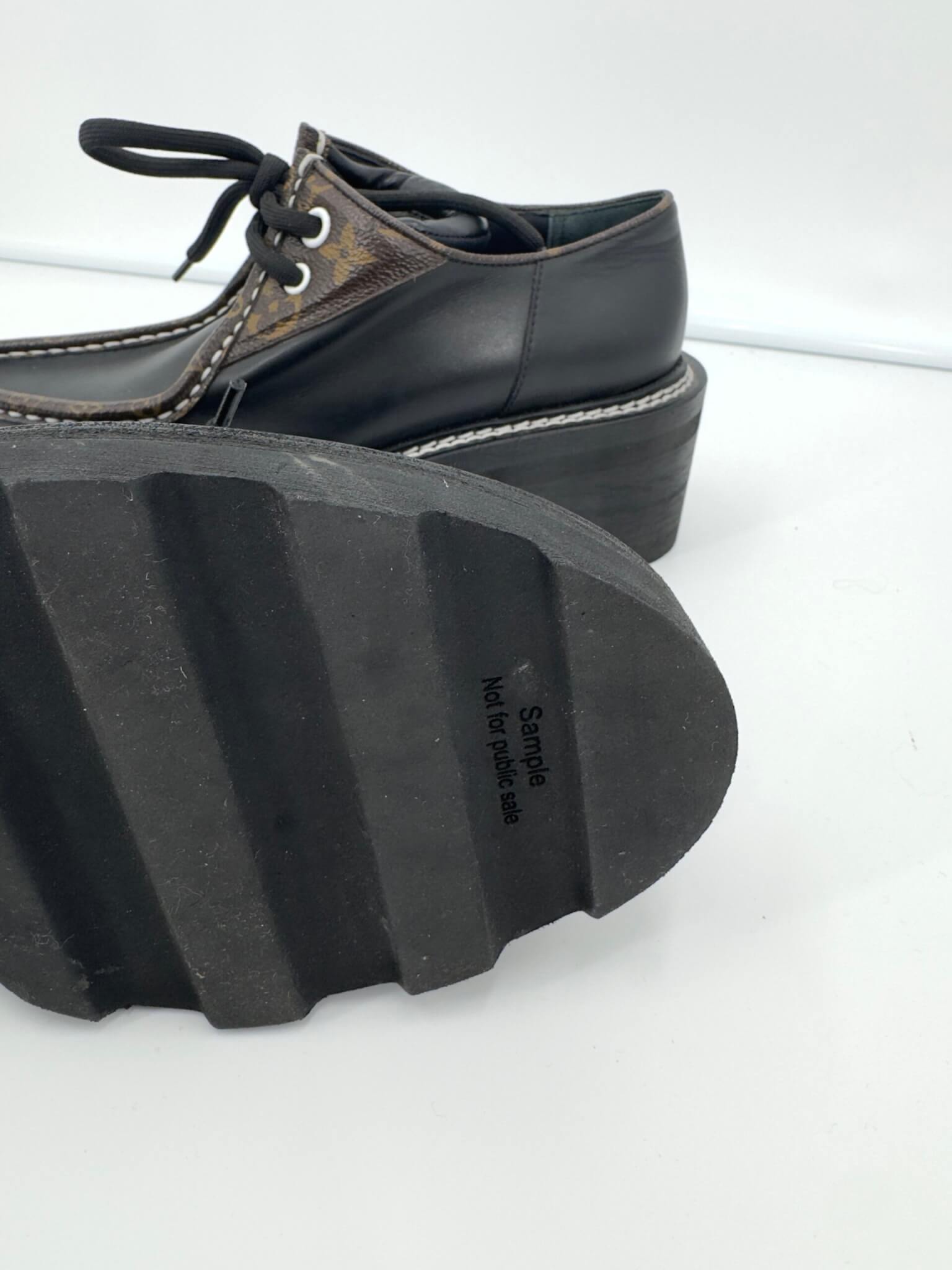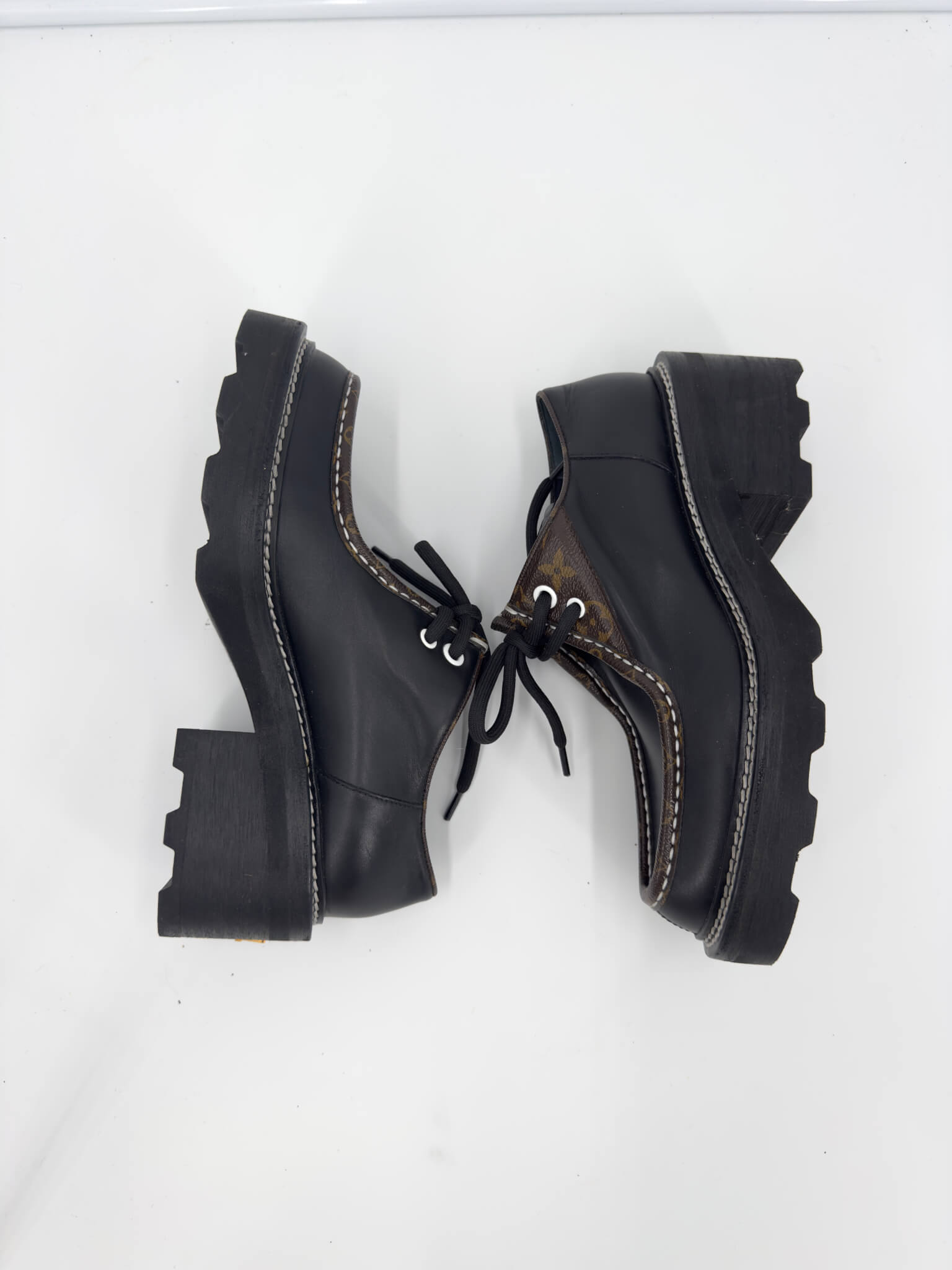 Semelles épaisses et talons robustes ornés du logo LV doré.