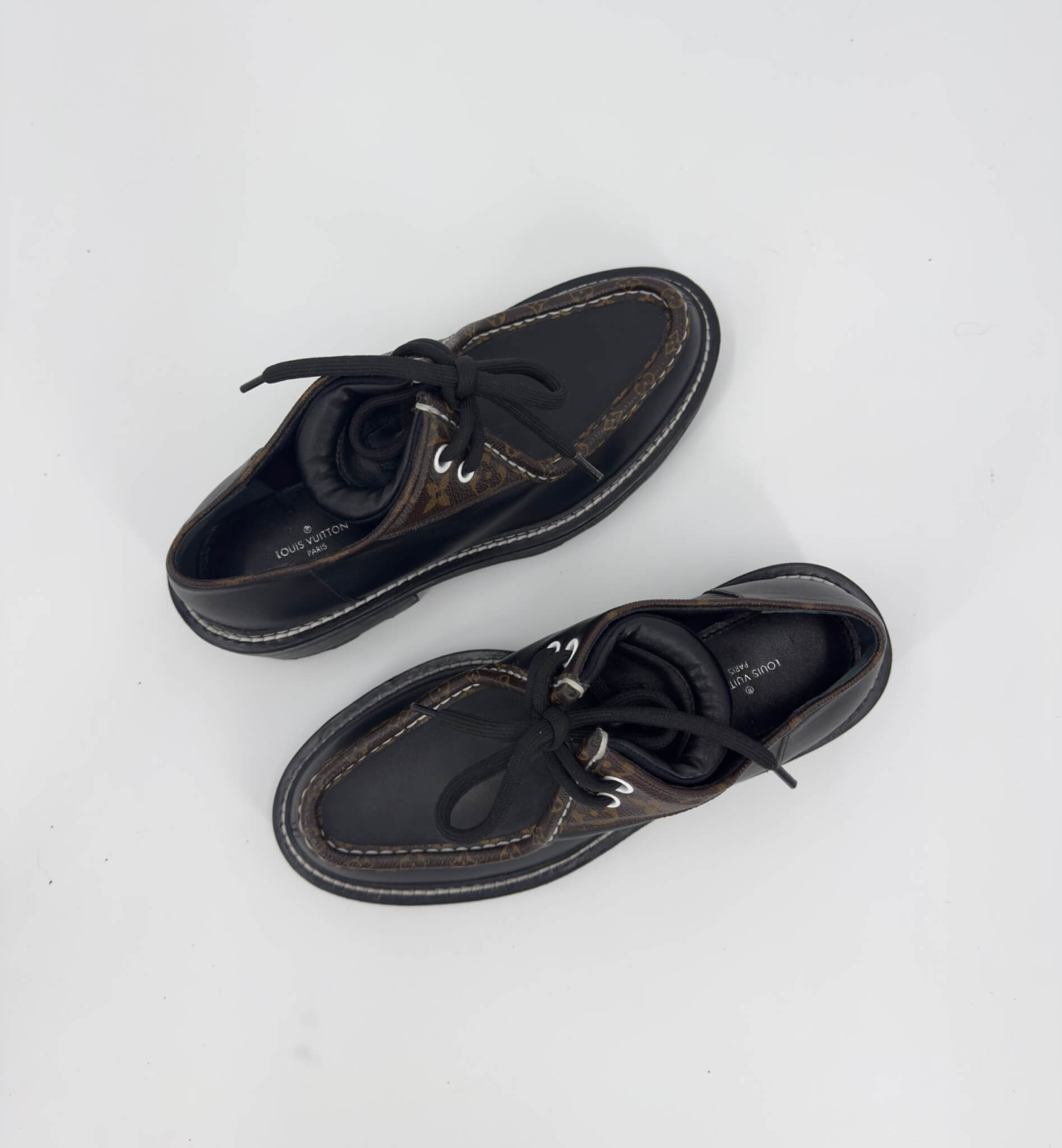 Chaussures loafers Louis Vuitton en cuir noir avec détails en toile Monogram