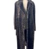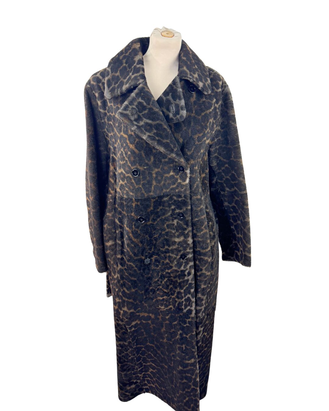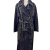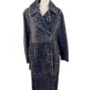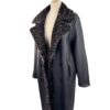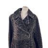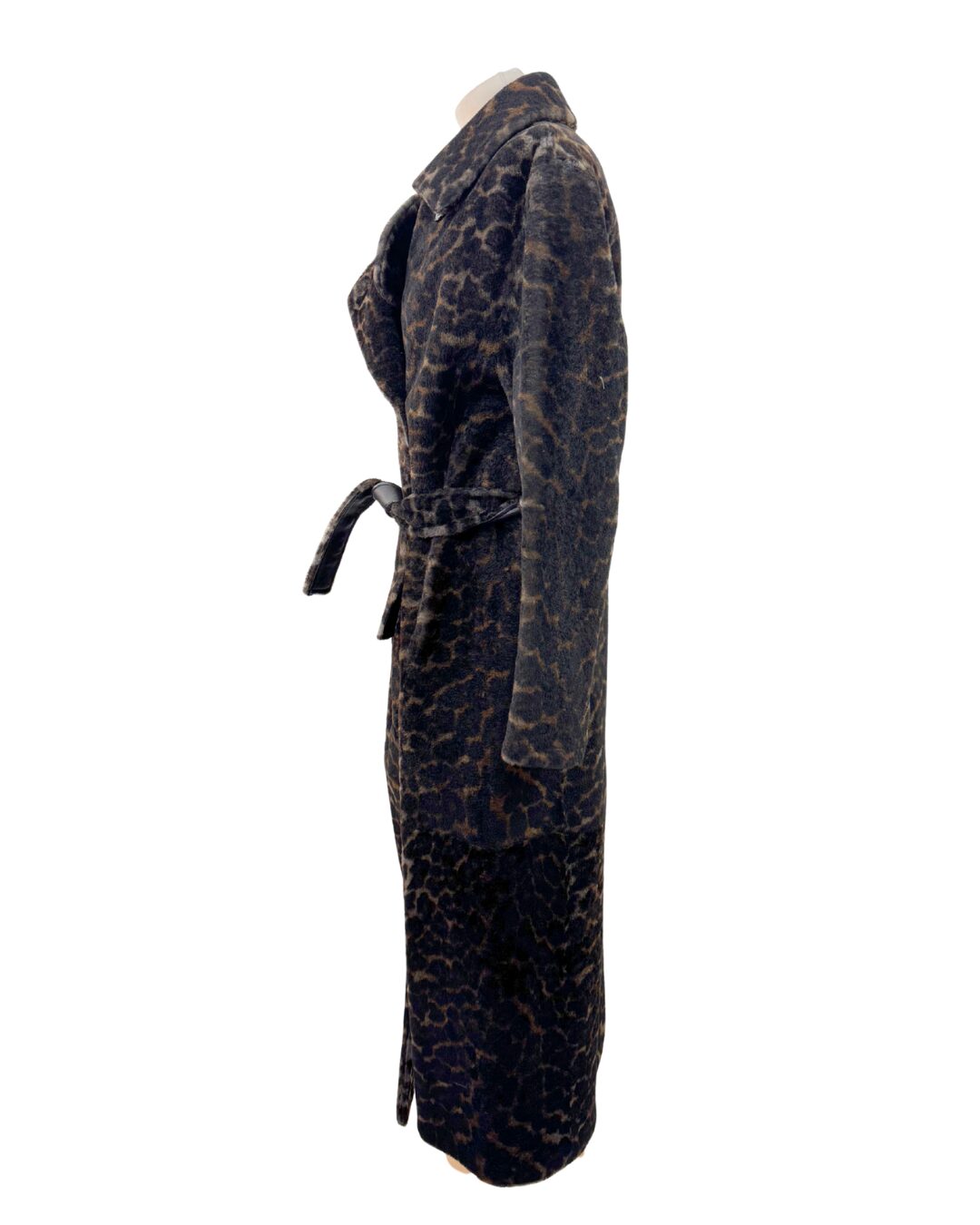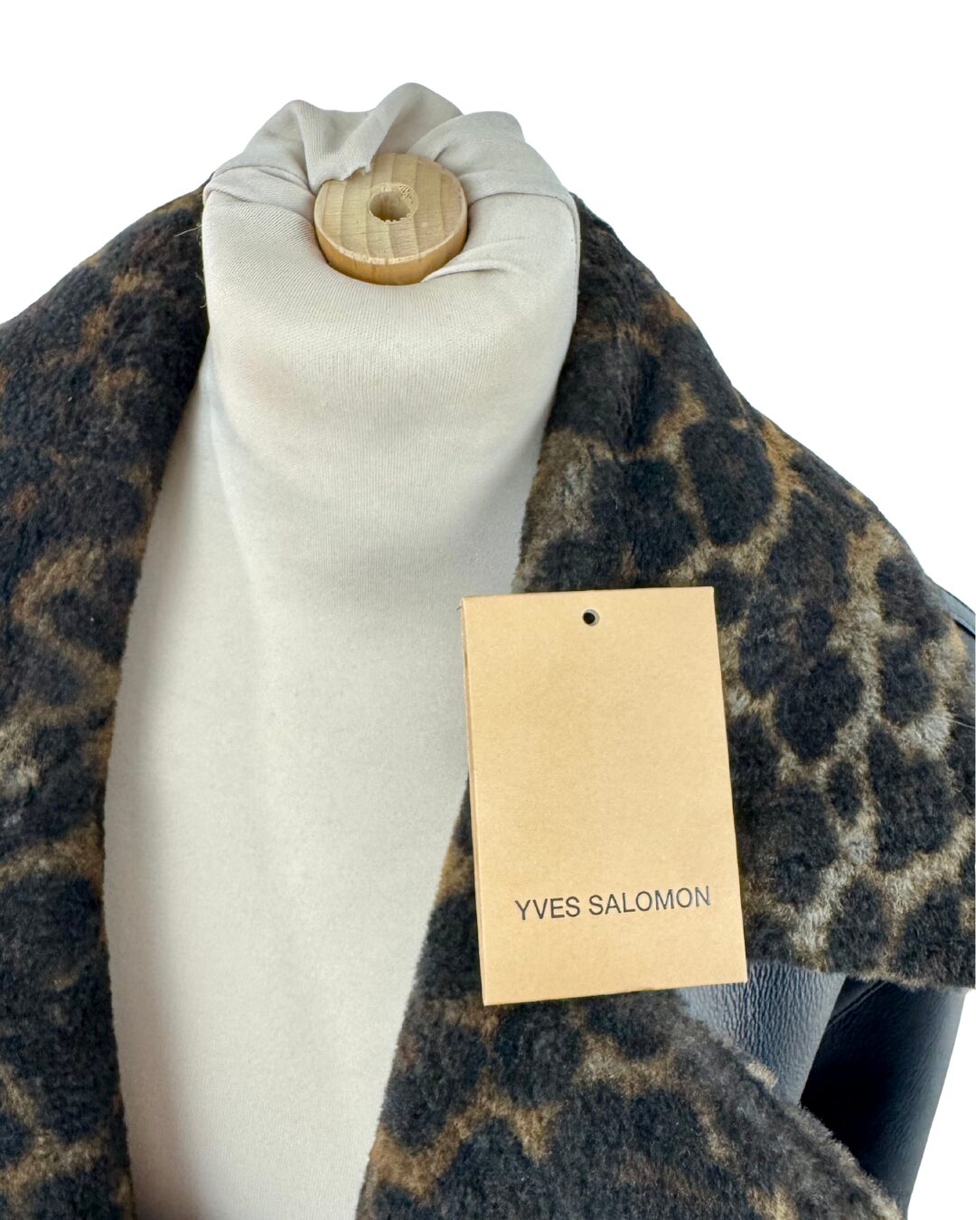 Manteau long réversible Yves Salomon en cuir véritable et mouton retourné. 100% agneau. Ce modèle présente un côté en cuir lisse noir et un côté en fourrure effet léopard, permettant deux styles en une seule pièce. Sa coupe longue et droite est dotée d’un double boutonnage, d’un large col à revers et d’une ceinture amovible en cuir qui souligne la taille.