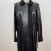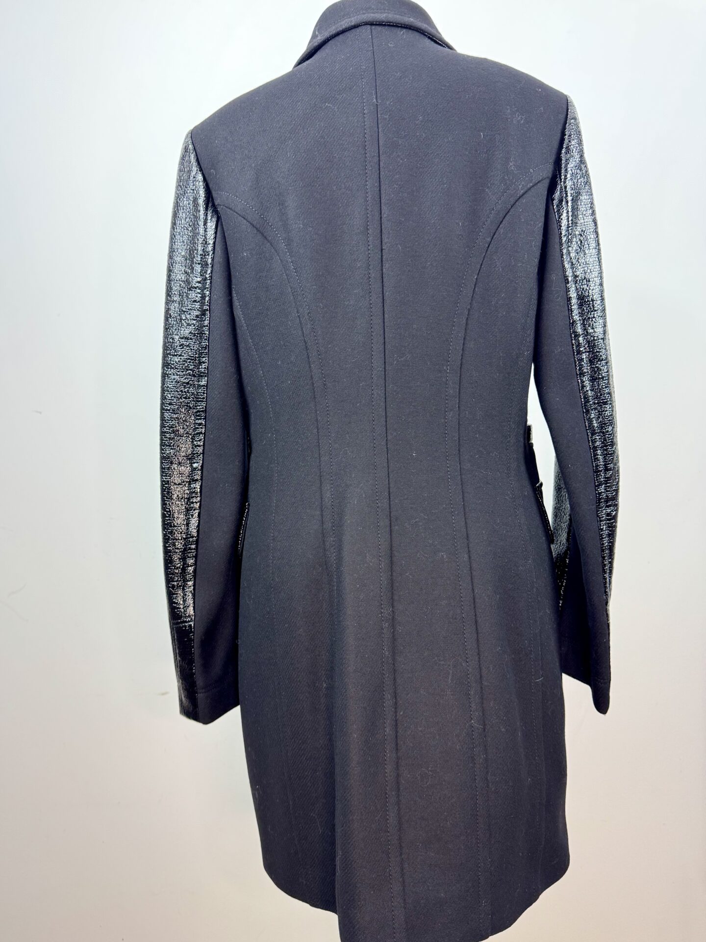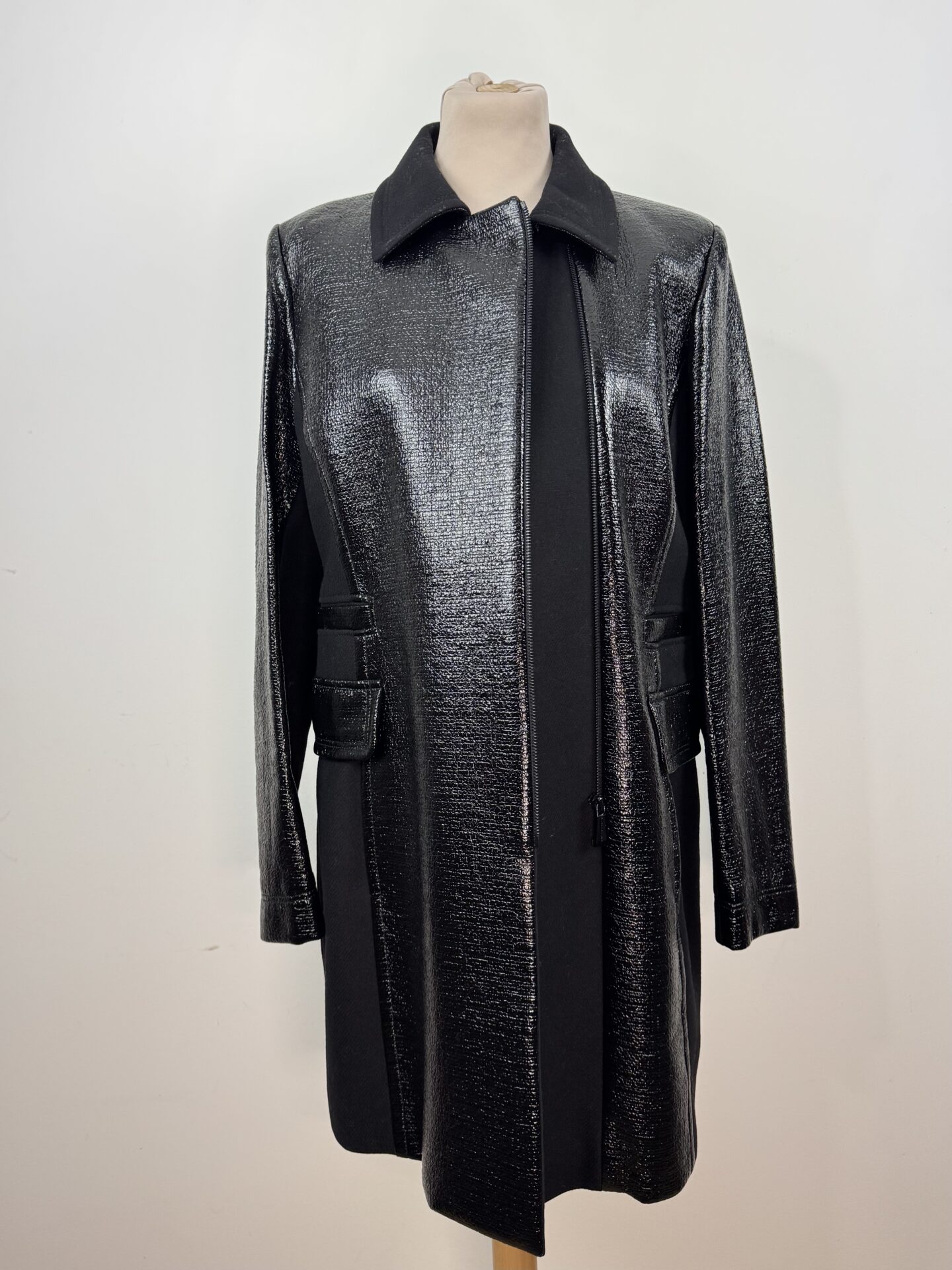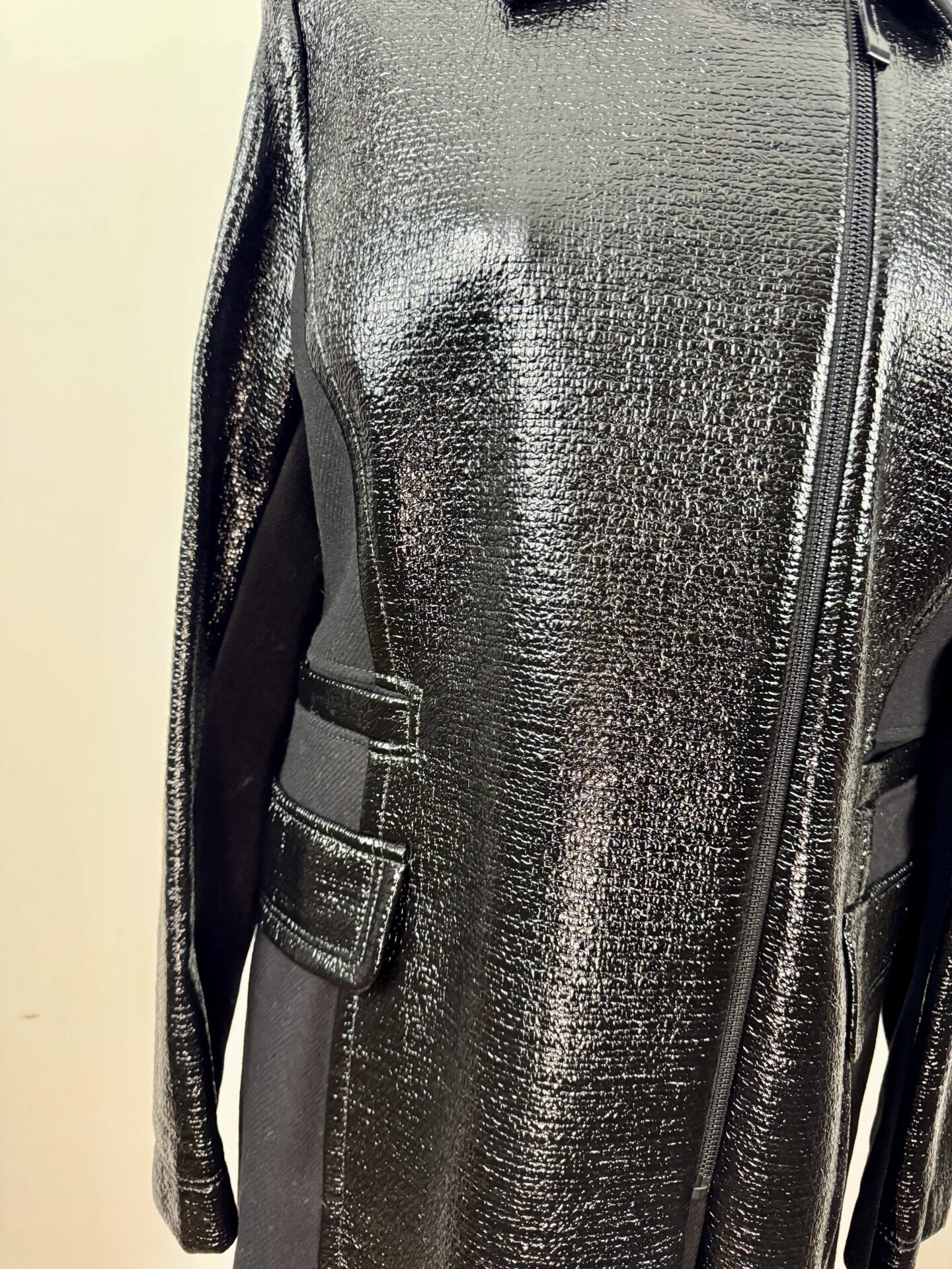 Un manteau chic et moderne signé Barbara Bui, mêlant laine noire et finition vernie texturée. Coupe droite, col classique et poches à rabat pour une allure élégante et affirmée.