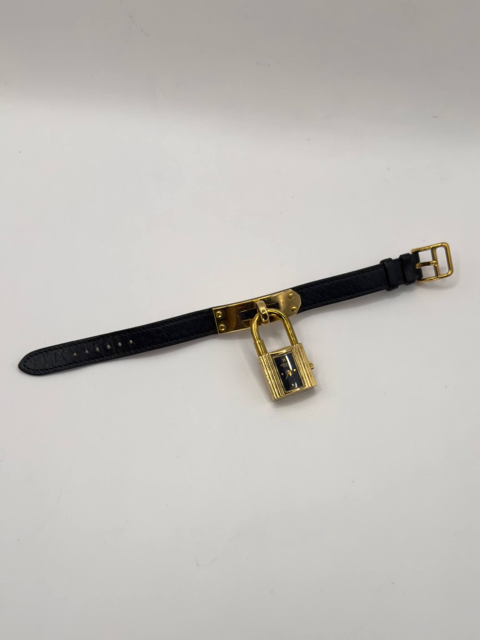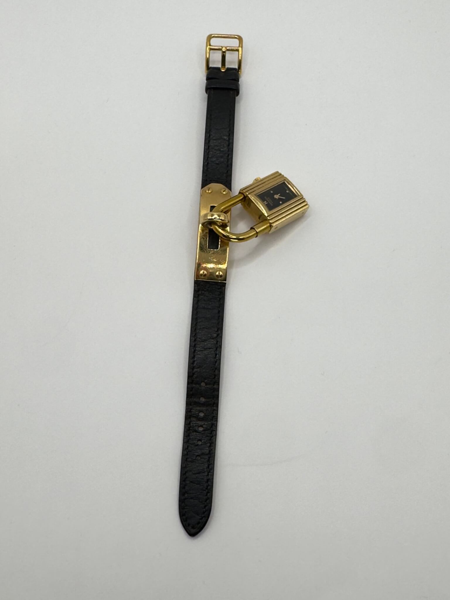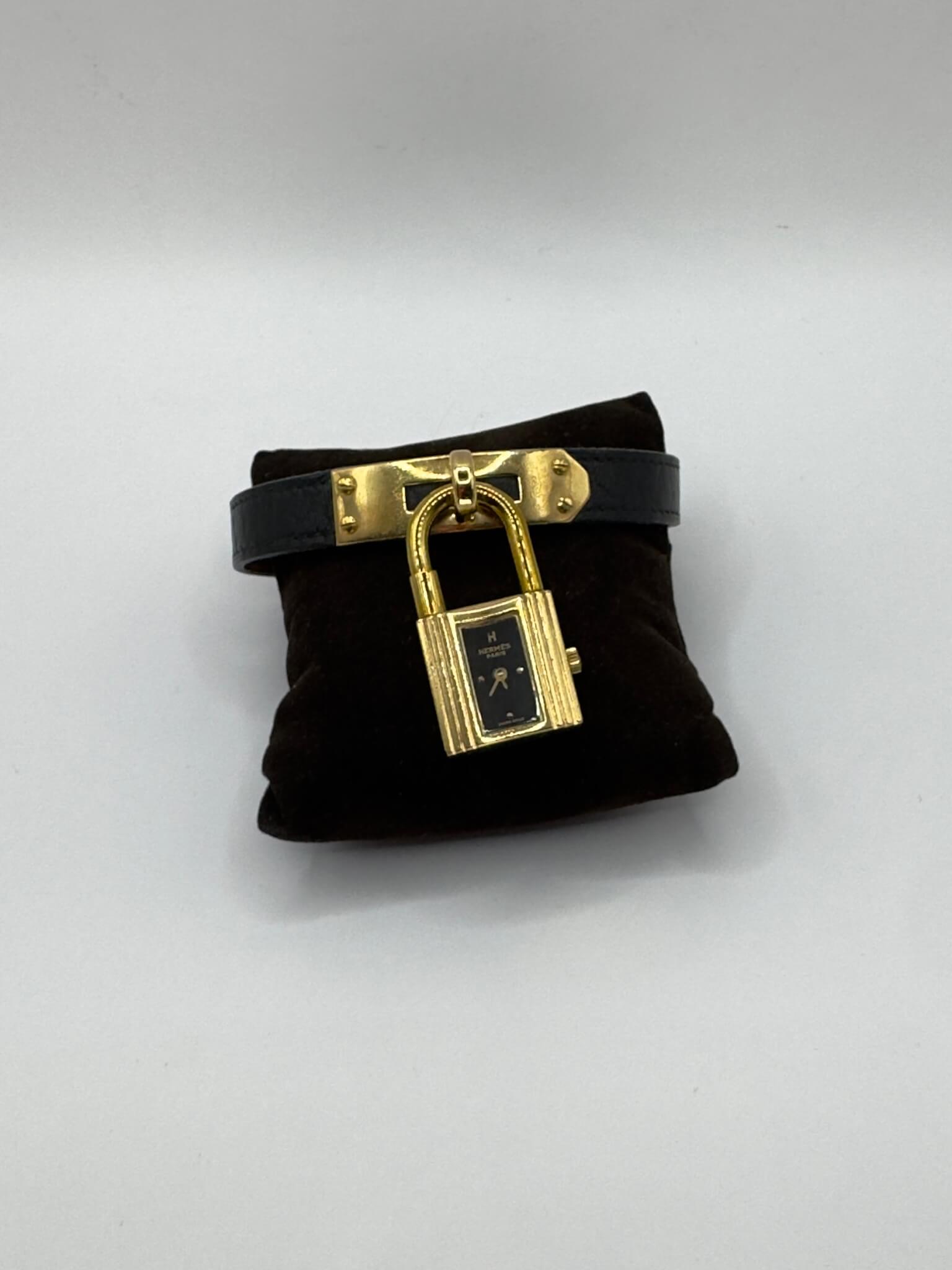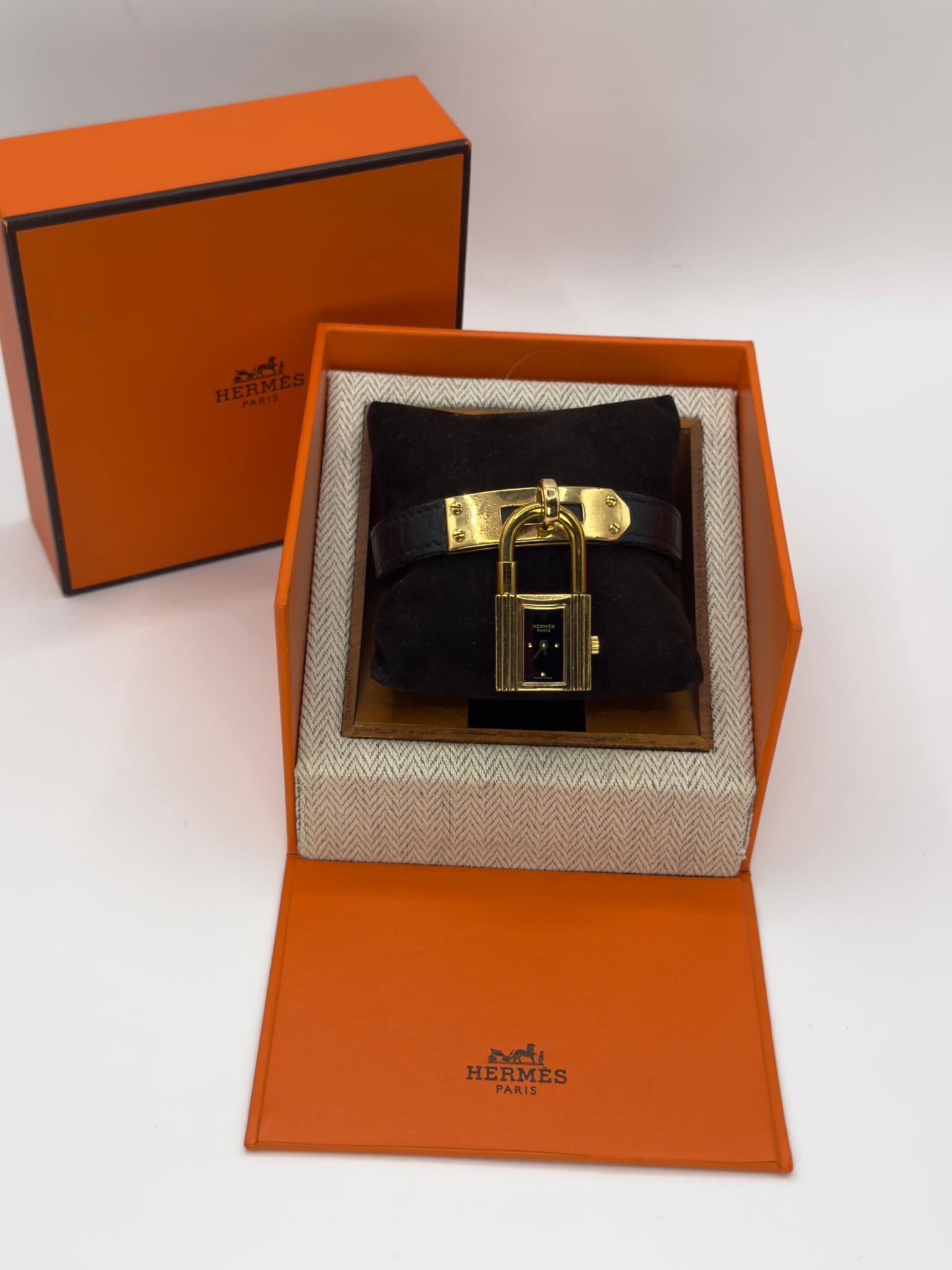 Montre Hermès – Kelly en full set, présentée avec sa boîte Hermès (le coussin n’est pas celui d’origine). La dorure du cadenas-montre est impeccable, fraîchement reprise, et le bracelet en cuir noir est en très bon état. Modèle équipé d’un fermoir à boucle ardillon et d’un cadran de 20 mm, symbole absolu de l’élégance Hermès. Une pièce iconique, intemporelle et parfaitement conservée.