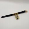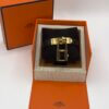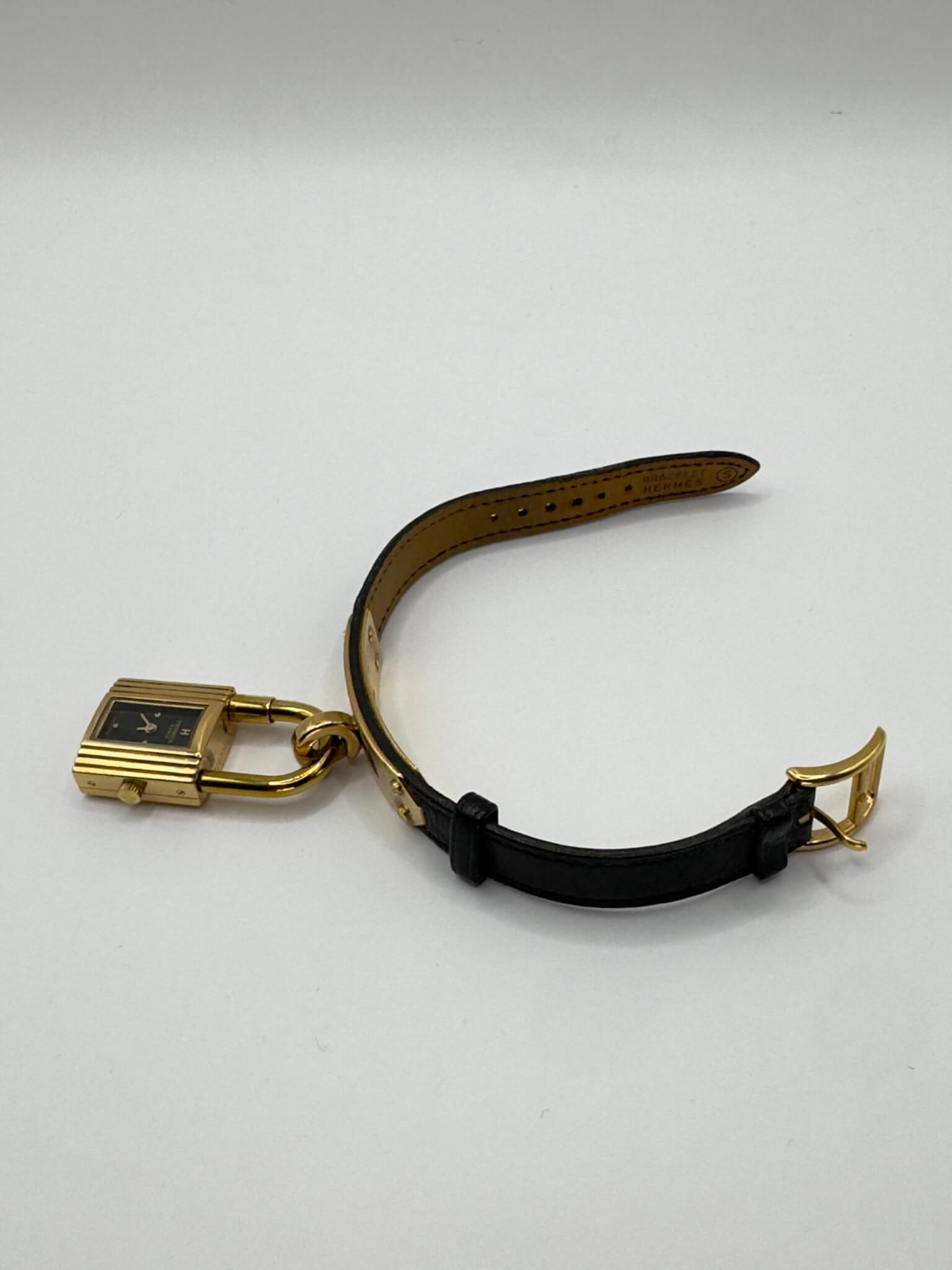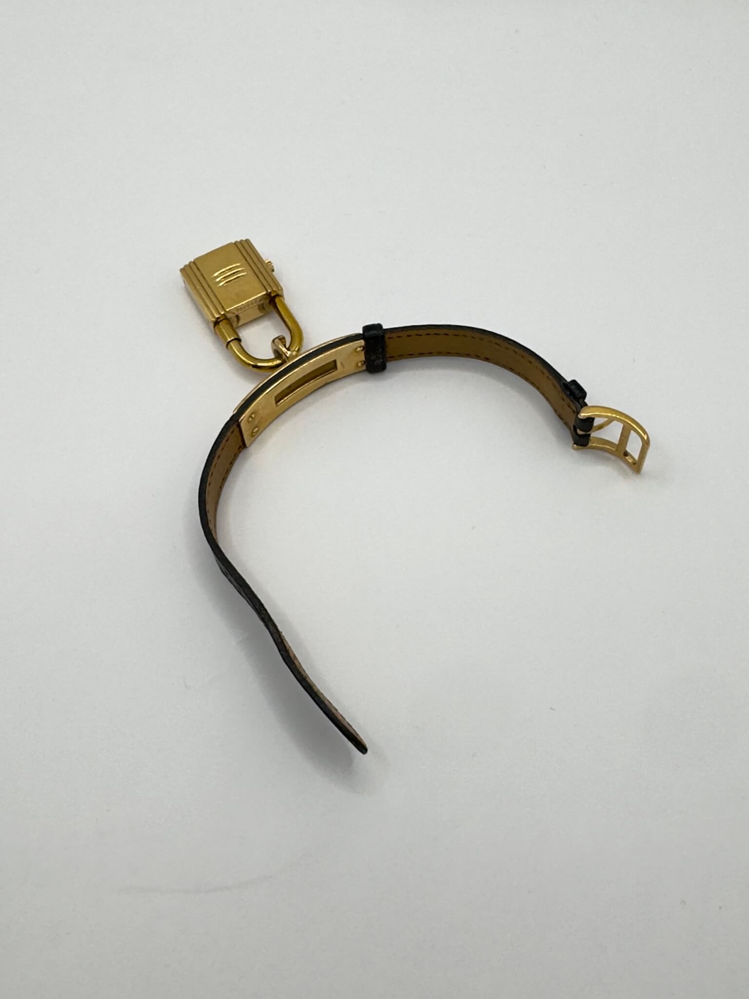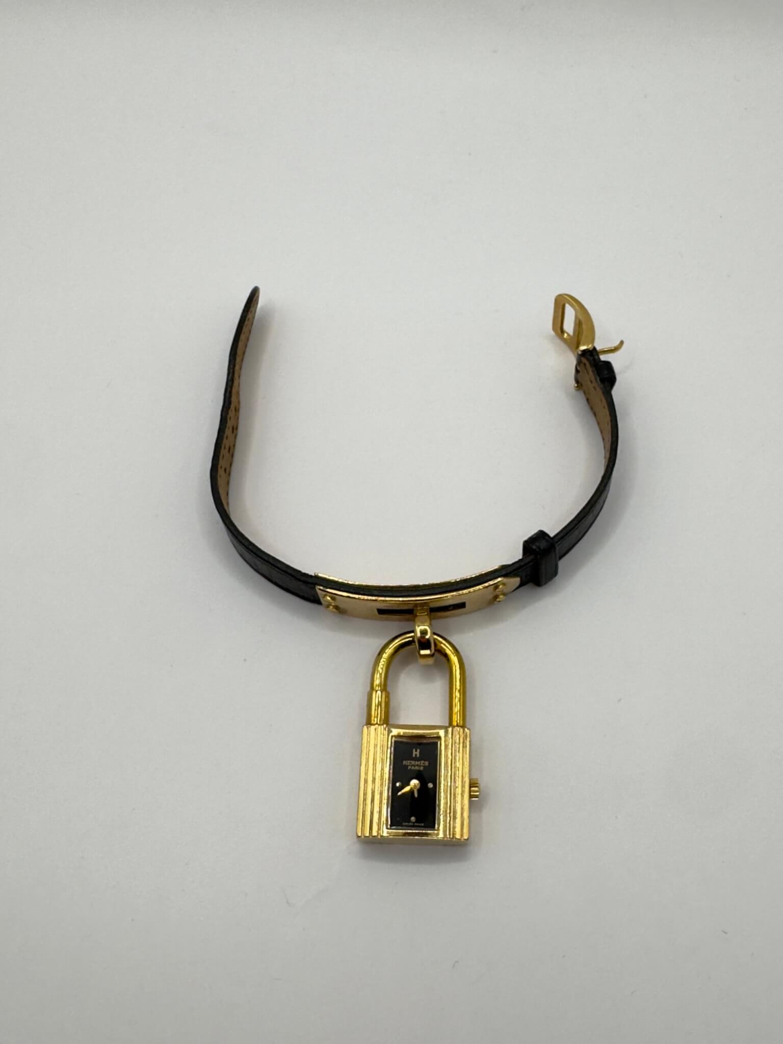 Montre Hermès – Kelly en full set, présentée avec sa boîte Hermès (le coussin n’est pas celui d’origine). La dorure du cadenas-montre est impeccable, fraîchement reprise, et le bracelet en cuir noir est en très bon état. Modèle équipé d’un fermoir à boucle ardillon et d’un cadran de 20 mm, symbole absolu de l’élégance Hermès. Une pièce iconique, intemporelle et parfaitement conservée.