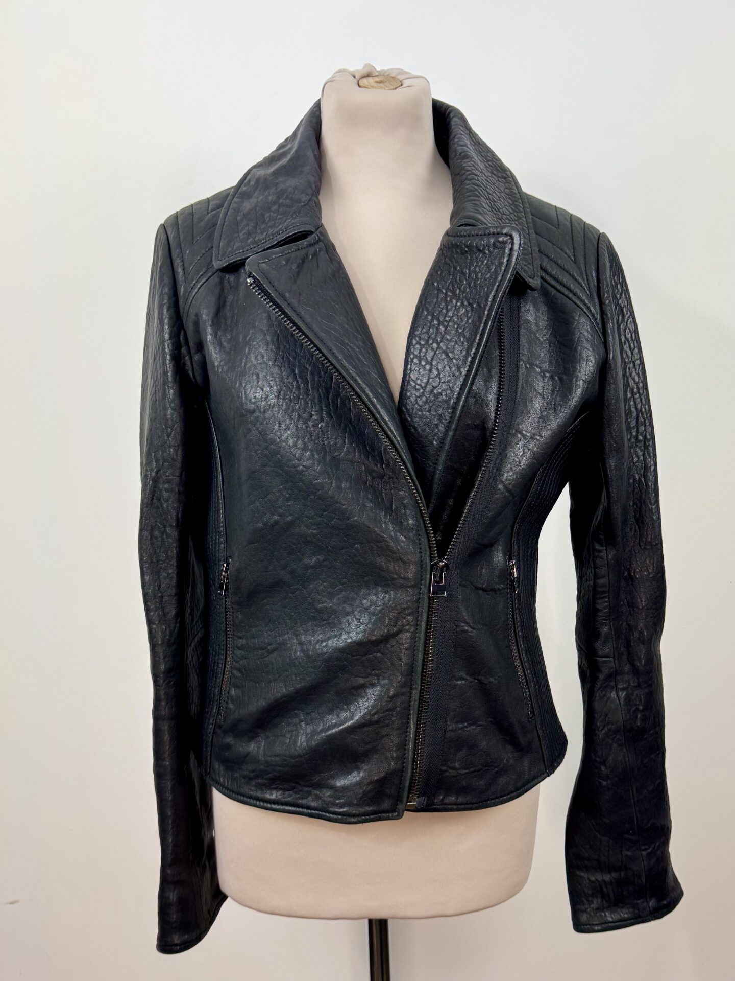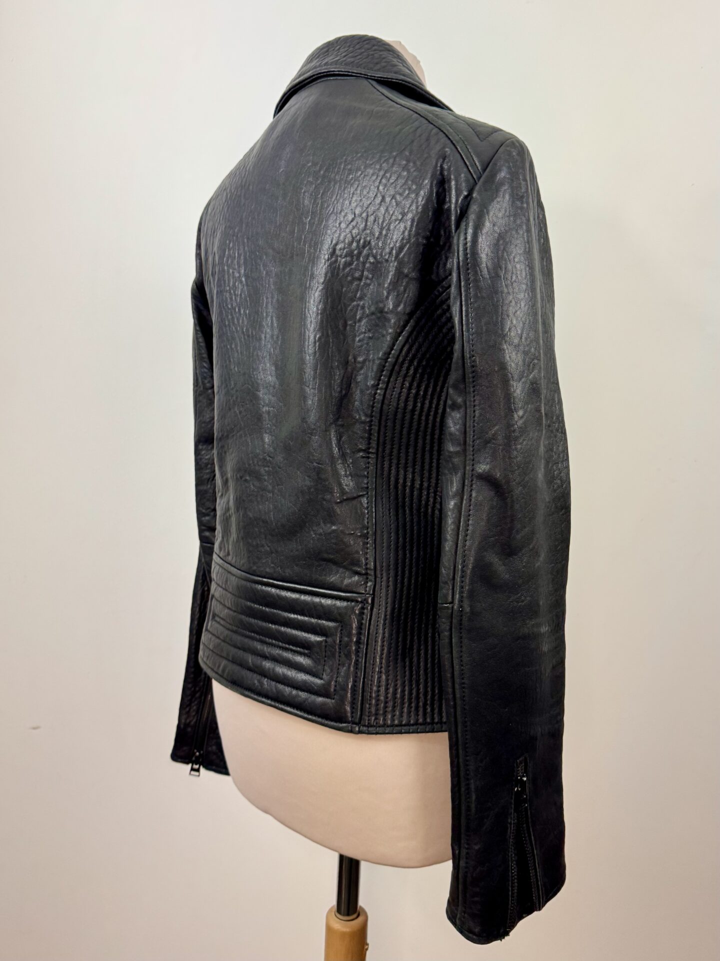 Ce blouson en cuir à l’aspect texturé revisite l’iconique perfecto avec un style contemporain. Doté d’un large col cranté, de coutures structurantes et d’une fermeture zippée asymétrique, il apporte caractère et allure à toutes vos tenues.