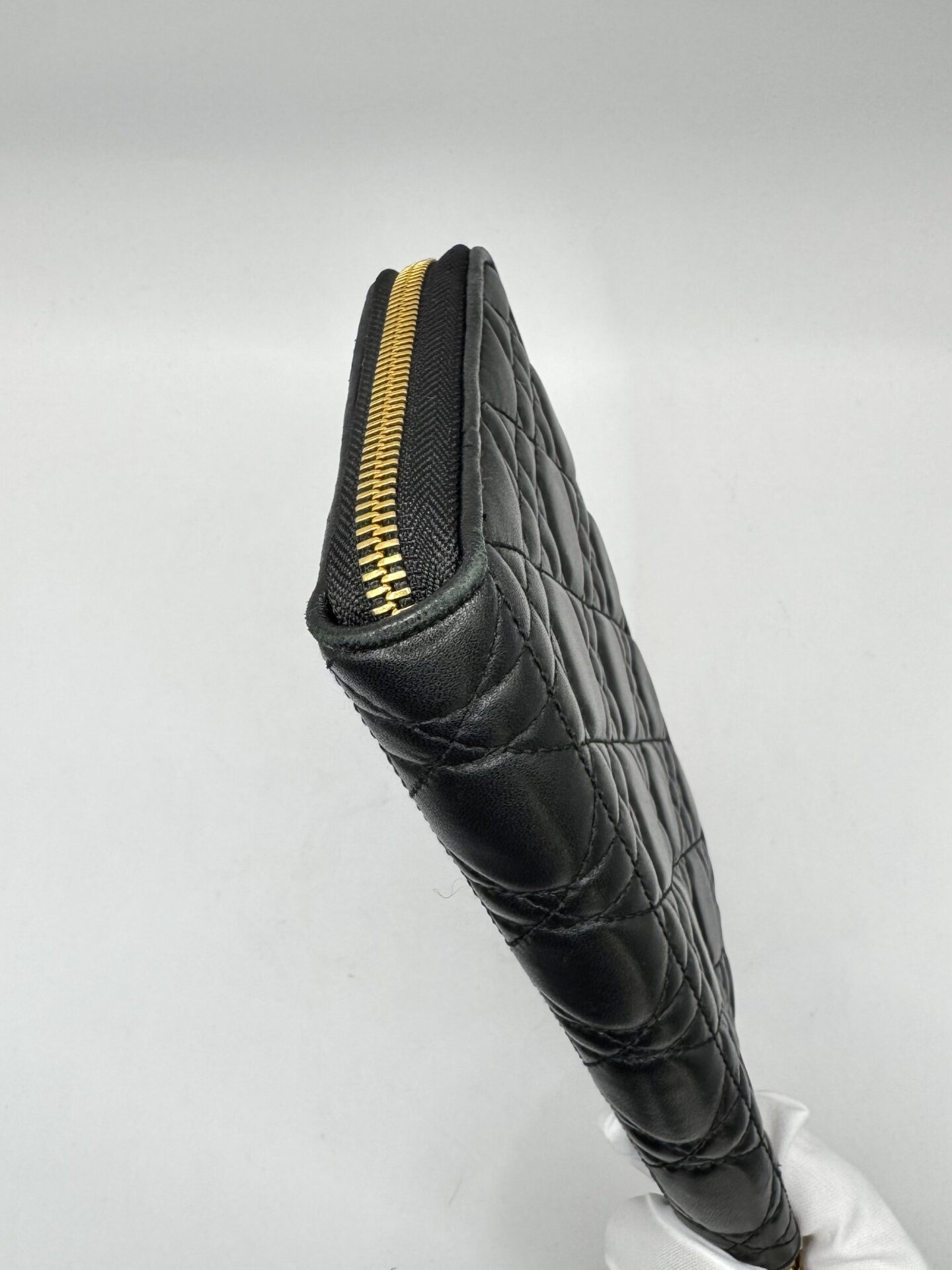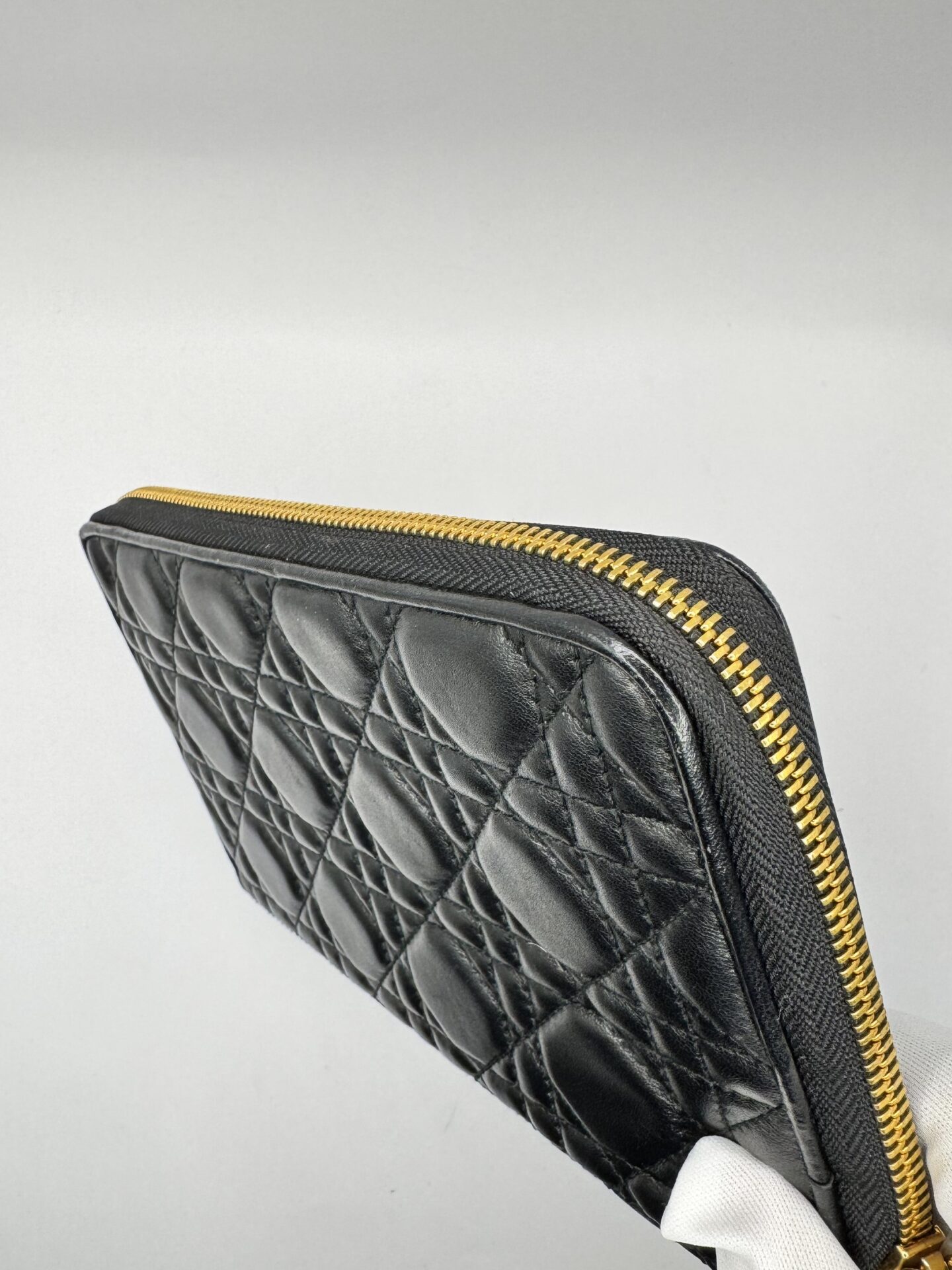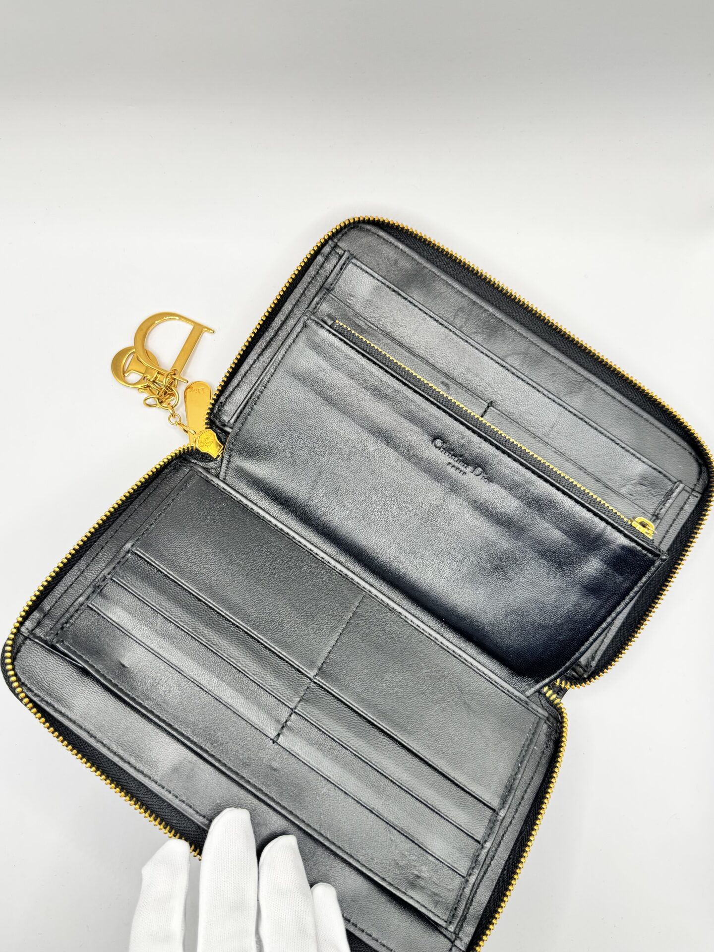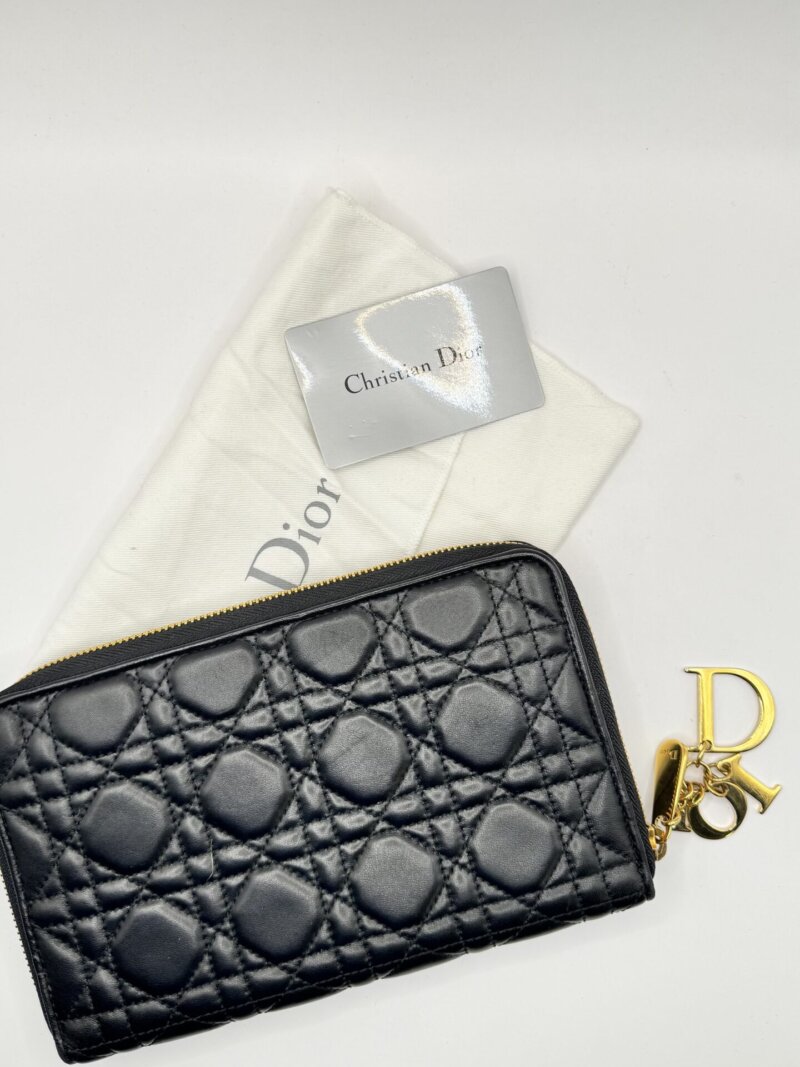 Ce modèle emblématique de la Maison Dior est réalisé en cuir noir matelassé Cannage et sublimé par les charms dorés « D.I.O.R. ». Pratique grâce à sa fermeture zippée, il offre de multiples compartiments pour organiser cartes, billets et pièces. Proposé avec son dustbag et sa carte, il est en très bon état, porté une seule fois. Le Lady Dior Voyageur allie élégance intemporelle et fonctionnalité au quotidien.