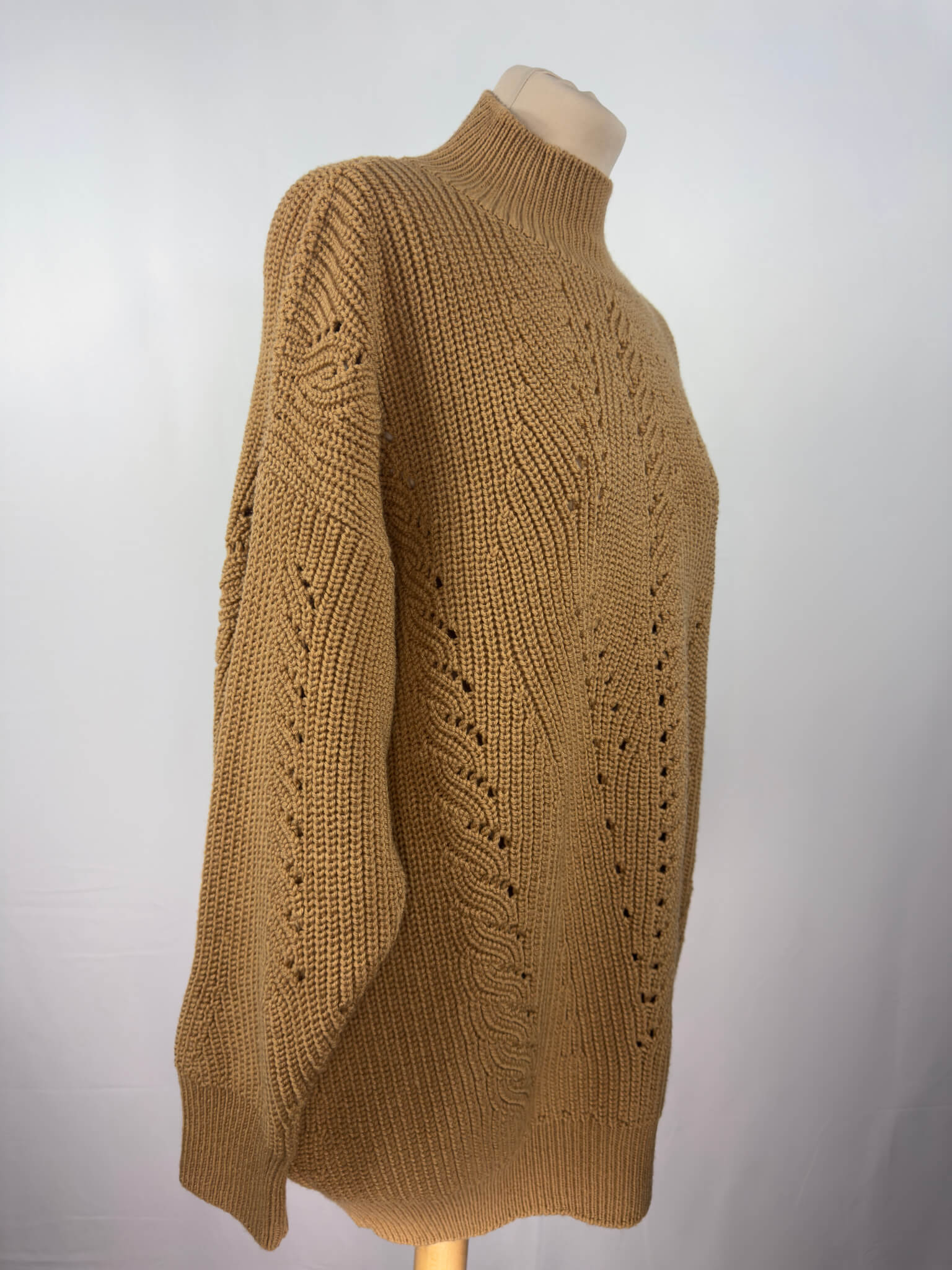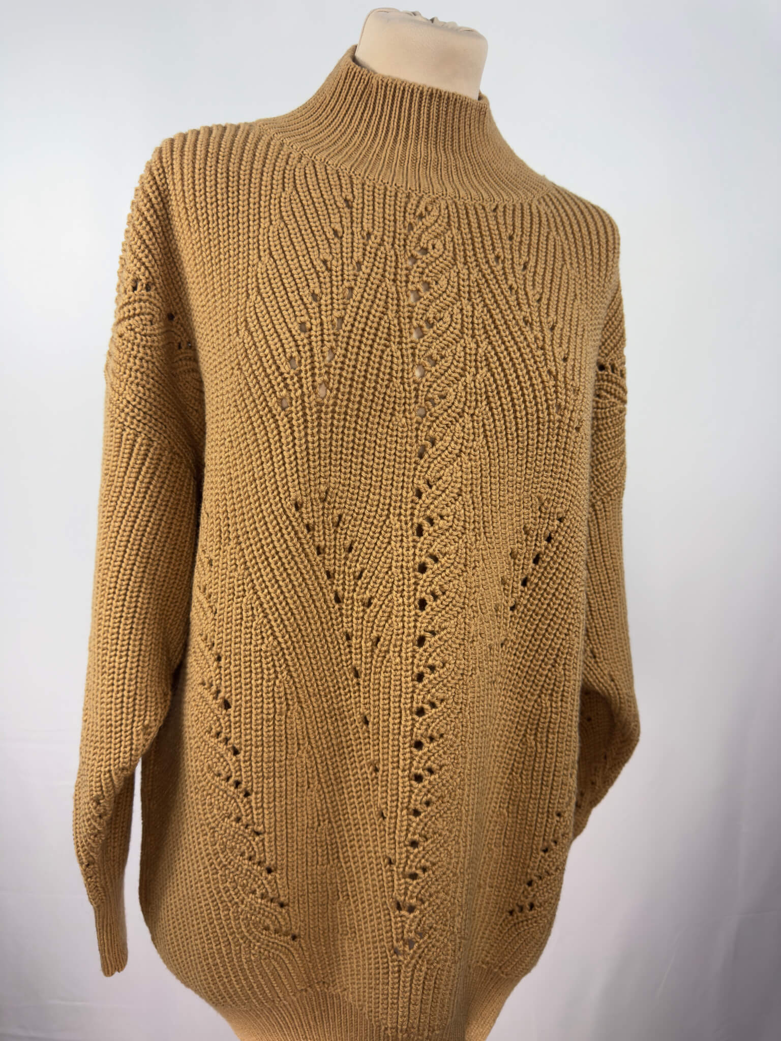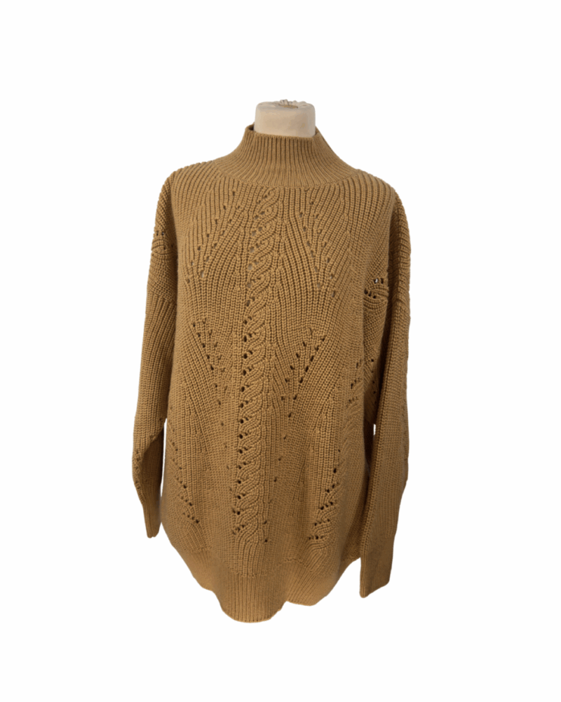Maille épaisse à motifs ajourés et torsades, très élégante.