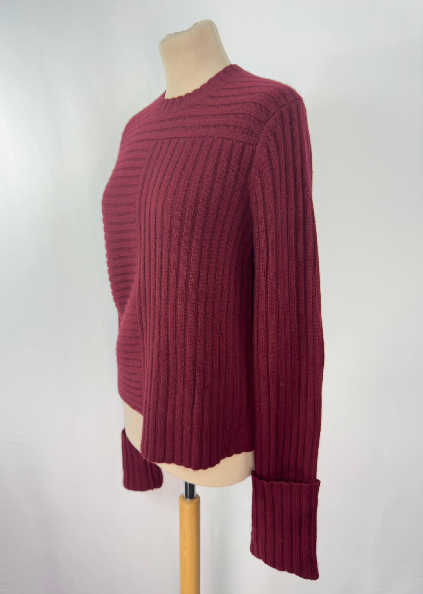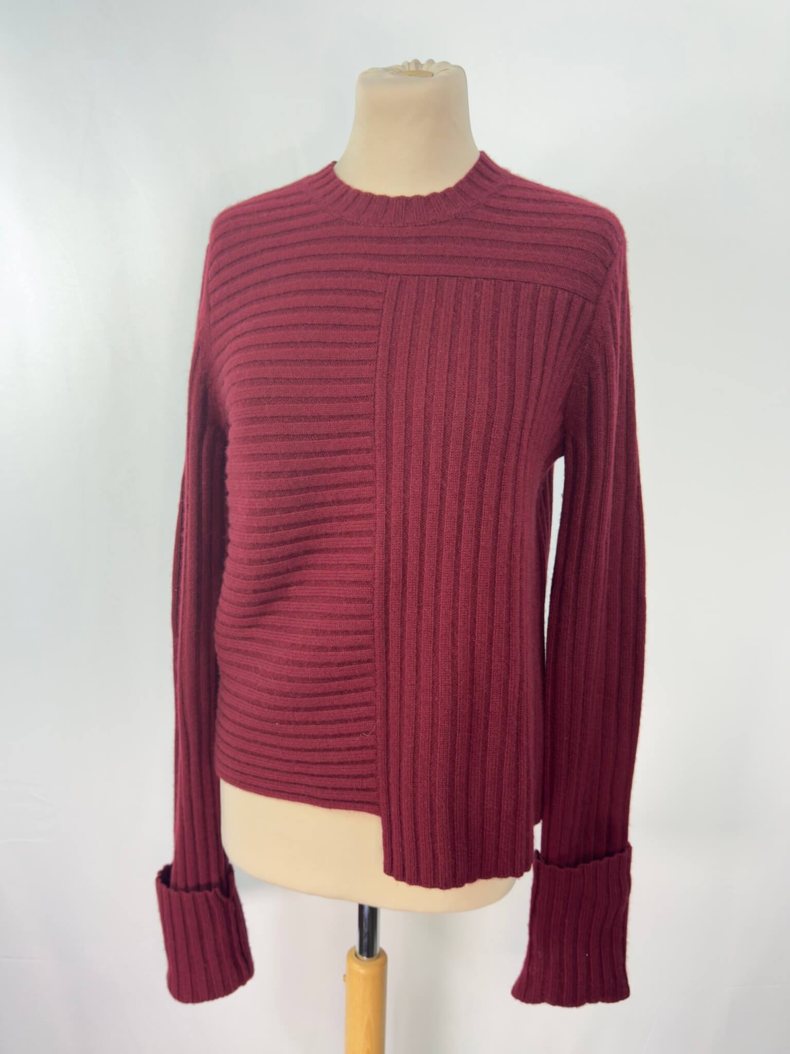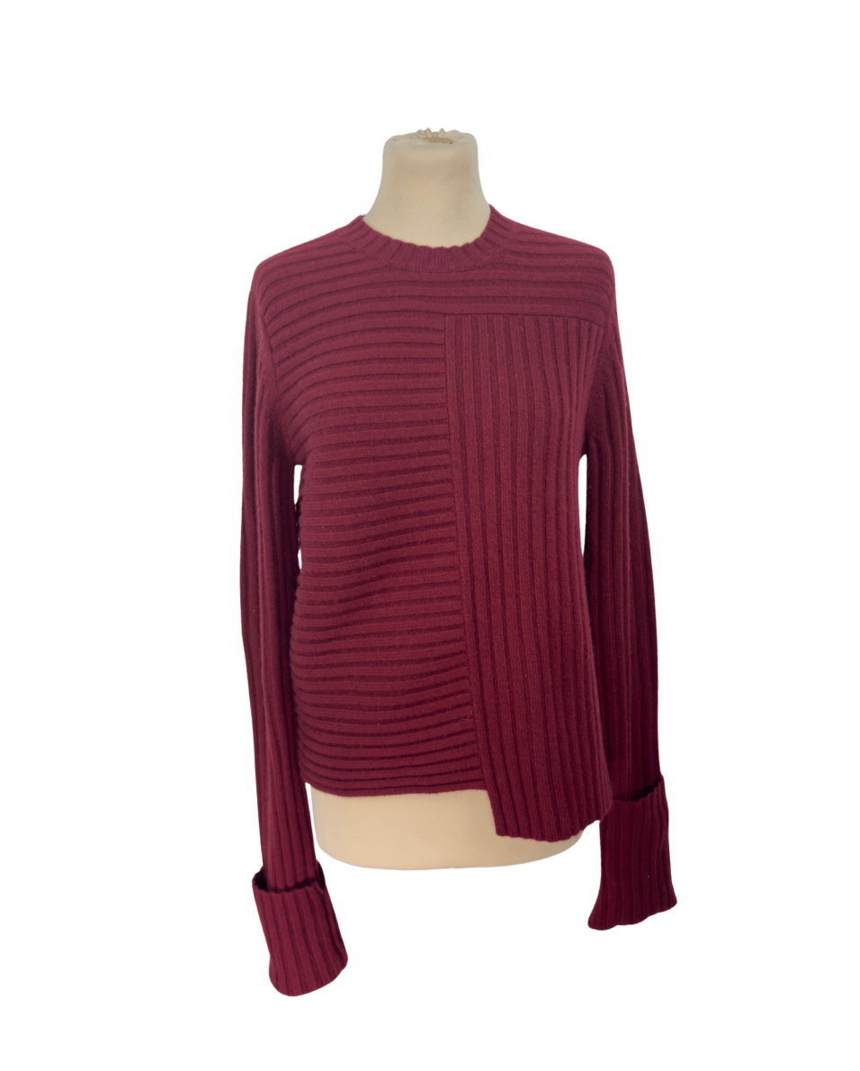 Pull Celine en maille bordeaux, coupe asymetrique élégante.