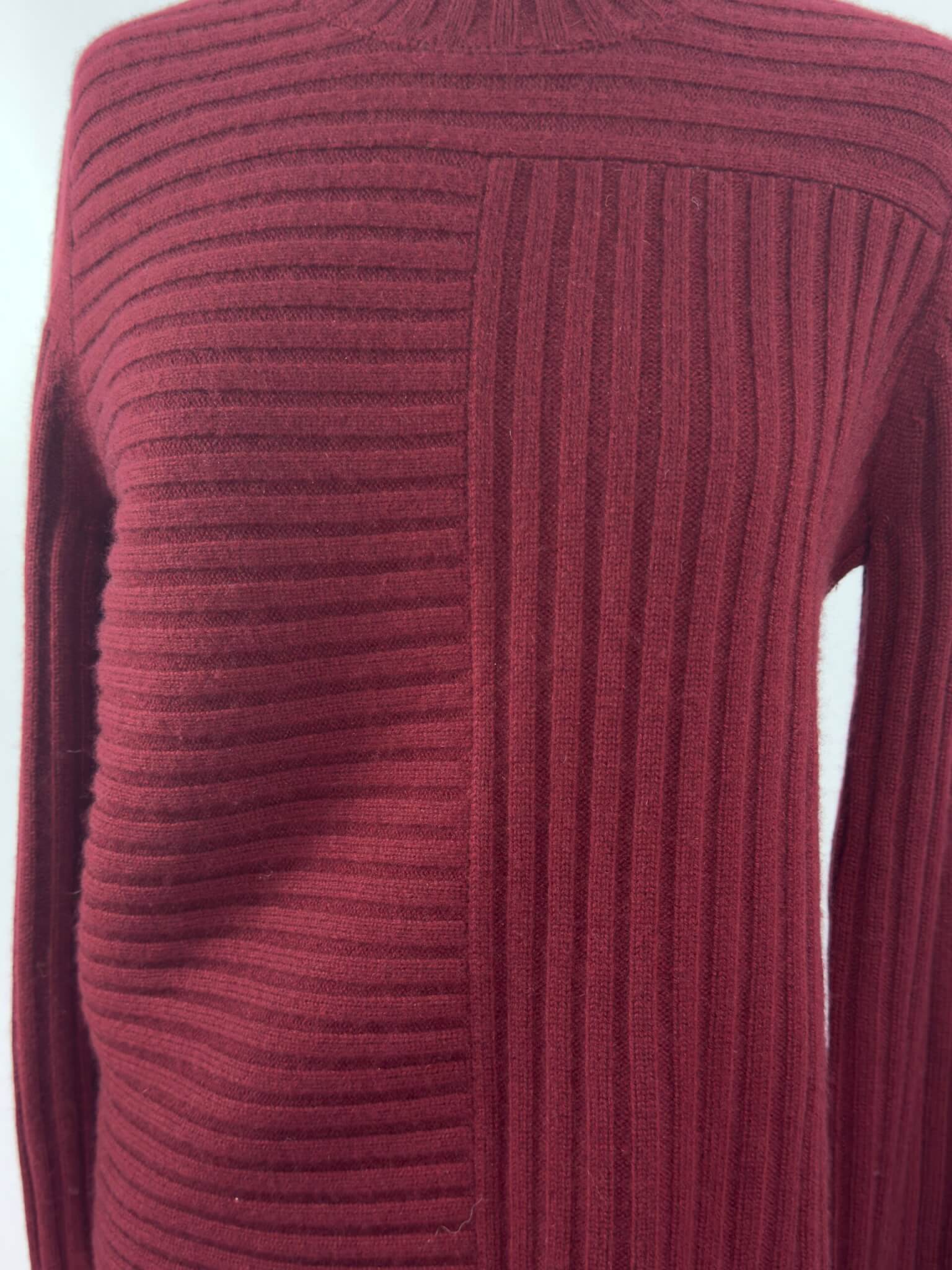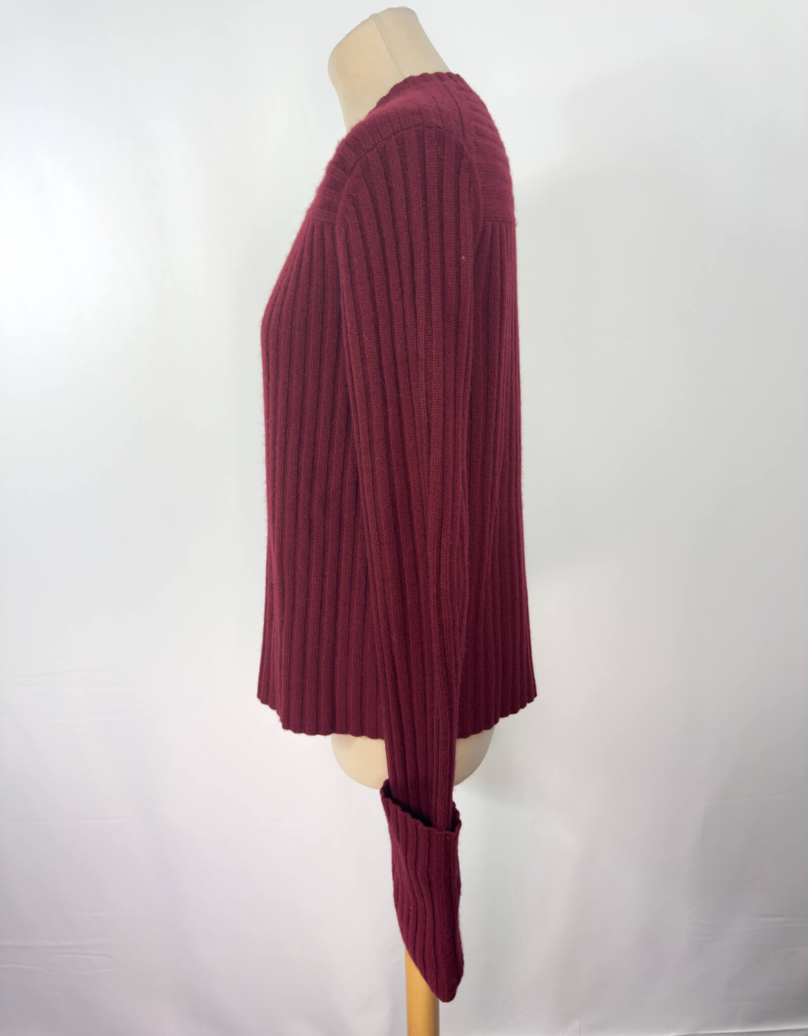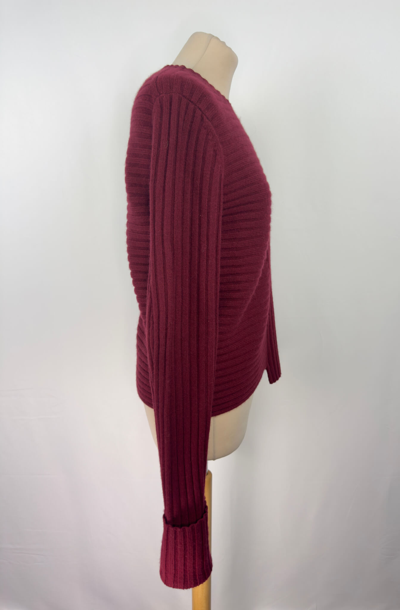 Pull Celine en maille bordeaux, coupe asymetrique élégante.