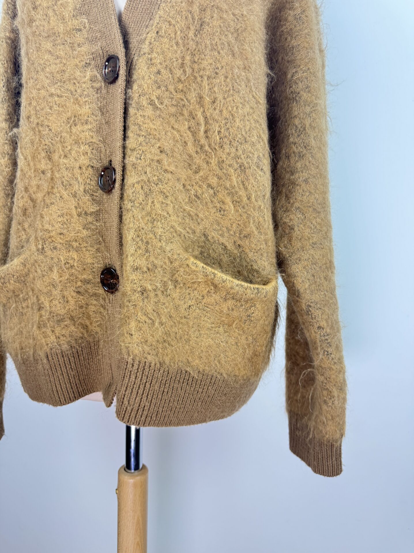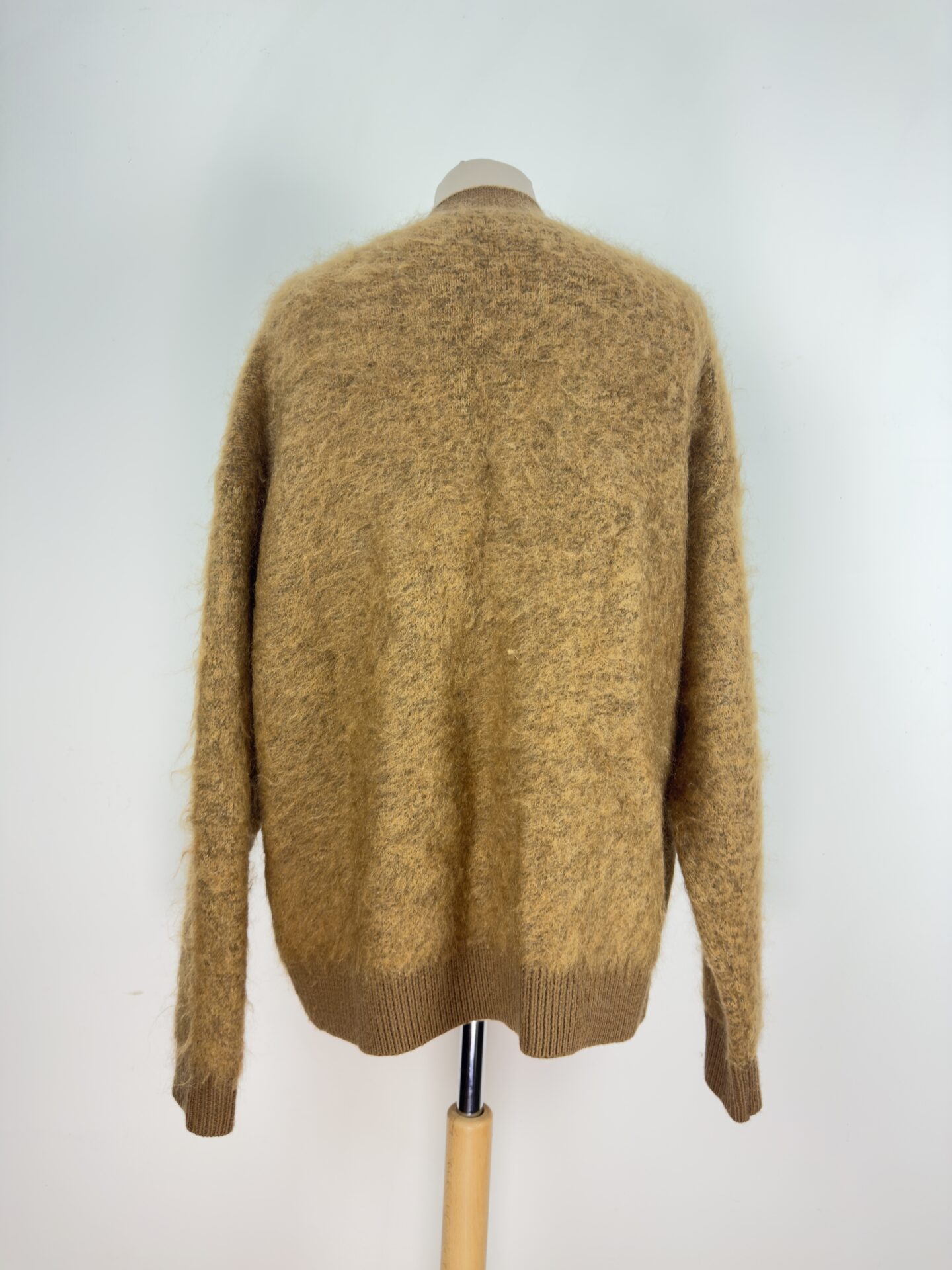 Gilet Acne Studios en maille camel, composé de 32 % mohair et 32 % laine. Sa texture douce et vaporeuse lui donne un volume élégant et un tombé naturel. Boutonné sur le devant et doté de poches plaquées, il allie confort et modernité dans l’esprit minimaliste de la maison scandinave.
