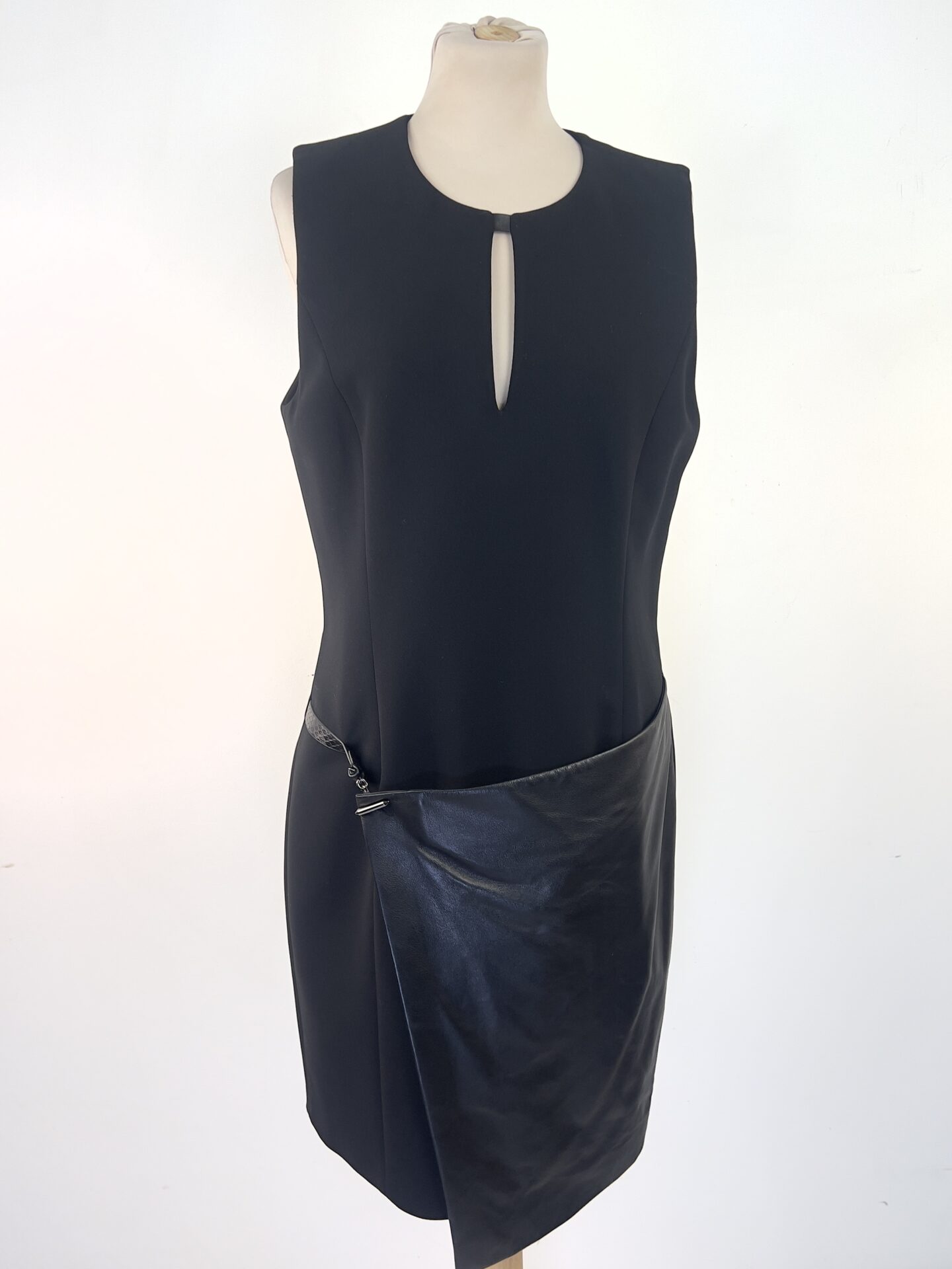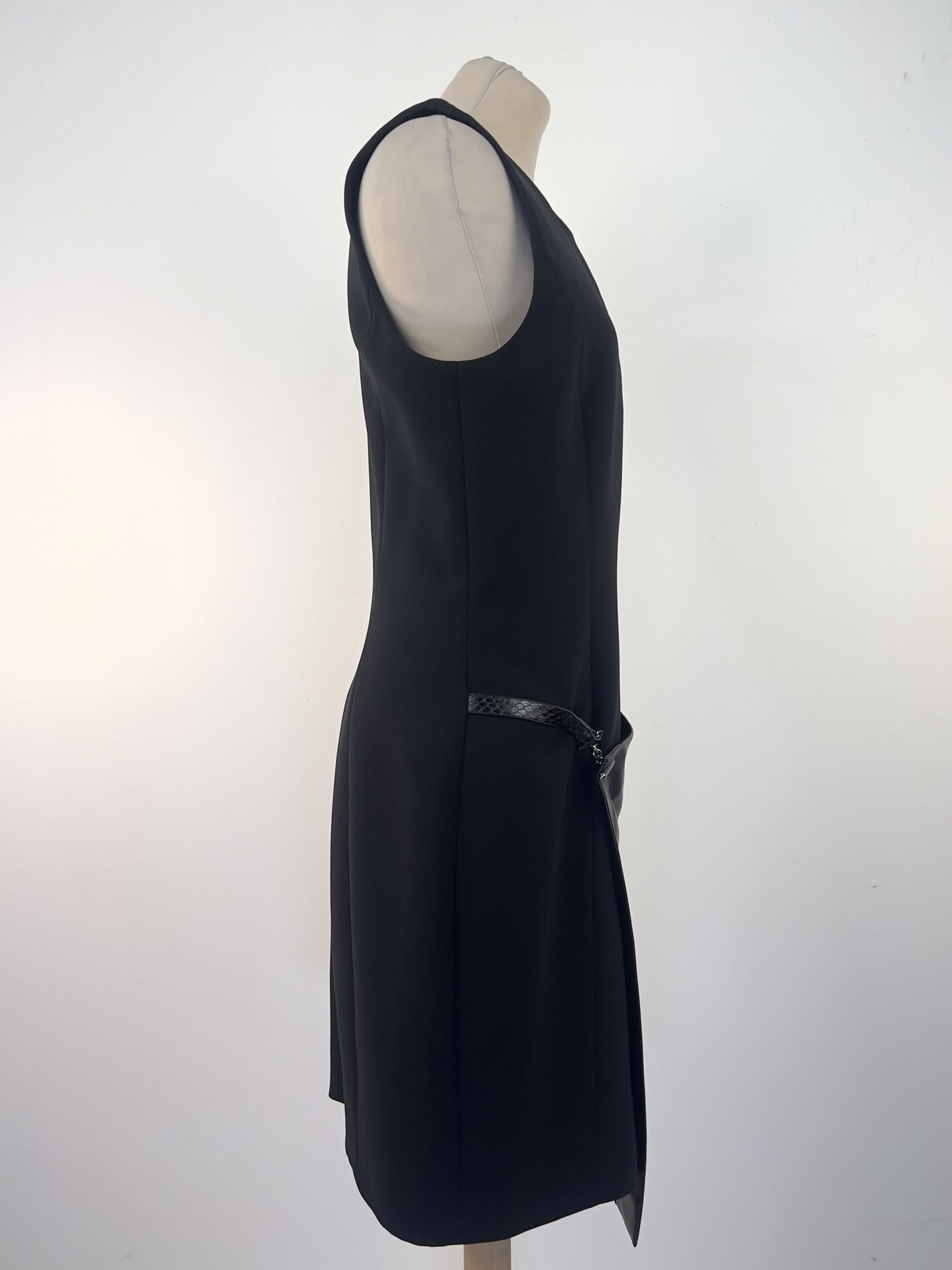 Robe noire Barbara Bui sans manches. Ce modèle élégant présente une encolure ronde avec une petite fente discrète sur le devant. La coupe droite est modernisée par un empiècement en cuir façon tablier (100% agneau), fixé à la taille, qui apporte une touche contemporaine et audacieuse.