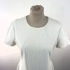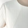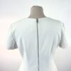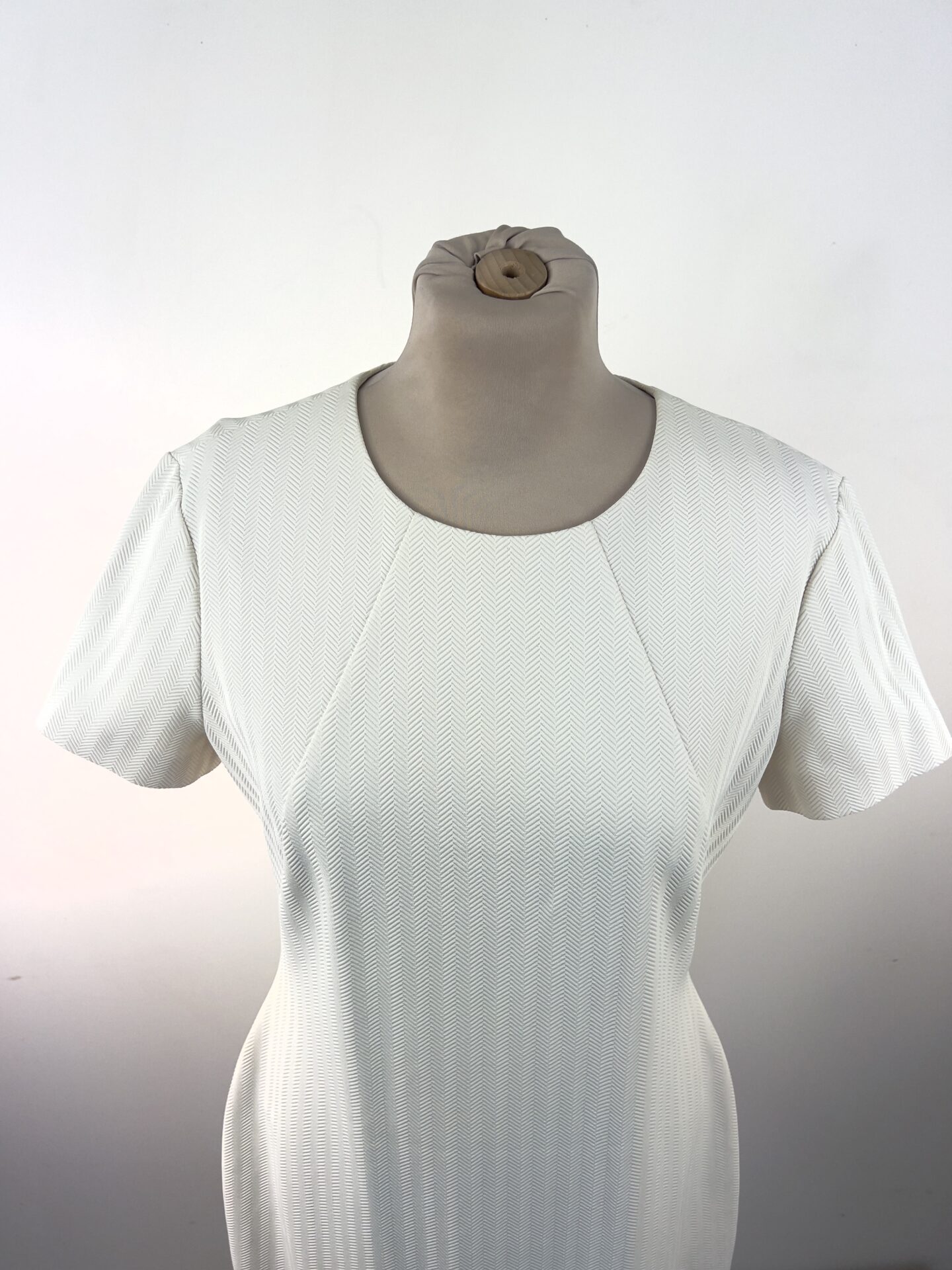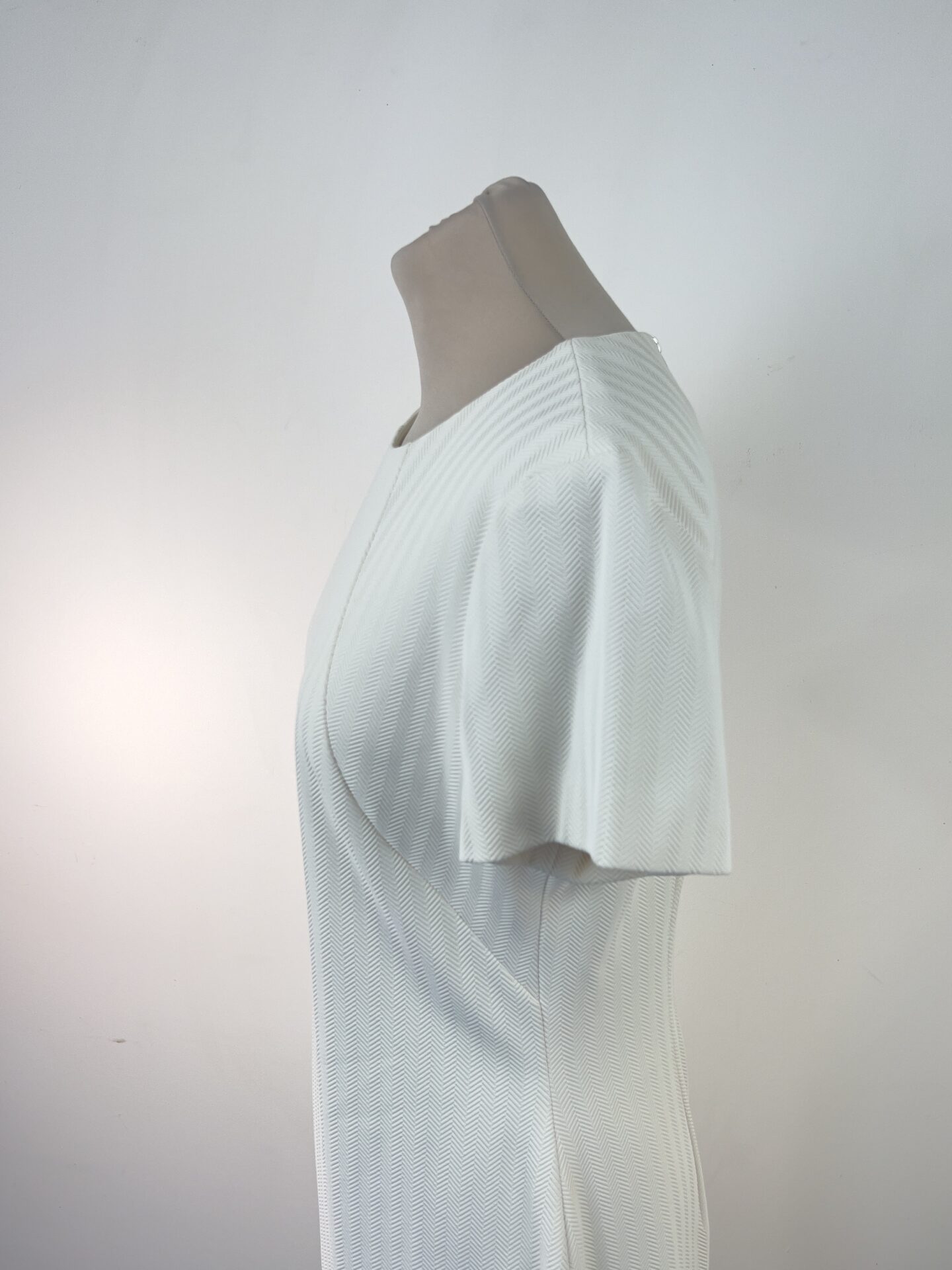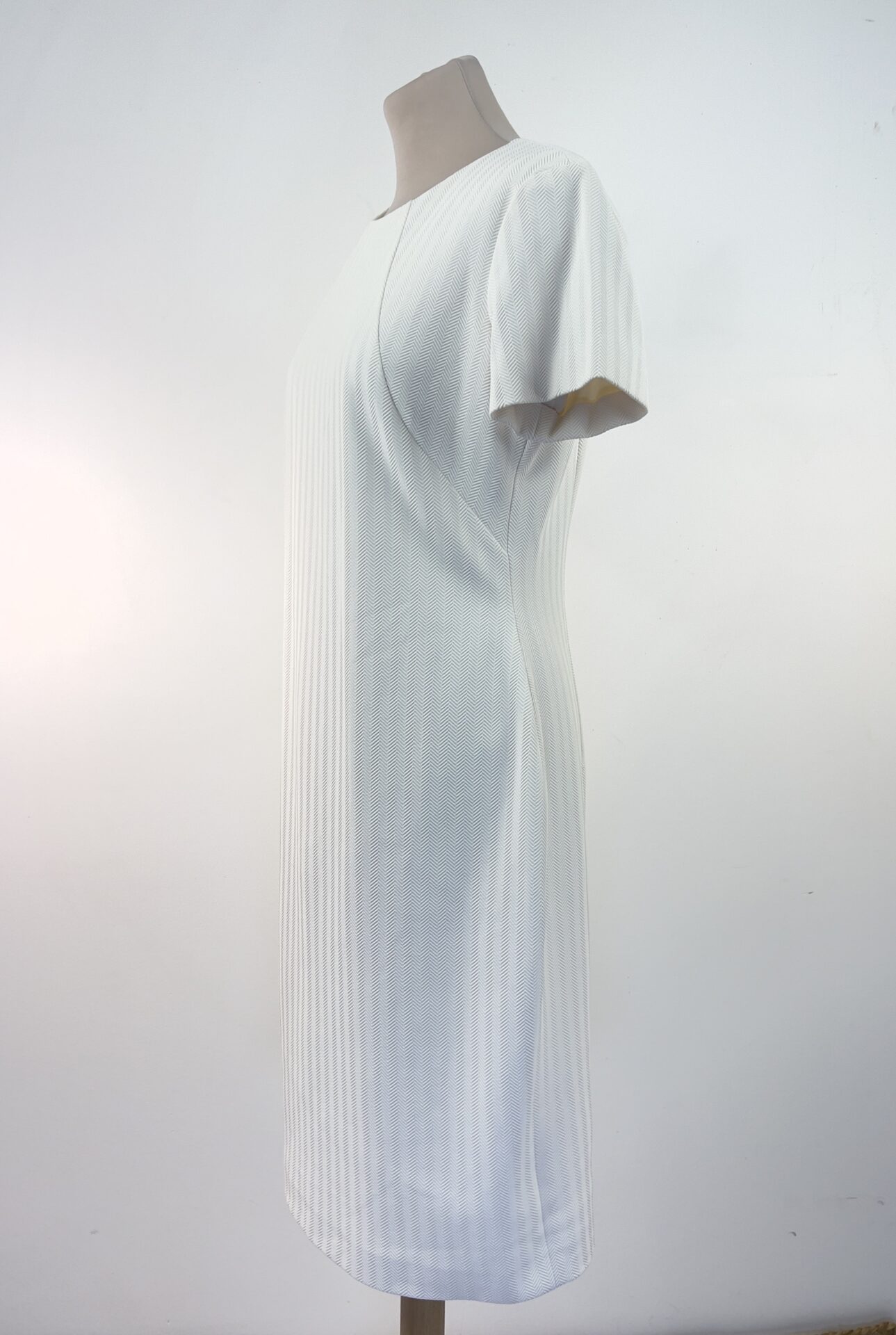 Robe Hugo Boss en tissu ivoire à motif chevron discret. Ce modèle à manches courtes présente une coupe droite et ajustée qui souligne la silhouette tout en restant élégante. Le col rond et les lignes épurées apportent une allure moderne et sophistiquée.